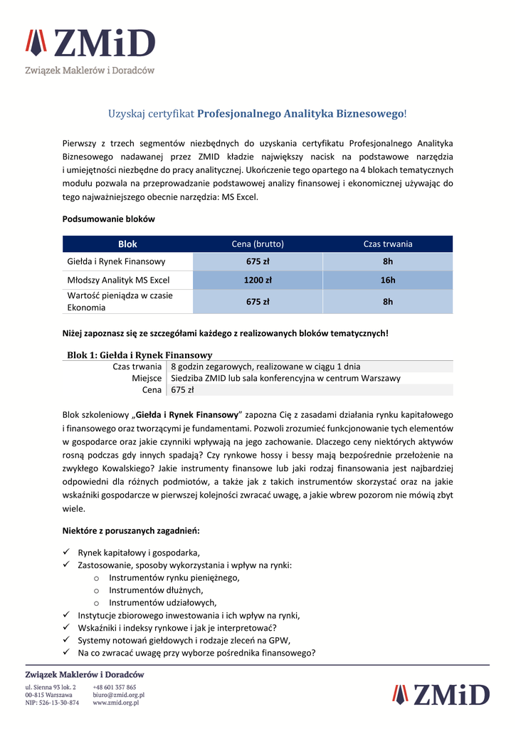 Uzyskaj certyfikat Profesjonalnego Analityka Biznesowego! Pierwszy z trzech segmentów niezbędnych do uzyskania certyfikatu Profesjonalnego Analityka Biznesowego nadawanej przez ZMID kładzie największy nacisk na podstawowe narzędzia i umiejętności niezbędne do pracy analitycznej. Ukończenie tego opartego na 4 blokach tematycznych modułu pozwala na przeprowadzanie podstawowej analizy finansowej i ekonomicznej używając do tego najważniejszego obecnie narzędzia: MS Excel. Podsumowanie bloków Blok Cena (brutto) Czas trwania Giełda i Rynek Finansowy 675 zł 8h Młodszy Analityk MS Excel 1200 zł 16h Wartość pieniądza w czasie Ekonomia 675 zł 8h Niżej zapoznasz się ze szczegółami każdego z realizowanych bloków tematycznych! Blok 1: Giełda i Rynek Finansowy Czas trwania 8 godzin zegarowych, realizowane w ciągu 1 dnia Miejsce Siedziba ZMID lub sala konferencyjna w centrum Warszawy Cena 675 zł Blok szkoleniowy „Giełda i Rynek Finansowy” zapozna Cię z zasadami działania rynku kapitałowego i finansowego oraz tworzącymi je fundamentami. Pozwoli zrozumieć funkcjonowanie tych elementów w gospodarce oraz jakie czynniki wpływają na jego zachowanie. Dlaczego ceny niektórych aktywów rosną podczas gdy innych spadają? Czy rynkowe hossy i bessy mają bezpośrednie przełożenie na zwykłego Kowalskiego? Jakie instrumenty finansowe lub jaki rodzaj finansowania jest najbardziej odpowiedni dla różnych podmiotów, a także jak z takich instrumentów skorzystać oraz na jakie wskaźniki gospodarcze w pierwszej kolejności zwracać uwagę, a jakie wbrew pozorom nie mówią zbyt wiele. Niektóre z poruszanych zagadnień: Rynek kapitałowy i gospodarka, Zastosowanie, sposoby wykorzystania i wpływ na rynki: o Instrumentów rynku pieniężnego, o Instrumentów dłużnych, o Instrumentów udziałowych, Instytucje zbiorowego inwestowania i ich wpływ na rynki, Wskaźniki i indeksy rynkowe i jak je interpretować? Systemy notowań giełdowych i rodzaje zleceń na GPW, Na co zwracać uwagę przy wyborze pośrednika finansowego? Blok 2: Podstawy analizy finansowej w MS Excel (Młodszy Analityk MS Excel) Czas trwania 16 godzin zegarowych, realizowane w ciągu 2 dni Miejsce Siedziba ZMID lub sala konferencyjna w centrum Warszawy Cena 1200 zł Blok szkoleniowy „Podstawy analizy w MS Excel” to praktyczne zajęcia z najważniejszym w analitycznej pracy narzędziem. Rozwijając umiejętności z zakresu tworzenia, operowania i analizy dużych baz danych, które są niezbędne dla wszystkich zatrudnionych w działach analiz, działach sprzedaży, firmach produkcyjnych czy instytucjach finansowych. Niektóre z poruszanych zagadnień: Gdzie szukać danych i jak sprawdzać ich wiarygodność? Najczęstsze błędy analityczne oraz metody ich wyszukiwania i unikania Dobre praktyki wizualizacji danych oraz rozpoznawanie manipulacji w prezentacji Różne wskaźniki oceny efektywności, które mają zastosowanie w finansach, produkcji czy logistyce Wpływ zmiany wartości pieniądza w czasie na decyzje w firmie Opłacalność zaciągania kredytów i innych zobowiązań w firmie Sposoby oceny projektów gospodarczych w firmie Podstawy analizy ryzyka w ocenie projektów Funkcjonalności MS Excel: o Funkcje logiczne, o Funkcje finansowe, o Narzędzia analizy warunkowej , o Narzędzie „Tekst jako kolumny”, o Dodatek solver, o Funkcje „Wyszukaj pionowo”, „Indeks”, „Podaj.pozycję”, o Podstawy i nagrywanie makr, o Tabele oraz wykresy przestawne, o Narzędzie „Formatowanie warunkowe”, o Ochrona danych, o Narzędzie „Poprawność danych”. Blok 3 i 4: Wartość pieniądza w czasie i ekonomia Czas trwania 8 godzin zegarowych, realizowane w ciągu 1 dnia Miejsce Siedziba ZMID lub sala konferencyjna w centrum Warszawy Cena 675 zł Bloki szkoleniowe „Wartość pieniądze w czasie i ekonomia” to praktyczny aspekt oszczędzania i inwestowania. Ile naprawdę warte są pieniądze lub dana inwestycja oraz jak ich wartość zmienia się pod wpływem rynkowych wydarzeń. Jakie są najważniejsze elementy tworzące współczesną gospodarkę oraz jakie są wzajemne zależności pomiędzy nimi i co je kształtuje. Czy zerowe bezrobocie to naprawdę coś do czego powinniśmy dążyć? Czy deflacja jest lepsza od inflacji? Niektóre z poruszanych zagadnień: Dyskontowanie i kapitalizowanie – wartość bieżąca, a wartość przyszła, Rzeczywiste i efektywne stopy procentowe, Regularne przepływy pieniężne – renty, Elementy procesów gospodarczych i ich zależności: o Polityka fiskalna i monetarna oraz ich wpływ na Twoje pieniądze, o Bezrobocie, o Inflacja vs deflacja, o Kursy walutowe, o Podatki. Osoby, które ukończą szkolenie ze wszystkich 4 bloków mają możliwość przystąpić do egzaminu końcowego (bezpłatnie) sprawdzającego umiejętności. Egzamin realizowany jest na komputerze i ma formę otwartych do opracowania zagadnień. Czas egzaminu to 2h. W przypadku pozytywnego wyniku, przystępujący do egzaminu otrzymuje certyfikat Analityka Biznesowego I stopnia nadawany przez Związek Maklerów i Doradców oraz ma prawo do ubiegania się o członkostwo w Związku. Blok realizowany we współpracy z 1 Giełda i Rynek Finansowy Podstawy analizy finansowej w MS Excel 2 Ekonomia 4 Analityk Biznesowy I stopnia 3 Wartość pieniądza w czasie