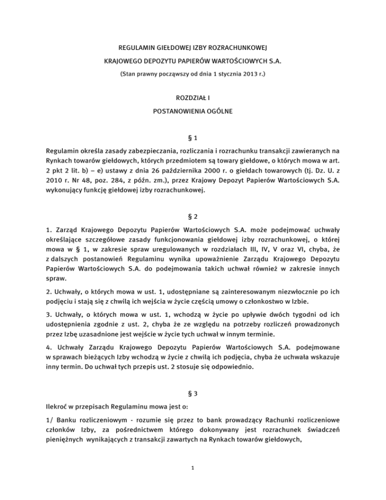 REGULAMIN GIEŁDOWEJ IZBY ROZRACHUNKOWEJ KRAJOWEGO DEPOZYTU PAPIERÓW WARTOŚCIOWYCH S.A. (Stan prawny począwszy od dnia 1 stycznia 2013 r.) ROZDZIAŁ I POSTANOWIENIA OGÓLNE §1 Regulamin określa zasady zabezpieczania, rozliczania i rozrachunku transakcji zawieranych na Rynkach towarów giełdowych, których przedmiotem są towary giełdowe, o których mowa w art. 2 pkt 2 lit. b) – e) ustawy z dnia 26 października 2000 r. o giełdach towarowych (tj. Dz. U. z 2010 r. Nr 48, poz. 284, z późn. zm.), przez Krajowy Depozyt Papierów Wartościowych S.A. wykonujący funkcję giełdowej izby rozrachunkowej. §2 1. Zarząd Krajowego Depozytu Papierów Wartościowych S.A. może podejmować uchwały określające szczegółowe zasady funkcjonowania giełdowej izby rozrachunkowej, o której mowa w § 1, w zakresie spraw uregulowanych w rozdziałach III, IV, V oraz VI, chyba, że z dalszych postanowień Regulaminu wynika upoważnienie Zarządu Krajowego Depozytu Papierów Wartościowych S.A. do podejmowania takich uchwał również w zakresie innych spraw. 2. Uchwały, o których mowa w ust. 1, udostępniane są zainteresowanym niezwłocznie po ich podjęciu i stają się z chwilą ich wejścia w życie częścią umowy o członkostwo w Izbie. 3. Uchwały, o których mowa w ust. 1, wchodzą w życie po upływie dwóch tygodni od ich udostępnienia zgodnie z ust. 2, chyba że ze względu na potrzeby rozliczeń prowadzonych przez Izbę uzasadnione jest wejście w życie tych uchwał w innym terminie. 4. Uchwały Zarządu Krajowego Depozytu Papierów Wartościowych S.A. podejmowane w sprawach bieżących Izby wchodzą w życie z chwilą ich podjęcia, chyba że uchwała wskazuje inny termin. Do uchwał tych przepis ust. 2 stosuje się odpowiednio. §3 Ilekroć w przepisach Regulaminu mowa jest o: 1/ Banku rozliczeniowym - rozumie się przez to bank prowadzący Rachunki rozliczeniowe członków Izby, za pośrednictwem którego dokonywany jest rozrachunek świadczeń pieniężnych wynikających z transakcji zawartych na Rynkach towarów giełdowych, 1 2/ Domu maklerskim – rozumie się przez to każdy z podmiotów, o którym mowa w art. 2 pkt 9 Ustawy, z zastrzeżeniem § 22 - § 29, 3/ Dniu roboczym – rozumie się przez to każdy dzień niebędący dniem ustawowo wolnym od pracy, sobotą, ani dniem, w którym Bank rozliczeniowy nie prowadzi działalności operacyjnej, 4/ Giełdzie – rozumie się przez to spółkę prowadzącą giełdę towarową lub spółkę prowadzącą rynek regulowany i organizującą obrót towarami giełdowymi zgodnie z przepisami Ustawy o obrocie, będącą członkiem Izby, 5/ IRiESP – rozumie się przez to Instrukcję Ruchu i Eksploatacji Sieci Przesyłowej opracowaną przez Operatora Systemu Przesyłowego zgodnie z art. 9 g Ustawy Prawo energetyczne, 6/ Izbie – rozumie się przez to giełdową izbę rozrachunkową prowadzoną przez Krajowy Depozyt w celu dokonywania rozliczeń transakcji, o których mowa w § 1 Regulaminu, 7/ KOBIZE – rozumie się przez to Krajowy Ośrodek Bilansowania i Zarządzania Emisjami, o którym mowa w art.3 ust.1 ustawy z dnia 17 lipca 2009 r. o systemie zarządzania emisjami gazów cieplarnianych i innych substancji (Dz. U. Nr 130, poz. 1070 z późn. zm.), 8/ Komisji – rozumie się przez to Komisję Nadzoru Finansowego, 9/ Krajowym Depozycie - rozumie się przez to spółkę Krajowy Depozyt Papierów Wartościowych S.A., 10/ KRU – rozumie się przez to prowadzony przez KOBIZE Krajowy Rejestr Jednostek Kioto i Uprawnień do Emisji, o którym mowa w art.17 ust.1 ustawy z dnia 17 lipca 2009 r. o systemie zarządzania emisjami gazów cieplarnianych i innych substancji (Dz. U. Nr 130, poz. 1070 z późn. zm.), 11/ OSP – Operator Systemu Przesyłowego - rozumie się przez to operatora systemu przesyłowego w rozumieniu przepisów Ustawy Prawo energetyczne, 12/ Pozycji – rozumie się przez to rejestrowany na koncie ewidencyjnym członka Izby stan zobowiązań lub należności wynikających z transakcji zawartych na Rynku towarów giełdowych, w zakresie których posiada on status rozliczającego członka Izby, uwzględniający wartość tych zobowiązań lub należności oraz będące ich przedmiotem stany ilościowe określonych towarów giełdowych, o których mowa w art. 2 pkt 2 lit. b) – e) Ustawy, 13/ Prawach majątkowych ŚP –rozumie się przez to prawa majątkowe, o których mowa w art.2 pkt 2 lit. d) Ustawy, będące przedmiotem obrotu na Rynku towarów giełdowych, 14/ Przedsiębiorstwie energetycznym – rozumie się przez to podmiot posiadający koncesję na wytwarzanie, przesyłanie, dystrybucję lub obrót energią elektryczną, a także będącego osobą prawną odbiorcę uprawnionego do korzystania z usług przesyłowych, zgodnie z przepisami Ustawy Prawo energetyczne, 15/ Rachunku rozliczeniowym – rozumie się przez to rachunek bankowy członka Izby prowadzony przez Bank rozliczeniowy, poprzez który, na podstawie dyspozycji Krajowego 2 Depozytu, regulowane są zobowiązania i należności pieniężne członka Izby wynikające z rozliczeń transakcji prowadzonych w ramach Izby, 16/ RPU - rozumie się przez to rachunek posiadania Uprawnień do emisji, prowadzony dla Krajowego Depozytu w KRU, 17/ Rejestrze – rozumie się przez to prowadzony przez Giełdę rejestr świadectw pochodzenia dla energii elektrycznej oraz wynikających z nich praw majątkowych w rozumieniu Ustawy Prawo energetyczne, 18/ Regulaminie – rozumie się przez to niniejszy regulamin, 19/ rozliczeniu – rozumie się przez to ustalenie zakresu świadczeń pieniężnych i niepieniężnych, do spełnienia których zobowiązani są członkowie rozliczający Izby, wynikających z transakcji zawartych na Rynku towarów giełdowych oraz z uczestnictwa w systemie zabezpieczania prawidłowego wykonania zobowiązań wynikających z tych transakcji, 20/ rozrachunku – rozumie się przez to działania zmierzające do wykonania zobowiązań wynikając