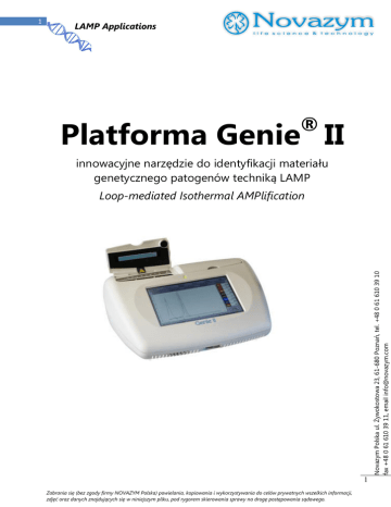LAMP Applications Novazym Polska ul. Żywokostowa 23, 61-680 Poznań, tel. +48 0 61 610 39 10, fax +48 0 61 610 39 11, email [email protected] ® Platforma Genie II innowacyjne narzędzie do identyfikacji materiału genetycznego patogenów techniką LAMP Loop-mediated Isothermal AMPlification Novazym Polska ul. Żywokostowa 23, 61-680 Poznań, tel. +48 0 61 610 39 10 fax +48 0 61 610 39 11, email [email protected] 1 1 Zabrania się (bez zgody firmy NOVAZYM Polska) powielania, kopiowania i wykorzystywania do celów prywatnych wszelkich informacji, zdjęć oraz danych znajdujących się w niniejszym pliku, pod rygorem skierowania sprawy na drogę postępowania sądowego. LAMP Applications Charakterystyka platformy Genie® II Genie® II jest innowacyjnym urządzeniem umożliwiającym wysoce czułą detekcję materiału genetycznego na poziomie molekularnym. Ta niezwykle elastyczna, kompaktowa i przenośna platforma pozwala na izotermiczną amplifikację DNA i RNA, a Novazym tym samym Polska umożliwia ul. otrzymanie wyniku izotermicznej próbki Żywokostowa 23, 61-680amplifikacji Poznań, tel. zainfekowanej obcym DNA/RNA w terenie już po 15 minutach! +48 0 61 610 39 10, fax +48 0 61 610 39 11, email Do obsługi urządzenia stworzono specjalne akcesoria, tj. 8-probówkowe stripy [email protected] oraz wysoce efektywne zestawy odczynników, które to akcesoria zapewniają przeprowadzenie łatwej i błyskawicznej identyfikacji materiału genetycznego w systemie zamkniętym, minimalizując ryzyko kontaminacji prób. Kluczowe cechy platformy Genie® II IZOTERMICZNA AMPLIFIKACJA: identyfikacja DNA/RNA na poziomie molekularnym w izotermicznej amplifikacji w czasie 15 minut CZUŁOŚC ANALIZ: wysoce czuły układ optyczny do wykrywania zjawiska fluorescencji i luminescencji DWA NIEZALEŻNE BLOKI: dwa niezależne od siebie bloki grzewcze z precyzyjną kontrolą temperatury do 99 °C Novazym Polska ul. Żywokostowa 23, 61-680 Poznań, tel. +48 0 61 610 39 10 fax +48 0 61 610 39 11, email [email protected] 2 GRADIENT TEMPERATUROWY: przeprowadzenie gradientu temperaturowego w ramach jednego lub dwóch bloków pozwala na precyzyjną optymalizację reakcji ELASTYCZNOŚĆ: kompaktowe, lekkie i całkowicie przenośne urządzenie z zasilane akumulatorem umożliwiającym całodzienną pracę bez podłączania do sieci elektrycznej NIEZLEŻNOŚĆ: praca bez komputera, za pomocą dużego panelu dotykowego AKCESORIA: specjalnie zaprojektowane 8-probówkowe plastikowe stripy OPROGRAMOWANIE: oprogramowanie jest intuicyjne i bardzo proste w obsłudze ODCZYNNIKI: wygodne zestawy odczynników zoptymalizowane pod aparat Genie® II gotowych do użycia są NISKIE KOSZTY: niska cena oraz koszty eksploatacji urządzenia 2 Zabrania się (bez zgody firmy NOVAZYM Polska) powielania, kopiowania i wykorzystywania do celów prywatnych wszelkich informacji, zdjęć oraz danych znajdujących się w niniejszym pliku, pod rygorem skierowania sprawy na drogę postępowania sądowego. LAMP Applications Genie® II czyni analizę molekularną w czasie rzeczywistym prawdziwie mobilną, czułą i błyskawicznie szybką Genie® II umożliwia przeprowadzenie izotermicznej amplifikacji z detekcją w czasie rzeczywistym na zasilanym akumulatorem urządzeniu o niskim poborze energii, nawet podczas pracy wPolska terenie. Wbudowany w urządzenie23, akumulator umożliwia pracę przez Novazym ul. Żywokostowa 61-680 Poznań, tel. cały dzień bez konieczności podłączania do sieci elektrycznej. Prowadzenie reakcji 0 61zamkniętym 610 39 10, fax +48 0 61 610 39 11, email w+48 systemie zapobiega jakiejkolwiek poamplifikacyjnej kontaminacji produktami reakcji LAMP. [email protected] Oprogramowanie i optymalizacja Sterowanie urządzeniem przez 7” ekran dotykowy bez konieczności korzystania z komputera Prostota i intuicyjność oprogramowania Novazym Polska ul. Żywokostowa 23, 61-680 Poznań, tel. +48 0 61 610 39 10 fax +48 0 61 610 39 11, email [email protected] 3 Całkowicie zautomatyzowana interpretacja wyników Dołączone do urządzenia oprogramowanie do komputera Analiza w czasie rzeczywistym Obserwacja wyniku izotermicznej amplifikacji w czasie rzeczywistym Detekcja fluorescencji dzięki bardzo czułemu systemowi optycznemu LED Monitorowanie wszystkich barwników fluorescencyjnych o wzbudzeniu falą o długości 470 nm, a emisji powyżej 510 nm Analiza topnienia produktu amplifikacji Precyzyjna kontrola temperatury podczas poamplifikacyjnej analizy produktów LAMP Ocena specyficzności reakcji 3 Zabrania się (bez zgody firmy NOVAZYM Polska) powielania, kopiowania i wykorzystywania do celów prywatnych wszelkich informacji, zdjęć oraz danych znajdujących się w niniejszym pliku, pod rygorem skierowania sprawy na drogę postępowania sądowego. LAMP Applications Identyfikacja materiału genetycznego Deinococcus radiodurans na platformie Genie® II Ustawienie parametrów reakcji LAMP 5-10 minut na przygotowanie Novazym Polska ul. Żywokostowa 23, 61-680 Poznań, tel. mieszaniny reakcyjnej dla 8 prób +48 0 61 610 39 10, fax +48 0 61 610 39 11, email 30 minut na amplifikację w stałej temperaturze 65 °C [email protected] 7 minut na topienie produktów W zakresie temperatur 98 – 80 °C z zachowaniem spadku temperatury na poziomie 0,05 °C/sekundę 47 minut od przygotowania reakcji do uzyskania wyniku analizy molekularnej! Krzywa amplifikacji LAMP Amplifikacja DNA Deinococcus radiodurans [0.2 ng/µl] Do kolejnych reakcji podano 300 000, 30 000 oraz 3 000 kopii plazmidu zawierającego amplifikowaną sekwencję DNA analizowanej bakterii Novazym Polska ul. Żywokostowa 23, 61-680 Poznań, tel. +48 0 61 610 39 10 fax +48 0 61 610 39 11, email [email protected] 4 Kontrole negatywne (NTC) są wolne od DNA bakteryjnego Analiza topnienia produktów LAMP Analiza temperatury topnienia produktów amplifikacji LAMP Jeden pik oznacza powstanie jednego specyficznego produktu reakcji, który topi się w temp. 90 °C W kontrolach negatywnych NTC nie p