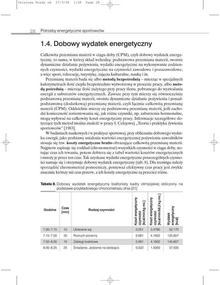Celejowa Rozdz ok 27/3/08 1:38 Page 28 28 Potrzeby energetyczne sportowców 1.4. Dobowy wydatek energetyczny Ca∏kowita przemiana materii w ciàgu doby (CPM), czyli dobowy wydatek energetyczny, to suma, w której sk∏ad wchodzà: podstawowa przemiana materii, swoiste dynamiczne dzia∏anie po˝ywienia, wydatki energetyczne na wykonywanie codziennych czynnoÊci, wydatki energetyczne na czynnoÊci zawodowe i pozazawodowe, a wi´c sport, rekreacj´, turystyk´, zaj´cia kulturalne, nauk´ i in. Przemian´ materii bada si´ albo metodà bezpoÊrednià – mierzàc w specjalnych kalorymetrach iloÊç ciep∏a bezpoÊrednio wytworzonà w procesie pracy, albo metodà poÊrednià – mierzàc iloÊç zu˝ytego przy pracy tlenu, pobranego do wyzwalania energii z substratów energetycznych. Zawsze przy tym mierzy si´ równoczeÊnie podstawowà przemian´ materii, swoiste dynamiczne dzia∏anie po˝ywienia i ponadpodstawowà (dodatkowà) przemian´ materii, czyli ∏àcznie ca∏kowità przemian´ materii (CPM). Oddzielnie mierzy si´ podstawowà przemian´ materii, jeÊli zachodzi koniecznoÊç zorientowania si´, jak ró˝ne czynniki, np. zaburzenia hormonalne, mogà wp∏ywaç na ca∏kowity koszt energetyczny pracy. Informacje szczegó∏owe dotyczàce tych metod mo˝na znaleêç w pracy I. Celejowej „Teoria i praktyka ˝ywienia sportowców” [1983]. W badaniach naukowych i w praktyce sportowej, przy obliczaniu dobowego wydatku energii, jako podstaw´ ustalenia wartoÊci energetycznej po˝ywienia zawodników stosuje si´ tzw. koszty energetyczne brutto obrazujàce ca∏kowità przemian´ materii. Najpierw zapisuje si´ rozk∏ad (chronometra˝) wszystkich czynnoÊci w ciàgu doby, notujàc czas ich trwania, potem dobiera si´ z tabel wartoÊci kosztów energetycznych i mno˝y je przez ten czas. Tak uzyskane wydatki energetyczne poszczególnych czynnoÊci sumuje si´ i otrzymuje dobowy wydatek energetyczny (tab. 8). Dla treningu nale˝y sporzàdziç chronometra˝ pomocniczy, poniewa˝ efektywny czas pracy jest zwykle znacznie krótszy ni˝ czas przerw, a ich koszty energetyczne sà przecie˝ ró˝ne. Godzina Czas [min] Koszt energetyczny czynnoÊci [kcal/min/kg mc.] Koszt energetyczny czynnoÊci [kcal/min/68,2 kg mc.] Wydatek energetyczny [kcal] Tabela 8. Dobowy wydatek energetyczny biatlonisty kadry olimpijskiej obliczony na podstawie przyk∏adowego chronometra˝u dnia [21] 7.00–7.15 15 Ubieranie si´ 0,051 3,4780 52,170 7.15–7.50 35 Rozruch poranny 0,061 4,1602 145,607 7.50–8.00 10 Zabiegi toaletowe 0,061 4,1602 145,607 8.00–8.25 25 Âniadanie. Jedzenie na siedzàco 0,022 1,5000 37,500 Rodzaj czynnoÊci Celejowa Rozdz ok 27/3/08 1:38 Page 29 Dobowy wydatek energetyczny Godzina Czas [min] Koszt energetyczny czynnoÊci [kcal/min/kg mc.] Koszt energetyczny czynnoÊci [kcal/min/68,2 kg mc.] Wydatek energetyczny [kcal] cd. tab. 8 8.25–9.30 15 Czyszczenie broni 0,038 2,5916 38,874 50 Swobodne chodzenie 0,047 3,2054 160,270 9.30–10.00 30 Trening „na sucho” z karabinkiem 0,013 0,8866 26,598 10.00–10.30 30 Rozgrzewka 0,125 8,5250 255,750 10.30–11.30 60 Trening strzelecki ∏àczony z biegiem 0,132 9,0024 540,140 11.30–11.40 10 Marsz spokojny – çwicz. rozluêniajàce 0,057 3,8874 38,874 11.40–12.00 20 Zabiegi toaletowe 0,061 4,1602 83,204 12.00–13.00 60 Odpoczynek 0,047 3,2054 192,324 13.00–13.20 20 Obiad 0,022 1,5000 30,000 13.20–14.30 70 Odpoczynek na le˝àco 0,018 1,2276 85,932 14.30–15.00 30 Trening – strzelanie „na sucho” 0,013 0,8866 26,598 15.00–17.00 120 Trening – rolki 0,278 18,9596 2275,080 17.00–17.30 30 Domarsz 0,057 3,8874 116,622 17.30–18.00 30 Zabiegi toaletowe 0,061 4,1602 124,800 18.00–18.20 20 Kolacja 0,022 1,5000 30,000 18.20–21.30 10 Spacer (chodzenie swobodne) 0,047 3,2054 609,026 21.30–22.00 30 Zabiegi toaletowe 0,061 4,1602 124,800 22.00–7.00 540 Sen 0,0169 1,1536 622,390 Razem 1440 Rodzaj czynnoÊci 5658,300 (23,7 MJ) Wed∏ug badaƒ [Celejowa i wsp., 1961–1975] wydatek energetyczny zawodników podczas treningów zale˝y od okresu cyklu treningowego. Stanowi na poczàtku rocznego cyklu szkoleniowego i w okresie startowym 20–30% dobowego wydatku energetycznego, a w okresie treningu intensywnego nawet 56%. Wydatki energetyczne mo˝na te˝ badaç metodami niekalorymetrycznymi, np. bilans w´gla, wodoru i azotu [105], monitorowaniem cz´stoÊci t´tna, podwójnie znakowanà wodà [57]. W sporcie znalaz∏y równie˝ zastosowanie metody telemetryczna [101] i biomechaniczna [45]. 29 Celejowa Rozdz ok 27/3/08 1:38 Page 30 30 Potrzeby energetyczne sportowców Badanie dobowego wydatku energetycznego jest podstawà obliczania zapotrzebowania ˝ywieniowego na energi´. Zwykle przyjmuje si´, ˝e jest ono o ok. 10% wi´ksze od dobowego wydatku energetycznego, poniewa˝ spo˝yte po˝ywienie nie jest ca∏kowicie przyswajalne. Wed∏ug zaleceƒ ekspertów FAO/WHO/UNU [1958] dzienne zapotrzebowanie kobiety o masie cia∏a 55 kg, w wieku 18–30 lat, przy Êredniej aktywnoÊci fizycznej (1,6 PPM), wynosi 2100 kcal (8,60 MJ), a zapotrzebowanie m´˝czyzny o masie cia∏a 65 kg, w wieku 18–30 lat, przy Êredniej aktywnoÊci fizycznej (1,8 PPM) wynosi 3000 kcal (12,55 MJ). U sportowców wykwalifikowanych kszta∏tuje si´ ono na poziomie 4000 kcal (16,74 MJ), 6000 kcal (25,10 MJ), a nawet 7000 kcal (29,29 MJ). Na skutek ustawicznego wzrostu obcià˝eƒ treningowych we wspó∏czesnym sporcie wyczynowym notuje si´ ciàg∏à tendencj´ do zwi´kszania si´ wydatków energetycznych i ˝ywieniowego zapotrzebowania energetycznego. Kontrolà stopnia pokrywania zapotrzebowania energetycznego jest bilans energetyczny, tj. zestawienie dobowego wydatku energii z wartoÊcià energetycznà po˝ywienia [64]. Rozchód energii powinien pokrywaç si´ z jej przychodem, czyli bilans powinien byç zerowy. W praktyce jednak w poszczególnych, nast´pujàcych po sobie dniach obserwuje si´ nieraz du˝e wahania (ryc. 1). Dlatego miarodajny jest bi
