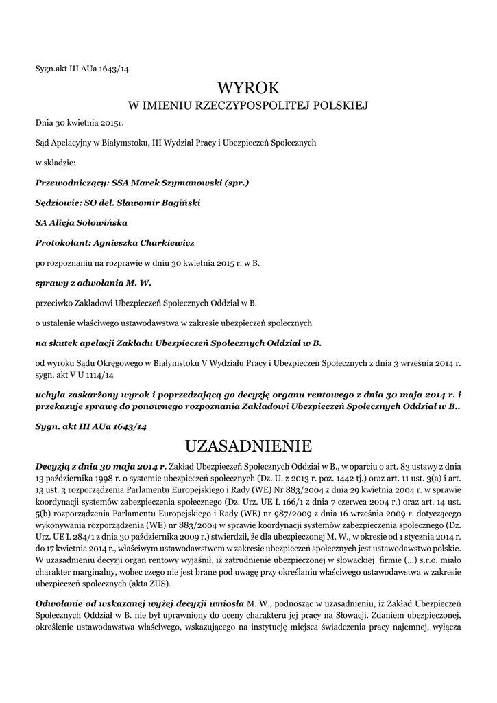 Sygn.akt III AUa 1643/14 WYROK W IMIENIU RZECZYPOSPOLITEJ POLSKIEJ Dnia 30 kwietnia 2015r. Sąd Apelacyjny w Białymstoku, III Wydział Pracy i Ubezpieczeń Społecznych w składzie: Przewodniczący: SSA Marek Szymanowski (spr.) Sędziowie: SO del. Sławomir Bagiński SA Alicja Sołowińska Protokolant: Agnieszka Charkiewicz po rozpoznaniu na rozprawie w dniu 30 kwietnia 2015 r. w B. sprawy z odwołania M. W. przeciwko Zakładowi Ubezpieczeń Społecznych Oddział w B. o ustalenie właściwego ustawodawstwa w zakresie ubezpieczeń społecznych na skutek apelacji Zakładu Ubezpieczeń Społecznych Oddział w B. od wyroku Sądu Okręgowego w Białymstoku V Wydziału Pracy i Ubezpieczeń Społecznych z dnia 3 września 2014 r. sygn. akt V U 1114/14 uchyla zaskarżony wyrok i poprzedzającą go decyzję organu rentowego z dnia 30 maja 2014 r. i przekazuje sprawę do ponownego rozpoznania Zakładowi Ubezpieczeń Społecznych Oddział w B.. Sygn. akt III AUa 1643/14 UZASADNIENIE Decyzją z dnia 30 maja 2014 r. Zakład Ubezpieczeń Społecznych Oddział w B., w oparciu o art. 83 ustawy z dnia 13 października 1998 r. o systemie ubezpieczeń społecznych (Dz. U. z 2013 r. poz. 1442 tj.) oraz art. 11 ust. 3(a) i art. 13 ust. 3 rozporządzenia Parlamentu Europejskiego i Rady (WE) Nr 883/2004 z dnia 29 kwietnia 2004 r. w sprawie koordynacji systemów zabezpieczenia społecznego (Dz. Urz. UE L 166/1 z dnia 7 czerwca 2004 r.) oraz art. 14 ust. 5(b) rozporządzenia Parlamentu Europejskiego i Rady (WE) nr 987/2009 z dnia 16 września 2009 r. dotyczącego wykonywania rozporządzenia (WE) nr 883/2004 w sprawie koordynacji systemów zabezpieczenia społecznego (Dz. Urz. UE L 284/1 z dnia 30 października 2009 r.) stwierdził, że dla ubezpieczonej M. W., w okresie od 1 stycznia 2014 r. do 17 kwietnia 2014 r., właściwym ustawodawstwem w zakresie ubezpieczeń społecznych jest ustawodawstwo polskie. W uzasadnieniu decyzji organ rentowy wyjaśnił, iż zatrudnienie ubezpieczonej w słowackiej firmie (...) s.r.o. miało charakter marginalny, wobec czego nie jest brane pod uwagę przy określaniu właściwego ustawodawstwa w zakresie ubezpieczeń społecznych (akta ZUS). Odwołanie od wskazanej wyżej decyzji wniosła M. W., podnosząc w uzasadnieniu, iż Zakład Ubezpieczeń Społecznych Oddział w B. nie był uprawniony do oceny charakteru jej pracy na Słowacji. Zdaniem ubezpieczonej, określenie ustawodawstwa właściwego, wskazującego na instytucję miejsca świadczenia pracy najemnej, wyłącza ocenę przez instytucję miejsca zamieszkania, czy stosunek prawny będący podstawą objęcia ubezpieczeniem społecznym w kraju świadczenia pracy jest ważny według prawa miejsca zamieszkania ubezpieczonego. Ocena ta mogła nastąpić wyłącznie na podstawie przepisów miejsca świadczenia pracy najemnej i mogła być dokonana tylko przez organy władne te przepisy stosować. W konsekwencji ubezpieczona wniosła o zmianę zaskarżonej decyzji w całości i uznanie, że od dnia podjęcia pracy na Słowacji podlega tamtejszemu ustawodawstwu (k. 2-4). Wyrokiem z dnia 3 września 2014 r. Sąd Okręgowy w Białymstoku zmienił zaskarżoną decyzję i stwierdził, iż M. W. w związku z zatrudnieniem na Słowacji w okresie od 1 września 2014r, podlega w zakresie ubezpieczeń społecznych ustawodawstwu polskiemu. Sąd Okręgowy ustalił, iż ubezpieczona od dnia 11 października 2012r. prowadzi jednoosobową działalność gospodarczą pod nazwą (...) M. W., zarejestrowaną pod adresem: ul. (...), (...)-(...) U.. Głównym przedmiotem tej działalności jest produkcja urządzeń, instrumentów oraz wyrobów medycznych, wyłączając dentystyczne (k. 14 akt ZUS). Z tytułu prowadzenia pozarolniczej działalności gospodarczej ubezpieczona dokonała zgłoszenia do obowiązkowych ubezpieczeń społecznych oraz ubezpieczenia zdrowotnego w okresie od 11 października 2012r. do 31 grudnia 2013r. oraz od 18 kwietnia 2014r. W okresie od dnia 1 stycznia 2014 r. do 17 kwietnia 2014 r. M. W. wyrejestrowała się z ubezpieczeń społecznych oraz jako płatnik składek, nie zaprzestając wykonywania działalności gospodarczej. Dnia 1 stycznia 2014 r. ubezpieczona zawarła umowę o pracę na czas nieokreślony z firmą: (...) s.r.o. z siedzibą: (...). Na jej podstawie ubezpieczona miała dla pracodawcy: 1. wykonywać pracę promotora usług i produktów świadczonych przez pracodawcę albo jego klientów.; 2. w ramach uzgodnionego rodzaju pracy wykonywać wszelkie zadania i czynności związane ze wskazanym rodzajem pracy i przedmiotem działalności pracodawcy; 3. kontaktować się z potencjalnymi klientami pracodawcy; 4. prezentować i promować działalność pracodawcy i jego klientów oraz 5. zapewnić pisemne źródła, materiały i urządzenia techniczne w celu realizacji i przeprowadzania szkoleń internetowych. W umowie określono, iż czas pracy ubezpieczonej wynosi 10 godzin miesięcznie, zaś za świadczoną pracę należy jej się wynagrodzenie w wysokości 40 euro (umowa o pracę- k. 4-10 akt ZUS). W konsekwencji powyższego słowacki pracodawca dokonał zgłoszenia M. W. do ubezpieczeń społecznych. Potwierdzając powyższe słowacki organ ubezpieczeniowy (...)) w dniu 22 stycznia 2014r. wydał ubezpieczonej list FO (R. list FO), nadający jej numer ubezpieczenia potwierdzający podleganie odwołującej ubezpieczeniu tego państwa (k. 12 akt ZUS). Wobec zawarcia umowy o pracę z pracodawcą słowackim, ubezpieczona w dniu 14 lutego 2014r. złożyła w organie rentowym wniosek o ustalenie ustawodawstwa właściwego, informując o podjęciu od dnia 1 stycznia 2014r. zatrudnienia na terenie Słowacji, przy jednoczesnym prowadzeniu działalności gospodarczej na terytorium Rzeczypospolitej Polskiej (k. 2 akt ZUS). Do wniosku załączyła przytoczone wyżej dokumenty, tj. umowę o pracę z (...) s.r.o., list FO nadający numer ubezpieczenia i potwierdzający podleganie ubezpieczeniu oraz zaświadczenie o wpisie 