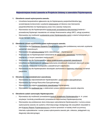 Najważniejsze treści zawarte w Projekcie Ustawy o zawodzie Fizjoterapeuty 1. Określenie zasad wykonywania zawodu. o Umożliwia bezpośrednie zgłaszanie się do fizjoterapeuty pacjentów/klientów bez wcześniejszej konieczności uzyskania skierowania od lekarza oraz kierowanie pacjentów/klientów do fizjoterapeuty przez inne zawody medyczne. o Wprowadza się dla fizjoterapeutów konieczność prowadzenia dokumentacji badania i prowadzonej fizjoterapii niezależnie od rodzaju finansowania usługi (NFZ, usługi prywatne). o Wprowadza się możliwość wystawiania przez fizjoterapeutów opinii o stanie funkcjonalnym i stanie narządu ruchu. 2. Określenie zasad uzyskiwania prawa wykonywania zawodu. o Wprowadza się Państwowy Egzamin Fizjoterapeutyczny jako podstawowy warunek uzyskania uprawnień zawodowych. o Wprowadza się ochronę prawną tytułu zawodowego - „fizjoterapeuta”. o Wymusza się na fizjoterapeutach stosowanie do zasad etyki zawodowej i konieczność współpracy z innymi zawodami medycznymi. o Wprowadza się dla fizjoterapeutów zakaz przekraczania uprawnień zawodowych o Umożliwia się fizjoterapeucie odmowę wykonania określonych świadczeń zleconych przez inne zawody medyczne w przypadku uzasadnionych wątpliwości. o Wprowadza się dla fizjoterapeutów obowiązek zachowania w tajemnicy informacji na temat pacjentów. 3. Określenie odpowiedzialności zawodowej. o Wprowadza się odpowiedzialność fizjoterapeutów przed sądem dyscyplinarnym. o Wprowadza się funkcję Rzecznika Dyscyplinarnego. o Wprowadza się pojęcie przewinienia zawodowego fizjoterapeuty. o Wprowadza się możliwość kar z odebraniem prawa wykonywania zawodu włącznie. 4. Określenie zadań samorządu fizjoterapeutów. o Wprowadza się możliwość prowadzenia kontroli działalności fizjoterapeutów m. in. przez wizytacje i kontrolę prawidłowości prowadzenia dokumentacji fizjoterapeutycznej. o Wprowadza się podstawowe dane dotyczące wykształcenia fizjoterapeutów i numery prawa wykonywania zawodu do systemu informatycznego dostępnego dla wszystkich obywateli to jest Krajowy Rejestr Fizjoterapeutyczny (można sprawdzić w każdej chwili za pomocą Internetu wykształcenie i numer prawa wykonywania zawodu jak u lekarza, pielęgniarki czy diagnosty laboratoryjnego).