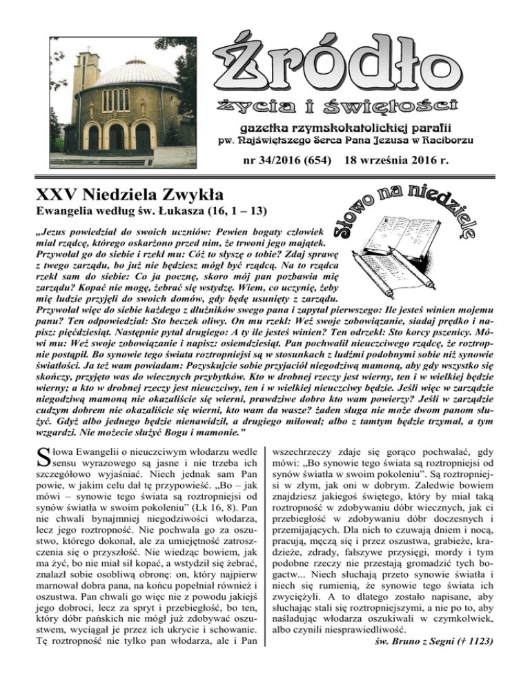 gazetka rzymskokatolickiej parafii pw. Najświętszego Serca Pana Jezusa w Raciborzu nr 34/2016 (654) 18 września 2016 r. XXV Niedziela Zwykła Ewangelia według św. Łukasza (16, 1 – 13) „Jezus powiedział do swoich uczniów: Pewien bogaty człowiek miał rządcę, którego oskarŜono przed nim, Ŝe trwoni jego majątek. Przywołał go do siebie i rzekł mu: CóŜ to słyszę o tobie? Zdaj sprawę z twego zarządu, bo juŜ nie będziesz mógł być rządcą. Na to rządca rzekł sam do siebie: Co ja pocznę, skoro mój pan pozbawia mię zarządu? Kopać nie mogę, Ŝebrać się wstydzę. Wiem, co uczynię, Ŝeby mię ludzie przyjęli do swoich domów, gdy będę usunięty z zarządu. Przywołał więc do siebie kaŜdego z dłuŜników swego pana i zapytał pierwszego: Ile jesteś winien mojemu panu? Ten odpowiedział: Sto beczek oliwy. On mu rzekł: Weź swoje zobowiązanie, siadaj prędko i napisz: pięćdziesiąt. Następnie pytał drugiego: A ty ile jesteś winien? Ten odrzekł: Sto korcy pszenicy. Mówi mu: Weź swoje zobowiązanie i napisz: osiemdziesiąt. Pan pochwalił nieuczciwego rządcę, Ŝe roztropnie postąpił. Bo synowie tego świata roztropniejsi są w stosunkach z ludźmi podobnymi sobie niŜ synowie światłości. Ja teŜ wam powiadam: Pozyskujcie sobie przyjaciół niegodziwą mamoną, aby gdy wszystko się skończy, przyjęto was do wiecznych przybytków. Kto w drobnej rzeczy jest wierny, ten i w wielkiej będzie wierny; a kto w drobnej rzeczy jest nieuczciwy, ten i w wielkiej nieuczciwy będzie. Jeśli więc w zarządzie niegodziwą mamoną nie okazaliście się wierni, prawdziwe dobro kto wam powierzy? Jeśli w zarządzie cudzym dobrem nie okazaliście się wierni, kto wam da wasze? Ŝaden sługa nie moŜe dwom panom słuŜyć. GdyŜ albo jednego będzie nienawidził, a drugiego miłował; albo z tamtym będzie trzymał, a tym wzgardzi. Nie moŜecie słuŜyć Bogu i mamonie.” S łowa Ewangelii o nieuczciwym włodarzu wedle sensu wyrazowego są jasne i nie trzeba ich szczegółowo wyjaśniać. Niech jednak sam Pan powie, w jakim celu dał tę przypowieść. „Bo – jak mówi – synowie tego świata są roztropniejsi od synów światła w swoim pokoleniu” (Łk 16, 8). Pan nie chwali bynajmniej niegodziwości włodarza, lecz jego roztropność. Nie pochwala go za oszustwo, którego dokonał, ale za umiejętność zatroszczenia się o przyszłość. Nie wiedząc bowiem, jak ma Ŝyć, bo nie miał sił kopać, a wstydził się Ŝebrać, znalazł sobie osobliwą obronę: on, który najpierw marnował dobra pana, na końcu popełniał równieŜ i oszustwa. Pan chwali go więc nie z powodu jakiejś jego dobroci, lecz za spryt i przebiegłość, bo ten, który dóbr pańskich nie mógł juŜ zdobywać oszustwem, wyciągał je przez ich ukrycie i schowanie. Tę roztropność nie tylko pan włodarza, ale i Pan wszechrzeczy zdaje się gorąco pochwalać, gdy mówi: „Bo synowie tego świata są roztropniejsi od synów światła w swoim pokoleniu”. Są roztropniejsi w złym, jak oni w dobrym. Zaledwie bowiem znajdziesz jakiegoś świętego, który by miał taką roztropność w zdobywaniu dóbr wiecznych, jak ci przebiegłość w zdobywaniu dóbr doczesnych i przemijających. Dla nich to czuwają dniem i nocą, pracują, męczą się i przez oszustwa, grabieŜe, kradzieŜe, zdrady, fałszywe przysięgi, mordy i tym podobne rzeczy nie przestają gromadzić tych bogactw... Niech słuchają przeto synowie światła i niech się rumienią, Ŝe synowie tego świata ich zwycięŜyli. A to dlatego zostało napisane, aby słuchając stali się roztropniejszymi, a nie po to, aby naśladując włodarza oszukiwali w czymkolwiek, albo czynili niesprawiedliwość. św. Bruno z Segni († 1123) 2 Źródło - gazetka Poniedziałek – 19 września 2016 Łk 8,16-18 630 W intencji członków ruchu szensztackiego o BoŜe błogosławieństwo i wstawiennictwo Matki Boskiej Trzykroć Przedziwnej 900 Za † matkę Hildegardę w rocznicę śmierci i †† z rodziny 1800 1. Za † męŜa Tadeusza Szembel z okazji urodzin 2. Do Miłosierdzia BoŜego za † męŜa Adama Chudzińskiego w 3. rocznicę śmierci oraz †† rodziców z obu stron i dusze w czyśćcu cierpiące Wtorek – 20 września 2016 – św. męcz. Andrzeja Kim Taegon kapł., Pawła Chong Hasang i Towarzyszy Łk 8,19-21 Za † matkę Marię w rocznicę śmierci, †† ojca Wojciecha, braci Ferdynanda, Józefa i Stanisła630 wa, teścia Jana i †† z pokrewieństwa 800 W języku niemieckim: Für †† Eltern Johann und Pauline Mateja, †† Brüder Walter und Herbert sowie †† aus der Familie Schimitzek 1800 1. Za † męŜa Mariana Głomb, †† rodziców Stanisława i Józefę, braci Jana, Stefana, Józefa, bratową Annę oraz teściów Stanisława i Karolinę Głomb 2. Do Miłosierdzia BoŜego za † męŜa Ryszarda Ligęzę w 1. rocznicę śmierci, †† synów Mariusza i Kazimierza 3. Do Miłosierdzia BoŜego za †† teściów Anielę i Michała, męŜa Stanisława oraz Michała, Barbarę, Andrzeja i wszystkich †† z rodziny Środa – 21 września 2016 – św. Mateusza, Apostoła i Ewangelisty Mt 9,9-13 630 Za †† Janinę i Zbigniewa Surma (od współlokatorów z ulicy Katowickiej 1) 900 Do BoŜej Opatrzności w intencji Krystyny z okazji 80. rocznicy urodzin z podziękowaniem za otrzymane łaski, z prośbą o zdrowie i BoŜe błogosławieństwo 1800 1. Do Miłosierdzia BoŜego za † Ŝonę Natalię, †† rodziców Ryszarda i Gertrudę Warkocz, teściów Bernarda i Marię Muchewicz oraz wszystkich †† z rodzin Warkocz, Muchewicz, Kallus, Mertuszka i za dusze w czyśćcu cierpiące 2. Do Miłosierdzia BoŜego za †† rodziców Marię i Antoniego, dziadków z obu stron, siostrę Jadwigę, szwagrów Władysława i Stanisława i ks. Alojzego Jurczyka Czwartek – 22 września 2016 Łk 9,7-9 630 Za †† Otylię Solich, męŜa Alfreda, rodziców z obu stron 1300 Ślub: Marta Militowska – T
