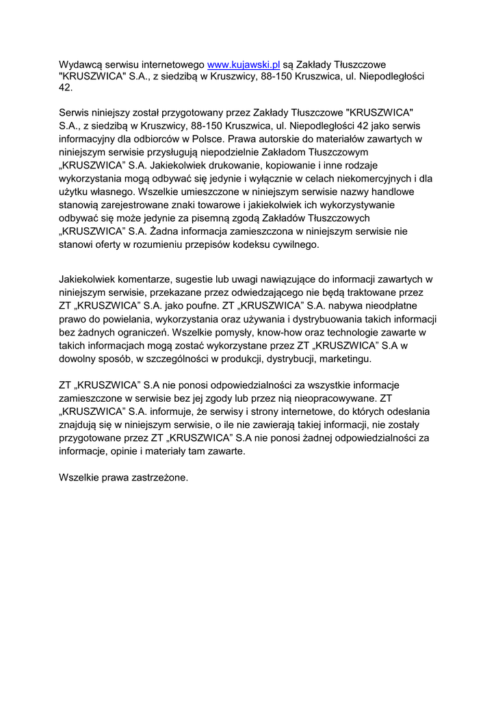 Wydawcą serwisu internetowego www.kujawski.pl są Zakłady Tłuszczowe "KRUSZWICA" S.A., z siedzibą w Kruszwicy, 88-150 Kruszwica, ul. Niepodległości 42. Serwis niniejszy został przygotowany przez Zakłady Tłuszczowe "KRUSZWICA" S.A., z siedzibą w Kruszwicy, 88-150 Kruszwica, ul. Niepodległości 42 jako serwis informacyjny dla odbiorców w Polsce. Prawa autorskie do materiałów zawartych w niniejszym serwisie przysługują niepodzielnie Zakładom Tłuszczowym „KRUSZWICA” S.A. Jakiekolwiek drukowanie, kopiowanie i inne rodzaje wykorzystania mogą odbywać się jedynie i wyłącznie w celach niekomercyjnych i dla użytku własnego. Wszelkie umieszczone w niniejszym serwisie nazwy handlowe stanowią zarejestrowane znaki towarowe i jakiekolwiek ich wykorzystywanie odbywać się może jedynie za pisemną zgodą Zakładów Tłuszczowych „KRUSZWICA” S.A. Żadna informacja zamieszczona w niniejszym serwisie nie stanowi oferty w rozumieniu przepisów kodeksu cywilnego. Jakiekolwiek komentarze, sugestie lub uwagi nawiązujące do informacji zawartych w niniejszym serwisie, przekazane przez odwiedzającego nie będą traktowane przez ZT „KRUSZWICA” S.A. jako poufne. ZT „KRUSZWICA” S.A. nabywa nieodpłatne prawo do powielania, wykorzystania oraz używania i dystrybuowania takich informacji bez żadnych ograniczeń. Wszelkie pomysły, know-how oraz technologie zawarte w takich informacjach mogą zostać wykorzystane przez ZT „KRUSZWICA” S.A w dowolny sposób, w szczególności w produkcji, dystrybucji, marketingu. ZT „KRUSZWICA” S.A nie ponosi odpowiedzialności za wszystkie informacje zamieszczone w serwisie bez jej zgody lub przez nią nieopracowywane. ZT „KRUSZWICA” S.A. informuje, że serwisy i strony internetowe, do których odesłania znajdują się w niniejszym serwisie, o ile nie zawierają takiej informacji, nie zostały przygotowane przez ZT „KRUSZWICA” S.A nie ponosi żadnej odpowiedzialności za informacje, opinie i materiały tam zawarte. Wszelkie prawa zastrzeżone.