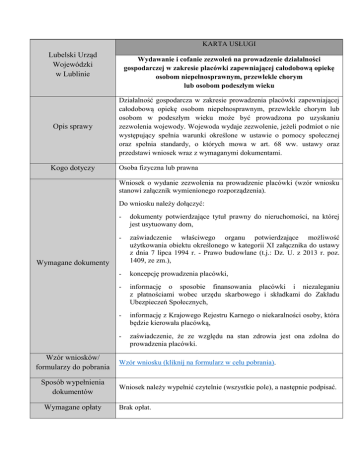 KARTA USŁUGI Lubelski Urząd Wojewódzki w Lublinie Opis sprawy Kogo dotyczy Wydawanie i cofanie zezwoleń na prowadzenie działalności gospodarczej w zakresie placówki zapewniającej całodobową opiekę osobom niepełnosprawnym, przewlekle chorym lub osobom podeszłym wieku Działalność gospodarcza w zakresie prowadzenia placówki zapewniającej całodobową opiekę osobom niepełnosprawnym, przewlekle chorym lub osobom w podeszłym wieku może być prowadzona po uzyskaniu zezwolenia wojewody. Wojewoda wydaje zezwolenie, jeżeli podmiot o nie występujący spełnia warunki określone w ustawie o pomocy społecznej oraz spełnia standardy, o których mowa w art. 68 ww. ustawy oraz przedstawi wniosek wraz z wymaganymi dokumentami. Osoba fizyczna lub prawna Wniosek o wydanie zezwolenia na prowadzenie placówki (wzór wniosku stanowi załącznik wymienionego rozporządzenia). Do wniosku należy dołączyć: - dokumenty potwierdzające tytuł prawny do nieruchomości, na której jest usytuowany dom, - zaświadczenie właściwego organu potwierdzające możliwość użytkowania obiektu określonego w kategorii XI załącznika do ustawy z dnia 7 lipca 1994 r. - Prawo budowlane (t.j.: Dz. U. z 2013 r. poz. 1409, ze zm.), - koncepcję prowadzenia placówki, - informację o sposobie finansowania placówki i niezaleganiu z płatnościami wobec urzędu skarbowego i składkami do Zakładu Ubezpieczeń Społecznych, - informację z Krajowego Rejestru Karnego o niekaralności osoby, która będzie kierowała placówką, - zaświadczenie, że ze względu na stan zdrowia jest ona zdolna do prowadzenia placówki. Wymagane dokumenty Wzór wniosków/ formularzy do pobrania Sposób wypełnienia dokumentów Wymagane opłaty Wzór wniosku (kliknij na formularz w celu pobrania). Wniosek należy wypełnić czytelnie (wszystkie pole), a następnie podpisać. Brak opłat. Termin złożenia dokumentów Przed przyjęciem pensjonariuszy. Wydział Polityki Społecznej Oddział ds. pomocy instytucjonalnej Jednostka odpowiedzialna za załatwienie sprawy ul. Spokojna 4 20-914 Lublin Tel: (81) 74-24-552 Fax: (81) 74-24-470 Termin załatwienia sprawy W przypadku niedołączenia wymaganych dokumentów, o których mowa wyżej, wojewoda wzywa podmiot występujący o zezwolenie do przedstawienia tych dokumentów w terminie 14 dni od dnia doręczenia wezwania, pouczając, że ich niedołączenie spowoduje pozostawienie wniosku bez rozpatrzenia. W terminie 30 dni od dnia złożenia wniosku o zezwolenie właściwy do spraw pomocy społecznej wydział urzędu wojewódzkiego, w imieniu i z upoważnienia wojewody, dokonuje oględzin obiektu, w którym jest usytuowana placówka. Wojewoda rozpatruje wniosek o zezwolenie w terminie 14 dni od dnia zakończenia oględzin obiektu, w którym jest usytuowana placówka. Po stwierdzeniu, że placówka gwarantuje zapewnienie odpowiedniej opieki, w szczególności spełnia standardy, o których mowa w art. 68 ustawy o pomocy społecznej, wojewoda wydaje zezwolenie, określając w nim przeznaczenie placówki, i wpisuje placówkę do rejestru placówek. W sprawach nieuregulowanych w rozporządzeniu stosuje się odpowiednio przepisy ustawy z dnia 14 czerwca 1960 r. Kodeks postępowania administracyjnego – t.j.: Dz. U. z 2016 r., poz. 23. Tryb odwoławczy Od decyzji odmownej przysługuje odwołanie do ministra właściwego do spraw zabezpieczenia społecznego za pośrednictwem wojewody lubelskiego w terminie 14 dni od daty jej doręczenia Wnioski można składać osobiście w Biurze Podawczym lub listownie na adres Urzędu: Lubelski Urząd Wojewódzki w Lublinie Informacje dodatkowe ul. Spokojna 4 20-914 Lublin W przypadku pytań informacji udzielają: pracownicy Oddziału: kierownik Oddziału, pokój nr 26 tel. (81) 74-24- 270, pracownicy, pokoje nr 22, 27 tel. (81) 74-24-427, tel. (81) 74-24-362 Podstawa prawna Art. 22 pkt 3 oraz art. 67 ustawy o pomocy społecznej z dnia 12 marca 2004 r. (t. j.: Dz.U. z 2015 r., poz. 163, ze zm.) oraz § 2 rozporządzenia ministra polityki społecznej z dnia 28 kwietnia 2005 r. w sprawie wydawania i cofania zezwoleń na prowadzenie działalności gospodarczej w zakresie prowadzenia placówki zapewniającej całodobową opiekę (Dz.U. Nr 86, poz. 739). Termin publikacji 24 lutego 2016 r.