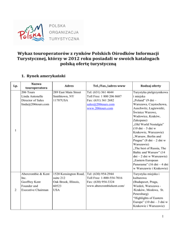 Wykaz touroperatorów z rynków Polskich Ośrodków Informacji Turystycznej, którzy w 2012 roku posiadali w swoich katalogach polską ofertę turystyczną 1. Rynek amerykański Lp. Nazwa touroperatora 206 Tours Linda Antonelle Director of Sales [email protected] Adres Tel./Fax./adres www 289 East Main Street Smithtown, NY 11787USA Tel: (631) 361 4644 Toll Free: 1 800 206 8687 Fax: (631) 361 2682 [email protected] www.206tours.com Turystyka pielgrzymkowa i miejska „Poland” (9 dni – Warszawa, Częstochowa, Auschwitz, Łagiewniki, Świnice Warowe, Wadowice, Kraków, Zakopane) „Old World Nostalgia” (10 dni – 5 dni w Krakowie, Warszawie) „Warsaw, Berlin and Prague” (8 dni – 2 dni w Warszawie) „The best of Russia, The Baltic and Warsaw” (14 dni – 2 dni w Warszawie) „Eastern European Panorama” (16 dni – 4 dni w Warszawie i Krakowie) 1520 Kensington Road, suite 212 Oak Brook, Illinois, 60523 USA Tel: (630) 954-2944 Toll Free: 1-800-554-7016 Fax: (630) 954-3324 www.abercrombiekent.com/ Turystyka miejska i kulturowa (Budapeszt, Praga, Wiedeń, Warszawa /Kraków, Moskwa, St. Petersburg) “Highlights of Eastern Europe” (10 dni – 3 dni w Krakowie i Warszawie) 1 2 Abercrombie & Kent Inc. Geoffrey Kent Founder and Executive Chairman Rodzaj oferty 1 Adventure Center Dallyce Macas President & CEO, 1311 63rd Street, Suite 200 Emeryville, CA 94608, USA Tel: (510)-654-1879 Toll Free: 1 800 228 8747 Fax: (510)-654-4200 [email protected] www.adventurecenter.com/ Turystyka aktywna (trecking, canoeing, biking) „High Tatras Trek” (8 dni – Kraków, Zakopane, Niedzica, Pieniny), „Wildlife and Wolf Trails” (Kraków, Bieszczady), „Backroads of Poland” (15 dni – Warszawa, Wigierski Park Narodowy, Białowieski Park Narodowy, Kazimierz Dolny, Zamość, Przemyśl; Bieszczady, Kraków, Auschwitz), „Poland Explorer” (10 dni – Kraków, Bieszczady, Pieniny, Tatry, Ojcowski Park Narodowy) Adventures Abroad Worldwide Travel Ltd Chris Boycott, Managing Director 20800 Westminster Hwy Suite 2148 Richmond, BC V6V 2W3 Canada 1124 1St Ave suite 101 Blaine WA 98240, USA Tel:(604) 303-1099 Fax:(604) 303-1076 [email protected] www.adventures-abroad.com/ Turystyka miejska i krajoznawcza (Warszawa, Częstochowa, Auschwitz, Kraków, Wieliczka, Zakopane) American Jewish 630 Third Avenue Congress International New York, NY 10017 USA Travel Jeff Rubtchinsky President Tel: (212)-879-4588 Toll Free: 1 800 221 4694 www.ajcongresstravel.com/ Turystyka sentymentalna i miejska (Warszawa:Umschlagplat z, Getto, Kraków:Kazimierz, Lublin:Majdanek, Kraków: Oświęcim, Wilno, Kowno, Budapeszt, Praga) „Eastern Europe Heritage” (19 dni) American Travel Abroad Zbigniew Wegiel Tel: (212) 586-5230 Fax:(212)581-7925 Turystyka miejska, aktywna, tury objazdowe i sanatoryjna- 3 4 5 6 505 8th Avenue, Suite 801 New York, NY 10018 2 President USA Avanti Destinations Harry Dalgaard, President 851 SW 6th Ave, Suite Tel: (503)-295-1100 1010 Fax: (503)-295-2723 www.avantidestinations.com/ Portland, OR 97204 USA Turystyka miejska “Poland & Hungary” (12 dni – 5 dni w Warszawie i Krakowie) “Poland Combo Package” ( 4 dni w Warszawie i Krakowie) 8 Best Catholic Pilgrimages Susan Ives Director 640 N La Salle Street Chicago IL 60610 USA Toll Free: 800-908-2378 Fax: (312) 944-3352 www.eholy.com/ Turystyka miejska, kulturowa oraz religijna (pielgrzymki prowadzone przez duchownych) 9 Brendan Worldwide Vacation Chris Greco Sales Manager NJ NY PA Cgreco@brendanvaca tions.com 21625 Prairie Street Chatsworth, CA 913115833 USA Tel: (818)-428-6000 Toll Free: 1 800-421-8446 Fax: (818)-772-6492 [email protected] www.brendanvacations.com/ Turystyka miejska „Imperial cities” (10 dni), „Eastern Europe Panorama” (14 dni – 4 dni w Krakowie, Częstochowie, Poznaniu i Warszawie) Canadian Travel Abroad Rhonda Stephenson, CTC President 80 Richmond Street West, Suite 804 Toronto, Ontario M5H 2A4 Canada Tel:(416) 364-2738 Toll Free: 1-800-387-1876 Fax:(416) 364-6951 [email protected] www.cantrav.ca/ Turystyka miejska „Scenic Poland” (7 dni – Warszawa, Bogusławice, Częstochowa, Kraków, Zakopane) „Panorama of Central Europe” (14 dni – 5 dni w Krakowie i Warszawie) „Jewels of the East” (20 dni – 5 dni w Warszawie, Krakowie i Auschwitz) Collette Tours Dan Sullivan, President and CEO 162 Middle Street, Pawtucket, RI 02860, USA Tel:(401) 727-9000 Fax:(401) 728-1380 www.collettetours.com/ Turystyka miejska i sentymentalna (Warszawa, Kraków, Auschwitz, Częstochowa) “Magnificent Cities of Central & Eastern Europe” (14 dni – 4 dni w Polsce) Collette Tours Canada East Toronto: 5025 Orbitor Road Bldg #4, Suite 400 Mississauga, Ontario, L4W4Y5, Canada Tel: (905) 629-0120 800-468-5955 Fax: (905)-624-2420 www.collettetours.com/ Turystyka miejska i sentymentalna (Warszawa, Kraków, Auschwitz, Częstochowa) “Magnificent Cities of Central & Eastern 7 10 11 12 3 Europe” (14 dni – 4 dni w Polsce) Collette Tours Canada West Vancouver: #200-3671 Westminister Hwy Richmond, BC V7C 5V2. Canada Tel: (604) 278-5531 Fax: (604) 278-5310 www.collettetours.com/ Turystyka miejska i sentymentalna (Warszawa, Kraków, Auschwitz, Częstochowa) “Magnificent Cities of Central & Eastern Europe” (14 dni – 4 dni w Polsce Contiki Holidays Greg Fischbein President 801 East Katella Ave, 3rd Floor Anaheim, CA 92805 USA Toll Free: 1 866 CONTIKI Fax: 714-935-2579 [email protected] www.contiki.com/ Turystyka miejska (młodzieżowa) „Russia and Scandinavia” (22 dni – 2 dni tranzytowe w Polsce – zwiedzanie Warszawy) Educational Opportunities Tours James Ridgway, Jr President PO Box 6098 Lakeland, FL 33807 USA Tel: (863) 648 0383 Turystyka pielgrzymkowa Fax: (863) 644 6801 (chrześcijańska) http://www.eo.travelwithus.com/ “Prague and the Shrines of Poland” Educational Travel Services, Inc. Joseph Cavarra President PO BOX 6929 Lakeland, FL 33807 USA Toll Free: 1 800 929 4387, ext. 1246 Fax: (863) 647 4422 [email