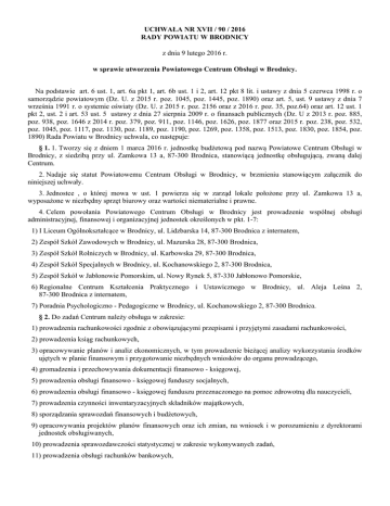 UCHWAŁA NR XVII / 90 / 2016 RADY POWIATU W BRODNICY z dnia 9 lutego 2016 r. w sprawie utworzenia Powiatowego Centrum Obsługi w Brodnicy. Na podstawie art. 6 ust. 1, art. 6a pkt 1, art. 6b ust. 1 i 2, art. 12 pkt 8 lit. i ustawy z dnia 5 czerwca 1998 r. o samorządzie powiatowym (Dz. U. z 2015 r. poz. 1045, poz. 1445, poz. 1890) oraz art. 5, ust. 9 ustawy z dnia 7 września 1991 r. o systemie oświaty (Dz. U. z 2015 r. poz. 2156 oraz z 2016 r. poz. 35, poz.64) oraz art. 12 ust. 1 pkt 2, ust. 2 i art. 53 ust. 5 ustawy z dnia 27 sierpnia 2009 r. o finansach publicznych (Dz. U z 2013 r. poz. 885, poz. 938, poz. 1646 z 2014 r. poz. 379, poz. 911, poz. 1146, poz. 1626, poz. 1877 oraz 2015 r. poz. 238, poz. 532, poz. 1045, poz. 1117, poz. 1130, poz. 1189, poz. 1190, poz. 1269, poz. 1358, poz. 1513, poz. 1830, poz. 1854, poz. 1890) Rada Powiatu w Brodnicy uchwala, co następuje: § 1. 1. Tworzy się z dniem 1 marca 2016 r. jednostkę budżetową pod nazwą Powiatowe Centrum Obsługi w Brodnicy, z siedzibą przy ul. Zamkowa 13 a, 87-300 Brodnica, stanowiącą jednostkę obsługującą, zwaną dalej Centrum. 2. Nadaje się statut Powiatowemu Centrum Obsługi w Brodnicy, w brzmieniu stanowiącym załącznik do niniejszej uchwały. 3. Jednostce , o której mowa w ust. 1 powierza się w zarząd lokale położone przy ul. Zamkowa 13 a, wyposażone w niezbędny sprzęt biurowy oraz wartości niematerialne i prawne. 4. Celem powołania Powiatowego Centrum Obsługi w Brodnicy jest prowadzenie wspólnej obsługi administracyjnej, finansowej i organizacyjnej jednostek określonych w pkt. 1-7: 1) I Liceum Ogólnokształcące w Brodnicy, ul. Lidzbarska 14, 87-300 Brodnica z internatem, 2) Zespół Szkół Zawodowych w Brodnicy, ul. Mazurska 28, 87-300 Brodnica, 3) Zespół Szkół Rolniczych w Brodnicy, ul. Karbowska 29, 87-300 Brodnica, 4) Zespół Szkół Specjalnych w Brodnicy, ul. Kochanowskiego 2, 87-300 Brodnica, 5) Zespół Szkół w Jabłonowie Pomorskim, ul. Nowy Rynek 5, 87-330 Jabłonowo Pomorskie, 6) Regionalne Centrum Kształcenia Praktycznego i Ustawicznego w Brodnicy, ul. Aleja Leśna 2, 87-300 Brodnica z internatem, 7) Poradnia Psychologiczno - Pedagogiczne w Brodnicy, ul. Kochanowskiego 2, 87-300 Brodnica. § 2. Do zadań Centrum należy obsługa w zakresie: 1) prowadzenia rachunkowości zgodnie z obowiązującymi przepisami i przyjętymi zasadami rachunkowości, 2) prowadzenia ksiąg rachunkowych, 3) opracowywanie planów i analiz ekonomicznych, w tym prowadzenie bieżącej analizy wykorzystania środków ujętych w planie finansowym i przygotowanie niezbędnych wniosków do organu prowadzącego, 4) gromadzenia i przechowywania dokumentacji finansowo - księgowej, 5) prowadzenia obsługi finansowo - księgowej funduszy socjalnych, 6) prowadzenia obsługi finansowo - księgowej funduszu przeznaczonego na pomoc zdrowotną dla nauczycieli, 7) prowadzenia czynności inwentaryzacyjnych składników majątkowych, 8) sporządzania sprawozdań finansowych i budżetowych, 9) opracowywania projektów planów finansowych oraz ich zmian, na wniosek i w porozumieniu z dyrektorami jednostek obsługiwanych, 10) prowadzenia sprawozdawczości statystycznej w zakresie wykonywanych zadań, 11) prowadzenia obsługi rachunków bankowych, 12) prowadzenia obsługi kadrowej w zakresie ewidencji dokumentacji dotyczącej zatrudnienia, zmian w okresie trwania stosunków pracy i zwalniania pracowników, 13) wypłat wynagrodzeń i innych należności dla pracowników i osób zatrudnionych na podstawie umów cywilno - prawnych w jednostkach obsługiwanych, 14) ewidencjonowania danych o zatrudnieniu i wynagrodzeniach, 15) przygotowywania danych do sprawozdania o średniorocznym wynagrodzeniu nauczycieli, 16) przygotowywanie i przeprowadzanie postępowań o udzielanie zamówień publicznych i przetargów na podstawie pełnomocnictw dyrektorów jednostek obsługiwanych, 17) realizacja zaopatrzenia, 18) prowadzenia prac remontowych obiektów jednostek obsługiwanych, 19) prowadzenia obsługi finansowo - księgowej scentralizowanego funduszu mieszkaniowego tworzonego ze środków wydzielonych z zakładowego funduszu świadczeń socjalnych pracowników, emerytów i rencistów jednostek obsługiwanych, 20) prowadzenia obsługi finansowo - księgowej scentralizowanego funduszu świadczeń socjalnych emerytów i rencistów nauczycieli z jednostek obsługiwanych tworzonego ze środków wydzielonych z zakładowego funduszu świadczeń socjalnych tych jednostek, 21) prowadzenie obsługi BHP, 22) zapewnienia obsługi prawnej, 23) zapewnienia obsługi informatycznej. § 3. Wykonanie uchwały powierza się Zarządowi Powiatu w Brodnicy. § 4. Uchwała wchodzi w życie z dniem podjęcia. Przewodniczący Rady Powiatu w Brodnicy Roman Pytlasiński Załącznik do Uchwały Nr XVII / 90 / 2016 Rady Powiatu w Brodnicy z dnia 9 lutego 2016 r. STATUT POWIATOWEGO CENTRUM OBSŁUGI W BRODNICY Rozdział 1. POSTANOWIENIA OGÓLNE § 1. Powiatowe Centrum Obsługi w Brodnicy zwane dalej "Centrum" jest jednostką budżetową Powiatu, którego zadaniem jest prowadzenie wspólnej obsługi administracyjnej, finansowej i organizacyjnej szkół i placówek oświatowych prowadzonych przez Powiat Brodnicki § 2. Terenem działania Centrum jest obszar Powiatu Brodnickiego. § 3. Siedziba Centrum mieści się w Brodnicy, ul. Zamkowa 13a. § 4. Centrum używa pieczęci podłużnej o brzmieniu „Powiatowe Centrum Obsługi w Brodnicy, ul. Zamkowa 13 a, 87-300 Brodnica". RODZIAŁ 2. PRZEDMIOT I ZAKRES DZIAŁALNOŚCI CENTRUM § 5. Centrum wykonuje zadania w zakresie obsługi administracyjnej, finansowej i organizacyjnej szkół i placówek oświatowych: 1) I Liceum Ogólnokształcącego w Brodnicy, ul. Lidzbarska 14, 87-300 Brodnica z internatem, 2) Zespołu Szkół Zawodowych w Brodnicy, ul. Mazurska 28, 87-300 Brodnica, 3) Zespołu Szkół Rolniczych w Brodnicy, ul. Karbowska 29, 87-300 Brodnica, 4) Zespołu Szkół Specjalnych w Brodnicy, ul. Kochanowskiego 2,