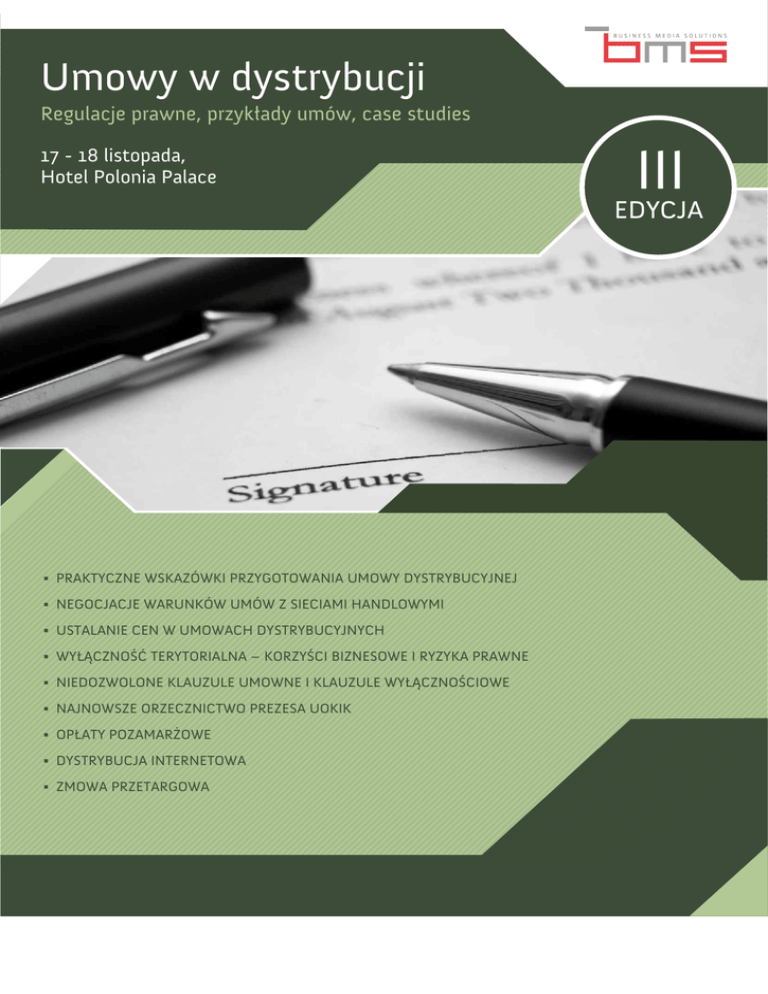 Umowy w dystrybucji Regulacje prawne, przyk³ady umów, case studies 17 - 18 listopada, Hotel Polonia Palace § PRAKTYCZNE WSKAZÓWKI PRZYGOTOWANIA UMOWY DYSTRYBUCYJNEJ § NEGOCJACJE WARUNKÓW UMÓW Z SIECIAMI HANDLOWYMI § USTALANIE CEN W UMOWACH DYSTRYBUCYJNYCH § WY£¥CZNOŒÆ TERYTORIALNA – KORZYŒCI BIZNESOWE I RYZYKA PRAWNE § NIEDOZWOLONE KLAUZULE UMOWNE I KLAUZULE WY£¥CZNOŒCIOWE § NAJNOWSZE ORZECZNICTWO PREZESA UOKIK § OP£ATY POZAMAR¯OWE § DYSTRYBUCJA INTERNETOWA § ZMOWA PRZETARGOWA III Œroda, 17 listopada 9.30 Poranna kawa, rejestracja i przywitanie 10.00 Przetargowy tryb wyboru kontrahenta a zakazane porozumienia ograniczaj¹ce konkurencjê § Kiedy i dlaczego porozumienie miêdzy oferentami mo¿e zostaæ uznane za anty-konkurencyjne? § Przetargi publiczne, przetargi prywatne – czy jest jakaœ ró¿nica w œwietle prawa ochrony konkurencji? § Najczêstsze formy zmów przetargowych § Okolicznoœci sprzyjaj¹ce „zmawianiu siê” § Podejrzane zachowania przedsiêbiorców wskazuj¹ce na prawdopodobne istnienie zmowy § Jak minimalizowaæ ryzyka udzia³u w antykonkurencyjnym porozumieniu/zmowie przetargowej? Joanna Affre, Kochañski Ziêba R¹pa³a i Partnerzy 11.30 Przerwa na kawê 14.30 Klauzule wy³¹cznoœciowe § Dystrybucja wy³¹czna § Zobowi¹zanie wy³¹cznej dostawy § Zobowi¹zanie wy³¹cznego zakupu § Zakaz konkurencji § Klauzula angielska § Umowy lodówkowe (wy³¹czne korzystanie z wynajmowanego sprzêtu) § Wy³¹cznoœæ pó³ki § Wy³¹cznoœæ przy sponsorowaniu wydarzeñ sportowych i kulturalnych § Ocena poszczególnych klauzul - kiedy mog¹ byæ stosowane, a kiedy nie § Praktyczne wskazówki odnoœnie sposobu dokonywania oceny klauzul wy³¹cznoœciowych § Systemy rabatowe Ma³gorzata Urbañska, CMS Cameron McKenna 16.00 Przerwa na kawê 12.00 Ustalanie cen w umowach dystrybucyjnych § Ogólne ramy antymonopolowe polityki cenowej dostawców § Ceny a mar¿e i rabaty § Ceny maksymalne / minimalne / sztywne oraz sugerowane / narzucane § Cenniki, publikowanie cen, drukowanie cen na produktach, ceny detaliczne w reklamach § Ceny odsprzeda¿y w umowie dystrybucji - porozumienie miêdzy dostawc¹ a dystrybutorem czy miêdzy dystrybutorami? § Zmiany wprowadzone nowym unijnym rozporz¹dzeniem i wytycznymi dla ograniczeñ wertykalnych Agnieszka Stefanowicz-Barañska, Salans 16.30 Wy³¹cznoœæ terytorialna - korzyœci biznesowe i ryzyka prawne § Rodzaje dystrybucji wy³¹cznej (przydzia³ terytoriów i grup klientów) § Korzyœci dla dostawcy i dystrybutora wy³¹cznego - monopol kontraktowy § Model oceny dopuszczalnoœci dystrybucji wy³¹cznej (wy³¹czenia wed³ug zasady de minimis oraz Rozporz¹dzeñ Wertykalnych) § Mo¿liwoœæ zakazania dystrybutorowi prowadzenia sprzeda¿y aktywnej na terytoriach zastrze¿onych dla innych dystrybutorów § Niedopuszczalnoœæ klauzul ograniczaj¹cych sprzeda¿ pasywn¹ poza terytorium § Dopuszczalne ograniczenia sprzeda¿y w sklepach internetowych (sprzeda¿ pasywna) § Przyk³ady z orzecznictwa UE (np. Consten Grundig, Nintendo) oraz polskiego (LOTOS/PRONAR, STALEXPORT) Robert Gago, Hogan Lovells 13.30 Lunch 17.30 Zakoñczenie pierwszego dnia Warsztatów Warsztaty stanowi¹ kontynuacjê i rozwiniêcie zagadnieñ, które spotka³y siê z du¿ym zainteresowaniem uczestników pierwszej i drugiej edycji spotkania. § Sprawdzeni eksperci, przedstawiciele renomowanych kancelarii prawnych, którzy na codzieñ doradzaj¹ w zakresie umów dystrybucyjnych, odwo³uj¹c siê do licznych przyk³adów umów i case studies, pomog¹ Pañstwu rozwi¹zaæ problemy zwi¹zane z umowami dystrybucyjnymi. Atuty spotkania to: dwudniowa formu³a spotkania, wymiana doœwiadczeñ z prelegentami i uczestnikami spotkania, dostêp do najnowszych informacji oraz gotowych, sprawdzonych rozwi¹zañ biznesowych. § § Do zobaczenia na spotkaniu: Pozdrawiam Sebastian Wojciechowski Czwartek, 18 listopada 9.30 Poranna kawa, rejestracja i przywitanie § Pozytywne 10.00 Op³aty pozamar¿owe § Wskazanie przepisów w ustawie o ochronie konkurencji i konsumentów oraz o zwalczaniu nieuczciwej konkurencji dotycz¹cych op³at pozamar¿owych § Category management - kiedy jest dozwolony? § Op³aty pó³kowe - kiedy s¹ niezgodne z prawem, ryzyka podatkowe, strategie postêpowania § Inne op³aty zastêpcze i równowa¿ne § Premie pieniê¿ne i bonusy - zagro¿enia wynikaj¹ce z prawa ochrony konkurencji, ryzyka podatkowe § Rabaty - zasady polityki rabatowej zgodnej z prawem konkurencji, przyk³ady z orzecznictwa § Symulacja przebiegu postêpowania dotycz¹cego odzyskania op³at pozamar¿owych – æwiczenia z udzia³em uczestników Przemys³aw Wierzbicki, Rak Wierzbicki i Wspólnicy 11.30 Przerwa na kawê 12.00 Rozwój dystrybucji internetowej - nowe mo¿liwoœci na tle Rozporz¹dzenia KE ws. umów wertykalnych § Wprowadzenie w tematykê porozumieñ wertykalnych oraz ich wy³¹czeñ na podstawie Rozporz¹dzenia Komisji nr 330/2010 oraz wydanych do niego Wytycznych § Specyfika sprzeda¿y internetowej w porównaniu do tradycyjnych form sprzeda¿y § Nowe rozporz¹dzenie ws. wy³¹czeñ umów wertykalnych – uwzglêdnienie rozwoju sprzeda¿y internetowej § Tzw. „czarna lista” ograniczeñ powoduj¹cych wycofanie przywileju wy³¹czenia grupowego oraz wyj¹tki od listy § Sprzeda¿ bierna i sprzeda¿ aktywna w Internecie § Najpowa¿niejsze ograniczenia sprzeda¿y biernej w Internecie § Mo¿liwoœæ wymagania okreœlonych standardów jakoœci przy odsprzeda¿y za pomoc¹ witryny internetowej (dystrybucja selektywna) skutki ograniczeñ wertykalnych jako uzasadnienie dla ich zastosowania; problematyka tzw. free-riding Jaros³aw Sroczyñski, Markiewicz & Sroczyñski 13.30 Lunch 14.30 Orzecznictwo Prezesa UOKiK w sprawach umów dystrybucyjnych § Jakie klauzule w umowach dystrybucyjnych najczêœciej kwestionuje Prezes UOKiK? § Jakie kary nak³adane s¹ za poszczególne naruszenia? § Omówienie poszczególnych decyzji Prezesa U