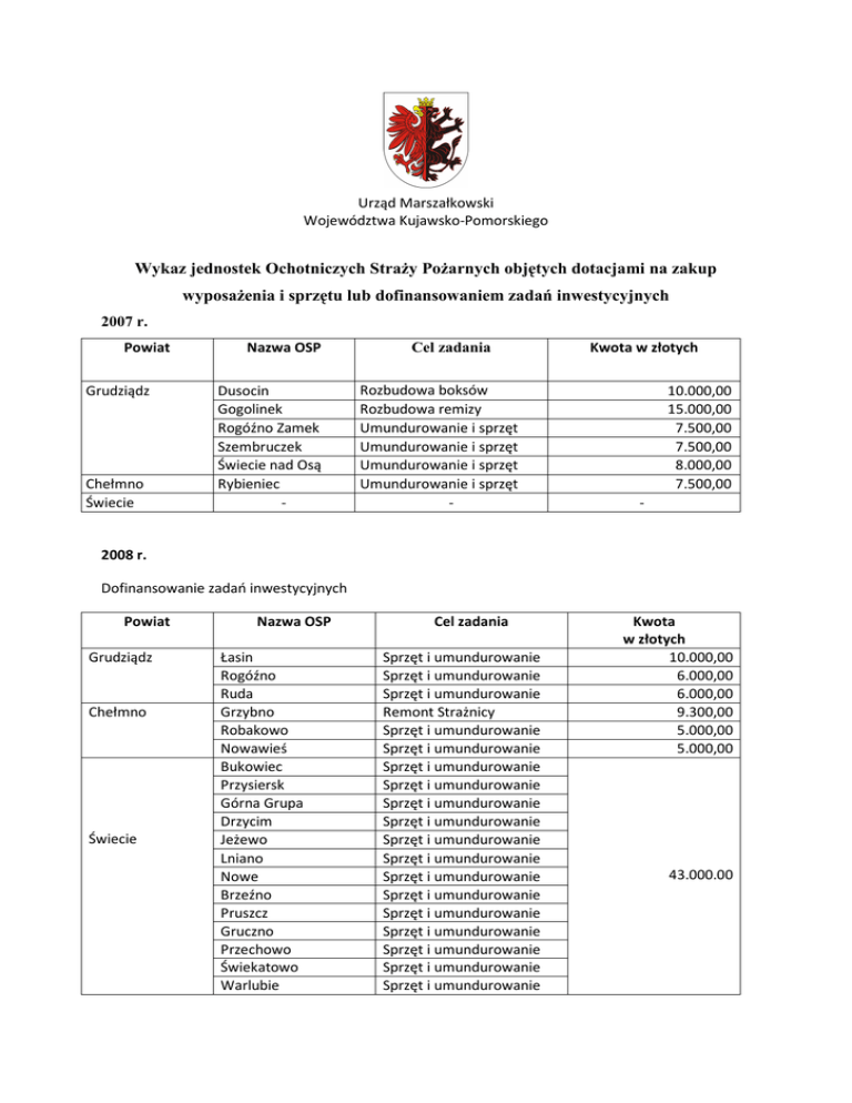 Urząd Marszałkowski Województwa Kujawsko-Pomorskiego Wykaz jednostek Ochotniczych Straży Pożarnych objętych dotacjami na zakup wyposażenia i sprzętu lub dofinansowaniem zadań inwestycyjnych 2007 r. Powiat Grudziądz Chełmno Świecie Nazwa OSP Dusocin Gogolinek Rogóźno Zamek Szembruczek Świecie nad Osą Rybieniec - Cel zadania Rozbudowa boksów Rozbudowa remizy Umundurowanie i sprzęt Umundurowanie i sprzęt Umundurowanie i sprzęt Umundurowanie i sprzęt - Kwota w złotych 10.000,00 15.000,00 7.500,00 7.500,00 8.000,00 7.500,00 - 2008 r. Dofinansowanie zadań inwestycyjnych Powiat Grudziądz Chełmno Świecie Nazwa OSP Łasin Rogóźno Ruda Grzybno Robakowo Nowawieś Bukowiec Przysiersk Górna Grupa Drzycim Jeżewo Lniano Nowe Brzeźno Pruszcz Gruczno Przechowo Świekatowo Warlubie Cel zadania Sprzęt i umundurowanie Sprzęt i umundurowanie Sprzęt i umundurowanie Remont Strażnicy Sprzęt i umundurowanie Sprzęt i umundurowanie Sprzęt i umundurowanie Sprzęt i umundurowanie Sprzęt i umundurowanie Sprzęt i umundurowanie Sprzęt i umundurowanie Sprzęt i umundurowanie Sprzęt i umundurowanie Sprzęt i umundurowanie Sprzęt i umundurowanie Sprzęt i umundurowanie Sprzęt i umundurowanie Sprzęt i umundurowanie Sprzęt i umundurowanie Kwota w złotych 10.000,00 6.000,00 6.000,00 9.300,00 5.000,00 5.000,00 43.000.00 2009 r. Powiat Grudziądz Chełmno Świecie Nazwa OSP Piaski Linowo Szonowo Papowo Biskupie Lisewo Kijewo 14 OSP Cel zadania Drabina Ubrania specjalistyczne Ubrania specjalistyczne Nożyce Pompa szlamowa Agregat i hełmy Radiostacje nasobne Kwota w złotych 16.500,00 17.500,00 35.000,00 2010 r. Nazwa powiatu Grudziądz Chełmno Świecie Nazwa OSP Rywałd Szynych Salno Bieńkówka Brzozowo Lisewo Starogród Unisław Przechowo Warlubie Przysiersk Cel zadania Sprzęt ratowniczy Sprzęt ratowniczy Sprzęt ratowniczy Sprzęt ratowniczy Sprzęt ratowniczy Sprzęt ratowniczy Sprzęt ratowniczy Sprzęt ratowniczy Sprzęt ratowniczy Sprzęt ratowniczy Sprzęt ratowniczy Kwota w złotych 10.000,00 10.000,00 5.000,00 5.000,00 5.000,00 5.000,00 5.000,00 5.000,00 8.000,00 8.500.00 8.000,00 2011 r. Nazwa powiatu Grudziądz Chełmno Świecie Nazwa OSP Świecie nad Osą Łasin Plemięta Dusocin Kijewo Królewskie Lisewo Wałdowo Świecie Błądzin Cel zadania Sprzęt ratowniczy Sprzęt ratowniczy Sprzęt ratowniczy Sprzęt ratowniczy Sprzęt ratowniczy Sprzęt ratowniczy Sprzęt ratowniczy Sprzęt ratowniczy Sprzęt ratowniczy Kwota w złotych 5.000,00 3.200,00 4.700,00 4.300,00 9.400,00 9.400,00 10.550,00 15.500,00 9.000,00 -Lata 2007-2011 – dofinansowanie z Budżetu Województwa -2012 rok - projekt „Ludziom na ratunek - zakup sprzętu specjalistycznego dla jednostek Ochotniczych Straży Pożarnych z terenu województwa kujawsko-pomorskiego - Etap I” – Regionalny Program Operacyjny Województwa Kujawsko-Pomorskiego Zestawy narzędzi hydraulicznych trafiły do OSP: -Rybieniec (powiat chełmiński), -Drzycim (powiat świecki), Motopompy pożarnicze trafiły do: -Łasin (powiat grudziądzki), -Osłowo (powiat świecki), O projekcie „Ludziom na ratunek - zakup sprzętu specjalistycznego dla jednostek Ochotniczych Straży Pożarnych z terenu województwa kujawsko-pomorskiego - Etap I” tutaj. Opracowanie: Biuro Sytuacji Kryzysowych i Bezpieczeństwa Publicznego Urzędu Marszałkowskiego Województwa Kujawsko-Pomorskiego Kwiecień 2013 r.