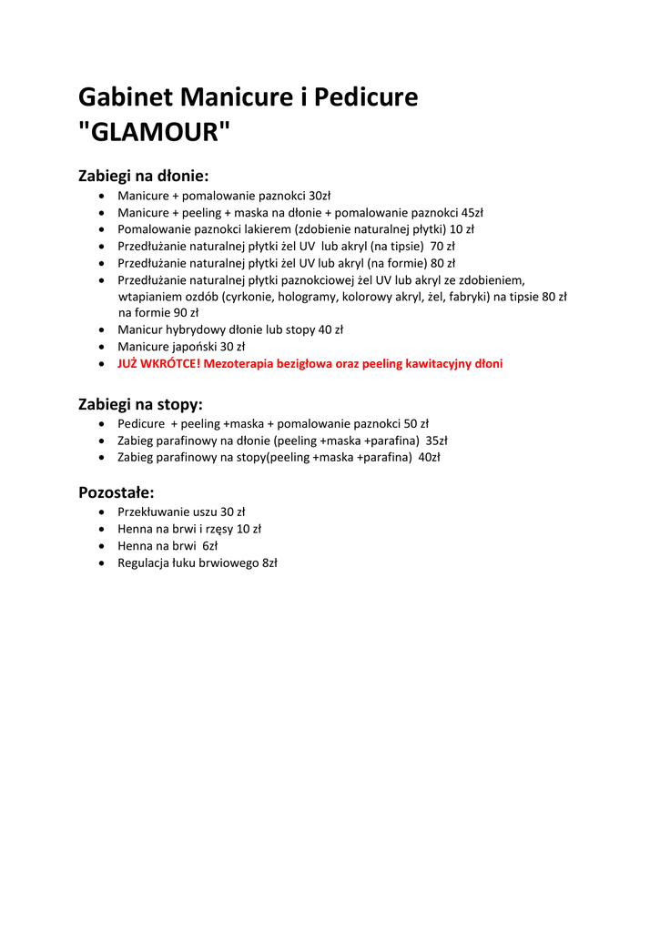 Gabinet Manicure i Pedicure "GLAMOUR" Zabiegi na dłonie: Manicure + pomalowanie paznokci 30zł Manicure + peeling + maska na dłonie + pomalowanie paznokci 45zł Pomalowanie paznokci lakierem (zdobienie naturalnej płytki) 10 zł Przedłużanie naturalnej płytki żel UV lub akryl (na tipsie) 70 zł Przedłużanie naturalnej płytki żel UV lub akryl (na formie) 80 zł Przedłużanie naturalnej płytki paznokciowej żel UV lub akryl ze zdobieniem, wtapianiem ozdób (cyrkonie, hologramy, kolorowy akryl, żel, fabryki) na tipsie 80 zł na formie 90 zł Manicur hybrydowy dłonie lub stopy 40 zł Manicure japoński 30 zł JUŻ WKRÓTCE! Mezoterapia bezigłowa oraz peeling kawitacyjny dłoni Zabiegi na stopy: Pedicure + peeling +maska + pomalowanie paznokci 50 zł Zabieg parafinowy na dłonie (peeling +maska +parafina) 35zł Zabieg parafinowy na stopy(peeling +maska +parafina) 40zł Pozostałe: Przekłuwanie uszu 30 zł Henna na brwi i rzęsy 10 zł Henna na brwi 6zł Regulacja łuku brwiowego 8zł