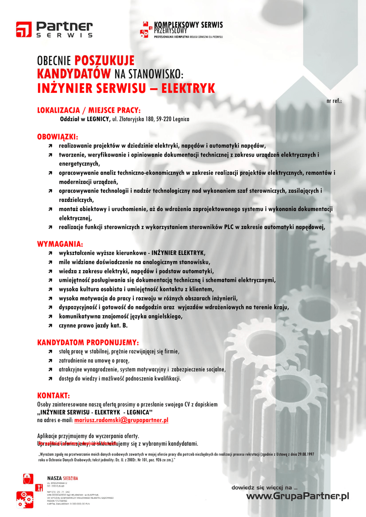 INŻYNIER SERWISU – ELEKTRYK nr ref.: LOKALIZACJA / MIEJSCE PRACY: Oddział w LEGNICY, ul. Złotoryjska 180, 59-220 Legnica OBOWIĄZKI: realizowanie projektów w dziedzinie elektryki, napędów i automatyki napędów, tworzenie, weryfikowanie i opiniowanie dokumentacji technicznej z zakresu urządzeń elektrycznych i energetycznych, opracowywanie analiz techniczno-ekonomicznych w zakresie realizacji projektów elektrycznych, remontów i modernizacji urządzeń, opracowywanie technologii i nadzór technologiczny nad wykonaniem szaf sterowniczych, zasilających i rozdzielczych, montaż obiektowy i uruchomienie, aż do wdrożenia zaprojektowanego systemu i wykonania dokumentacji elektrycznej, realizacje funkcji sterowniczych z wykorzystaniem sterowników PLC w zakresie automatyki napędowej, WYMAGANIA: wykształcenie wyższe kierunkowe - INŻYNIER ELEKTRYK, mile widziane doświadczenie na analogicznym stanowisku, wiedza z zakresu elektryki, napędów i podstaw automatyki, umiejętność posługiwania się dokumentacją techniczną i schematami elektrycznymi, wysoka kultura osobista i umiejętność kontaktu z klientem, wysoka motywacja do pracy i rozwoju w różnych obszarach inżynierii, dyspozycyjność i gotowość do nadgodzin oraz wyjazdów wdrożeniowych na terenie kraju, komunikatywna znajomość języka angielskiego, czynne prawo jazdy kat. B. KANDYDATOM PROPONUJEMY: stałą pracę w stabilnej, prężnie rozwijającej się firmie, zatrudnienie na umowę o pracę, atrakcyjne wynagrodzenie, system motywacyjny i zabezpieczenie socjalne, dostęp do wiedzy i możliwość podnoszenia kwalifikacji. KONTAKT: Osoby zainteresowane naszą ofertą prosimy o przesłanie swojego CV z dopiskiem „INŻYNIER SERWISU - ELEKTRYK - LEGNICA” na adres e-mail: [email protected] Aplikacje przyjmujemy do wyczerpania oferty. Na aplikacjiinformujemy, prosimy o dopisanie klauzuli: Uprzejmie iż skontaktujemy się z wybranymi kandydatami. „Wyrażam zgodę na przetwarzanie moich danych osobowych zawartych w mojej ofercie pracy dla potrzeb niezbędnych do realizacji procesu rekrutacji (zgodnie z Ustawą z dnia 29.08.1997 roku o Ochronie Danych Osobowych; tekst jednolity: Dz. U. z 2002r. Nr 101, poz. 926 ze zm.).”