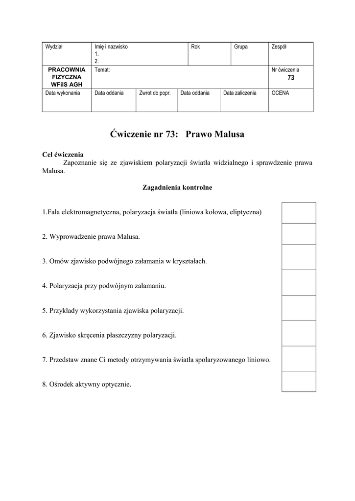 Ćwiczenie nr 73: Prawo Malusa - WFiIS
