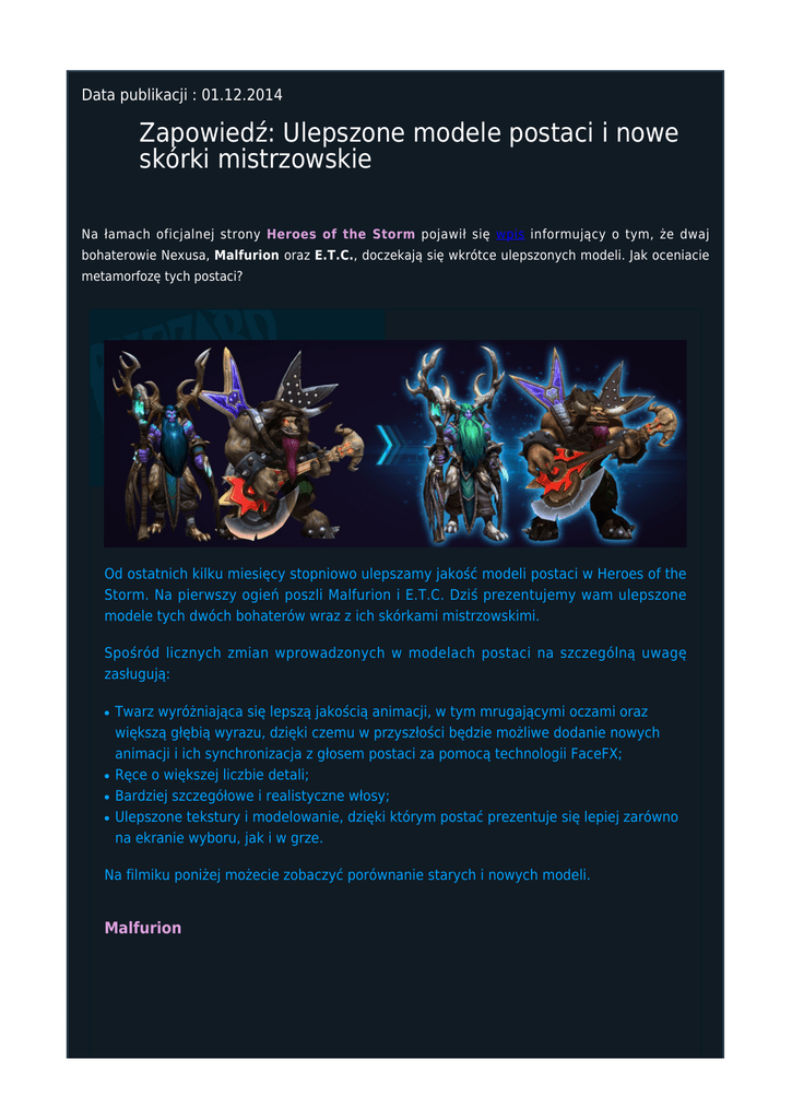 Data publikacji : 01.12.2014 Zapowiedź: Ulepszone modele postaci i nowe skórki mistrzowskie Na łamach oficjalnej strony Heroes of the Storm pojawił się wpis informujący o tym, że dwaj bohaterowie Nexusa, Malfurion oraz E.T.C., doczekają się wkrótce ulepszonych modeli. Jak oceniacie metamorfozę tych postaci? Od ostatnich kilku miesięcy stopniowo ulepszamy jakość modeli postaci w Heroes of the Storm. Na pierwszy ogień poszli Malfurion i E.T.C. Dziś prezentujemy wam ulepszone modele tych dwóch bohaterów wraz z ich skórkami mistrzowskimi. Spośród licznych zmian wprowadzonych w modelach postaci na szczególną uwagę zasługują: ● ● ● ● Twarz wyróżniająca się lepszą jakością animacji, w tym mrugającymi oczami oraz większą głębią wyrazu, dzięki czemu w przyszłości będzie możliwe dodanie nowych animacji i ich synchronizacja z głosem postaci za pomocą technologii FaceFX; Ręce o większej liczbie detali; Bardziej szczegółowe i realistyczne włosy; Ulepszone tekstury i modelowanie, dzięki którym postać prezentuje się lepiej zarówno na ekranie wyboru, jak i w grze. Na filmiku poniżej możecie zobaczyć porównanie starych i nowych modeli. Malfurion W pierwszej kolejności skupmy się na Malfurionie – największym druidzie w historii Azeroth. Nowe wersje podstawowego modelu oraz skórki Malfurion Opończa Burzy już wkrótce pojawią się w Nexusie w wysokiej rozdzielczości! Ale to nie wszystko! Mamy dla was pierwszy rzut oka na majestatyczną mistrzowską skórkę Malfuriona. Ta wariacja postawowego modelu podkreśla jego umiejętność władania siłami natury i została wzbogacona o nowy kostur, nakrycie głowy oraz ragalia należne temu potężnemu druidowi. E.T.C. Przejdźmy do Elitarnego Taureńskiego Czempiona (E.T.C.), Boga Rocka. Już wkrótce będziecie świadkami muzycznych popisów Hordy oraz ogłuszających gitarowych riffów w jeszcze lepszej jakościi! Spore ulepszenia dotknęły zarówno postawowego modelu tego bohatera, jak i skórek Glam Metalowiec E.T.C. oraz Kowboj E.T.C. Jeżeli po obejrzeniu epickich skórek powyżej nie naszła was jeszcze ochota na solidne pogo, rzućcie okiem na skórkę mistrzowską E.T.C., naszpikowaną kolcami i zakręconym orężem, która już niedługo zawojuje ciężkim brzmieniem wszystkie sceny w Nexusie. Mamy nadzieję, że podobają wam się zaprezentowane powyżej nowe modele i skórki Malfuriona oraz E.T.C. Dajcie znać w komentarzach, które szczególnie przypadły wam do gustu! Źródło: Battle.net Autor: Sigmar Liczba wyświetleń strony: 3379 Data publikacji : 01.12.2014 Tagi: Malfurion, skórki, ETC, skórki mistrzowskie Komentarz (4) dodaj komentarz Jestem pod wrażeniem, postarali się :)~Mezmar 2014/12/01 20:47 Zgadzam się z przedmówcą.~sardu 2014/12/01 20:50 Naprawdę kozacko to wygląda :-)~BeLial Battlenet Network 2014/12/01 20:50 wow ten Master E.T.C.~VeR 2014/12/01 22:58 dodaj komentarz Pozostałe nowości DreamHack Open: Valencia 2016 - Nerchio w półfinale - live! DreamHack Valencia to jedno z największych e-sportowych wydarzeń w Europie - dlatego nie mogło zabraknąć na nim StarCrafta II! W czasie rozgrywek 96 graczy będzie konkurować o 50 000 USD oraz 5 000 punktów WCS.Data publikacji: 16.07.20161 Aktualizacja 3.4 – Duże zmiany w rankingu StarCrafta II Na oficjalnym blogu Blizzarda pojawił się nowy wpis dotyczący tym razem zmian w rankingach: Ranking StarCrafta II jest areną dla niezwykle zaciętej rywalizacji. Do walki rusza wielu uczestników, ale tylko nieliczni awansują do ścisłej czołówki.Data publikacji: 03.07.20160 Rozpoczęcie trzeciego sezonu rankingowego 2016 Trzeci sezon tegorocznych rozgrywek ligowych w StarCrafta II uważamy za otwarty! Zresetowano pulę punktów premiowych oraz rankingi i przyznano nagrody za sezon drugi roku 2016.Data publikacji: 26.06.20160 Filmowy „Warcraft” już wkrótce w księgarniach! Powieść „Warcraft”, której wydanie zbiega się z polską premierą filmu „Warcraft. Początek” w reżyserii Duncana Jonesa, do księgarń trafi już 15 czerwca. Na kartach książki czytelnicy wkroczą w nowy wymiar emocji towarzyszących bohaterom fikcyjnych światów Azeroth i Draenor. Za sprawą Christie Golden, pisarki od lat cenionej przez fanów świata Warcraft, konflikt ludzi i orków nabierze jeszcze większej intensywności.Data publikacji: 13.06.20160 Blokada obecnego sezonu i darmowa zmiana nazwy postaci Jak czytamy na oficjalnym blogu Blizzarda: Obecny sezon rankingowy zbliża się ku końcowi i wkrótce zamknięte zostaną wszystkie ligi i dywizje. Kilka dni przed rozpoczęciem nowego sezonu, darmowa zmiana nazwy postaci w StarCraft II zostanie ponownie dodana do wszystkich kont, dla których funkcja ta nie jest obecnie dostępna.Data publikacji: 12.06.20160 Wszystkie nowości