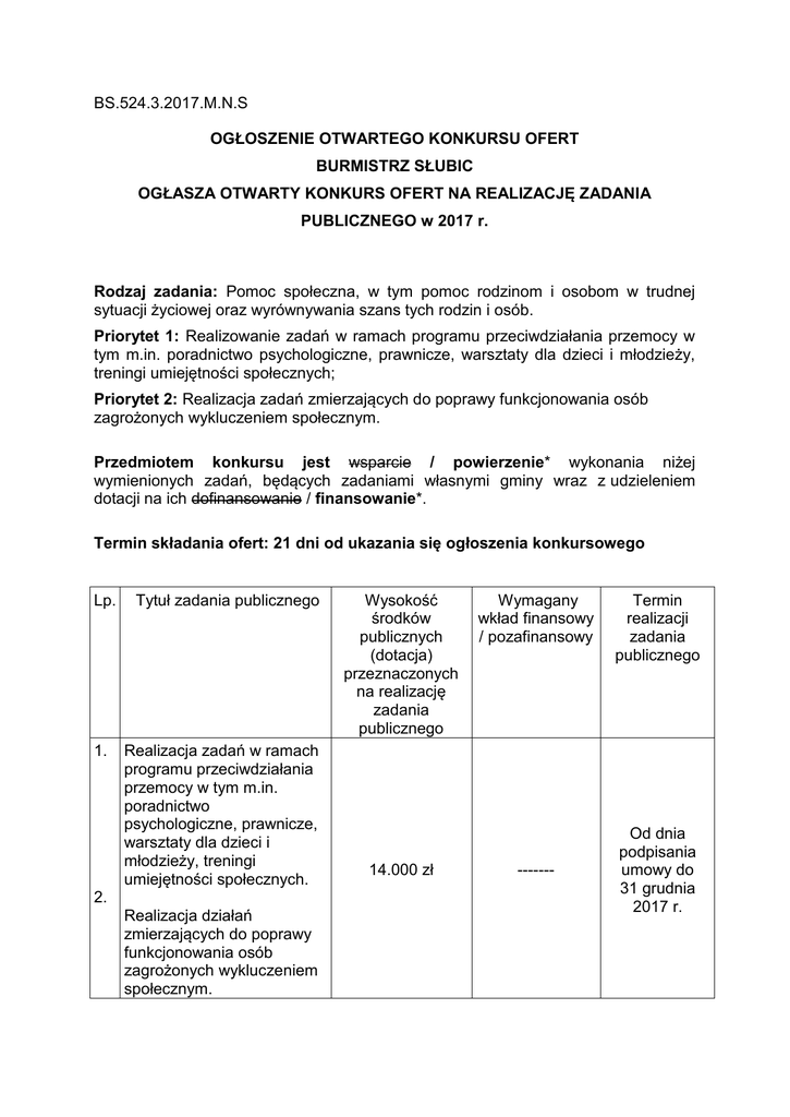 BS.524.3.2017.M.N.S OGŁOSZENIE OTWARTEGO KONKURSU OFERT BURMISTRZ SŁUBIC OGŁASZA OTWARTY KONKURS OFERT NA REALIZACJĘ ZADANIA PUBLICZNEGO w 2017 r. Rodzaj zadania: Pomoc społeczna, w tym pomoc rodzinom i osobom w trudnej sytuacji życiowej oraz wyrównywania szans tych rodzin i osób. Priorytet 1: Realizowanie zadań w ramach programu przeciwdziałania przemocy w tym m.in. poradnictwo psychologiczne, prawnicze, warsztaty dla dzieci i młodzieży, treningi umiejętności społecznych; Priorytet 2: Realizacja zadań zmierzających do poprawy funkcjonowania osób zagrożonych wykluczeniem społecznym. Przedmiotem konkursu jest wsparcie / powierzenie* wykonania niżej wymienionych zadań, będących zadaniami własnymi gminy wraz z udzieleniem dotacji na ich dofinansowanie / finansowanie*. Termin składania ofert: 21 dni od ukazania się ogłoszenia konkursowego Lp. 1. Tytuł zadania publicznego Realizacja zadań w ramach programu przeciwdziałania przemocy w tym m.in. poradnictwo psychologiczne, prawnicze, warsztaty dla dzieci i młodzieży, treningi umiejętności społecznych. 2. Realizacja działań zmierzających do poprawy funkcjonowania osób zagrożonych wykluczeniem społecznym. Wysokość środków publicznych (dotacja) przeznaczonych na realizację zadania publicznego 14.000 zł Wymagany wkład finansowy / pozafinansowy ------- Termin realizacji zadania publicznego Od dnia podpisania umowy do 31 grudnia 2017 r. Ilekroć w niniejszym ogłoszeniu jest mowa o organizacji pozarządowej – należy przez to rozumieć organizacje pozarządowe, o których mowa w art. 3 ust 2 ustawy oraz inne podmioty prowadzące działalność pożytku publicznego, o których mowa w art. 3 ust. 3 ustawy z dnia 24 kwietnia 2003 r. o działalności pożytku publicznego i o wolontariacie (j.t. z 2016 r. Dz. U. poz. 1817) I. Zasady przyznawania dotacji: 1. Szczegółowe zasady przyznawania i rozliczania dotacji określa zarządzenie nr 71/2014 Kierownika Urzędu Miejskiego w Słubicach z dnia 5 grudnia 2014 r. w sprawie zasad przyznawania i rozliczania dotacji udzielanych z budżetu Gminy Słubice organizacjom pozarządowym oraz innym podmiotom prowadzącym działalność pożytku publicznego. 2. Dotację na realizację zadania otrzymają organizacje pozarządowe, których oferty zostaną uznane za najkorzystniejsze. 3. Złożenie oferty nie jest równoznaczne z przyznaniem dotacji i nie gwarantuje przyznania środków w wysokości, o którą występuje organizacja pozarządowa. 4. Szczegółowe warunki dofinansowania / finansowania realizacji zadania reguluje umowa zawarta pomiędzy Gminą Słubice, a organizacją pozarządową. 5. Prawa i obowiązki dotyczące realizacji zadania nie mogą być przenoszone na inne organizacje pozarządowe. 6. W otwartym konkursie ofert może zostać wybrana więcej niż jedna oferta. II. Termin i warunki realizacji zadania publicznego: 1. Zadanie winno być zrealizowane na rzecz mieszkańców gminy Słubice w okresie wskazanym w ogłoszeniu z zastrzeżeniem, że szczegółowy termin realizacji zadania zostanie określony w umowie. 2. Zadanie winno być zrealizowane z najwyższą starannością, a przyznane środki finansowe winny zostać wykorzystane zgodnie z celem, efektywnie, oszczędnie terminowo przy kontroli i ocenie organu przyznającego dotację. III. Termin i warunki składania ofert: 1.Warunkiem przystąpienia do otwartego konkursu ofert jest złożenie w terminie do dnia 23 lutego 2017 r. pisemnej oferty zgodnej z Rozporządzeniem Ministra Rodziny, Pracy i Polityki Społecznej z dnia 17 sierpnia 2016 r. w sprawie uproszczonego wzoru ofert i uproszczonego wzoru sprawozdania z realizacji zadania publicznego (Dz. U. z 2016 r. poz. 1300) wraz z wymaganymi załącznikami, w zamkniętej kopercie z dopiskiem „Otwarty konkurs ofert – zadanie pn. „ Pomoc społeczna, w tym pomoc rodzinom i osobom w trudnej sytuacji życiowej oraz wyrównywania szans tych rodzin i osób” – w jeden z poniższych sposobów: 1) osobiście w sekretariacie Urzędu Miejskiego w Słubicach, ul. Akademicka 1, I piętro, pok. 118; 2) przesyłką poleconą na adres sekretariatu Urzędu Miejskiego w Słubicach ul. Akademicka 1 (o zachowaniu terminu złożenia oferty decyduje data nadania przesyłki); 3) w formie dokumentu elektronicznego (o zachowaniu terminu złożenia oferty decyduje data poświadczenia odbioru). 2. Jedna organizacja pozarządowa może złożyć 1 ofertę w ramach zadania. IV. Wymagane załączniki do oferty: 1. Kopię aktualnego ze stanem faktycznym i prawnym, niezależnie od tego, kiedy został wydany odpisu lub wyciągu z właściwego rejestru lub ewidencji 1) w przypadku fundacji i stowarzyszeń - odpis z Krajowego Rejestru Sądowego; 2) w przypadku podmiotów działających na postawie przepisów o stosunku Państwa do Kościoła Katolickiego oraz innych kościołów i związków wyznaniowych – dokument poświadczający, że dany podmiot posiada osobowość prawną oraz wydane przez właściwe władze zaświadczenie o osobie / osobach upoważnionej do składania oświadczeń woli i zaciągania zobowiązań finansowych w imieniu tego podmiotu; 3) w przypadku pozostałych podmiotów – dokumenty właściwe dla danego podmiotu, potwierdzające dane jak w pkt 2. 2. Aktualny statut organizacji pozarządowej (nie dotyczy parafii i innych kościelnych osób prawnych nieposiadających statusu organizacji pożytku publicznego). 3. W przypadku składania oferty wspólnej - umowa zawarta pomiędzy organizacjami. 4. W przypadku, gdy umowę podpisują osoby inne niż umocowane do reprezentacji zgodnie ze statutem organizacji lub wpisem do właściwego rejestru, konieczne jest dołączenie pełnomocnictwa do działania w imieniu organizacji. 5. Kopie dokumentów składane łącznie z ofertą powinny być poświadczone „za zgodność z oryginałem na dzień składania oferty” przez osobę reprezentującą organizację pozarządową. V. Tryb i kryteria stosowane przy wybor
