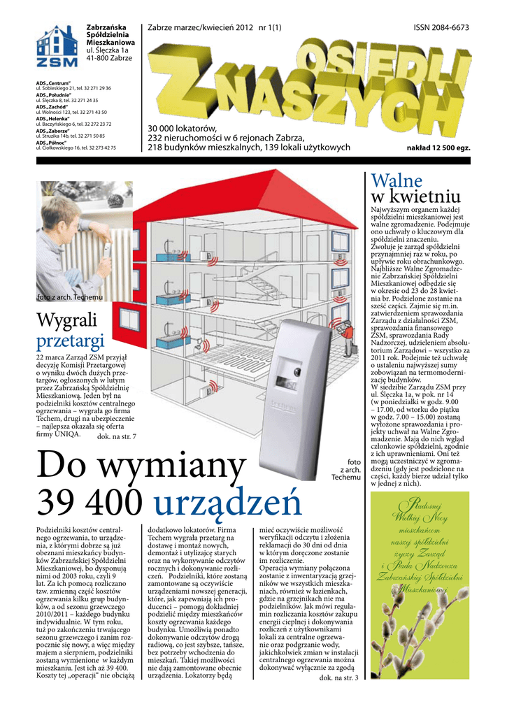 Zabrzańska Spółdzielnia Mieszkaniowa ul. Ślęczka 1a 41-800 Zabrze ADS „Centrum” ul. Sobieskiego 21, tel. 32 271 29 36 ADS „Południe” ul. Ślęczka 8, tel. 32 271 24 35 ADS „Zachód” ul. Wolności 123, tel. 32 271 43 50 ADS „Helenka” ul. Baczyńskiego 6, tel. 32 272 23 72 ADS „Zaborze” ul. Struzika 14b, tel. 32 271 50 85 ADS „Północ” ul. Ciołkowskiego 16, tel. 32 273 42 75 Zabrze marzec/kwiecień 2012 nr 1(1) ISSN 2084-6673 30 000 lokatorów, 232 nieruchomości w 6 rejonach Zabrza, 218 budynków mieszkalnych, 139 lokali użytkowych nakład 12 500 egz. Walne w kwietniu foto z arch. Techemu Wygrali przetargi 22 marca Zarząd ZSM przyjął decyzję Komisji Przetargowej o wyniku dwóch dużych przetargów, ogłoszonych w lutym przez Zabrzańską Spółdzielnię Mieszkaniową. Jeden był na podzielniki kosztów centralnego ogrzewania – wygrała go firma Techem, drugi na ubezpieczenie – najlepsza okazała się oferta firmy UNIQA. dok. na str. 7 Do wymiany 39 400 urządzeń Podzielniki kosztów centralnego ogrzewania, to urządzenia, z którymi dobrze są już obeznani mieszkańcy budynków Zabrzańskiej Spółdzielni Mieszkaniowej, bo dysponują nimi od 2003 roku, czyli 9 lat. Za ich pomocą rozliczano tzw. zmienną część kosztów ogrzewania kilku grup budynków, a od sezonu grzewczego 2010/2011 – każdego budynku indywidualnie. W tym roku, tuż po zakończeniu trwającego sezonu grzewczego i zanim rozpocznie się nowy, a więc między majem a sierpniem, podzielniki zostaną wymienione w każdym mieszkaniu. Jest ich aż 39 400. Koszty tej „operacji“ nie obciążą dodatkowo lokatorów. Firma Techem wygrała przetarg na dostawę i montaż nowych, demontaż i utylizajcę starych oraz na wykonywanie odczytów rocznych i dokonywanie rozliczeń. Podzielniki, które zostaną zamontowane są oczywiście urządzeniami nowszej generacji, które, jak zapewniają ich producenci – pomogą dokładniej podzielić między mieszkańców koszty ogrzewania każdego budynku. Umożliwią ponadto dokonywanie odczytów drogą radiową, co jest szybsze, tańsze, bez potrzeby wchodzenia do mieszkań. Takiej możliwości nie dają zamontowane obecnie urządzenia. Lokatorzy będą foto z arch. Techemu mieć oczywiście możliwość weryfikacji odczytu i złożenia reklamacji do 30 dni od dnia w którym doręczone zostanie im rozliczenie. Operacja wymiany połączona zostanie z inwentaryzacją grzejników we wszystkich mieszkaniach, również w łazienkach, gdzie na grzejnikach nie ma podzielników. Jak mówi regulamin rozliczania kosztów zakupu energii cieplnej i dokonywania rozliczeń z użytkownikami lokali za centralne ogrzewanie oraz podgrzanie wody, jakichkolwiek zmian w instalacji centralnego ogrzewania można dokonywać wyłącznie za zgodą dok. na str. 3 Najwyższym organem każdej spółdzielni mieszkaniowej jest walne zgromadzenie. Podejmuje ono uchwały o kluczowym dla spółdzielni znaczeniu. Zwołuje je zarząd spółdzielni przynajmniej raz w roku, po upływie roku obrachunkowgo. Najbliższe Walne Zgromadzenie Zabrzańskiej Spółdzielni Mieszkaniowej odbędzie się w okresie od 23 do 28 kwietnia br. Podzielone zostanie na sześć części. Zajmie się m.in. zatwierdzeniem sprawozdania Zarządu z działalności ZSM, sprawozdania finansowego ZSM, sprawozdania Rady Nadzorczej, udzieleniem absolutorium Zarządowi – wszystko za 2011 rok. Podejmie też uchwałę o ustaleniu najwyższej sumy zobowiązań na termomodernizację budynków. W siedzibie Zarządu ZSM przy ul. Ślęczka 1a, w pok. nr 14 (w poniedziałki w godz. 9.00 – 17.00, od wtorku do piątku w godz. 7.00 – 15.00) zostaną wyłożone sprawozdania i projekty uchwał na Walne Zgromadzenie. Mają do nich wgląd członkowie spółdzielni, zgodnie z ich uprawnieniami. Oni też mogą uczestniczyć w zgromadzeniu (gdy jest podzielone na części, każdy bierze udział tylko w jednej z nich). Radosnej Wielkiej Nocy mieszkańcom naszej spółdzielni życzy Zarząd i Rada Nadzorcza Zabrzańskiej Spółdzielni Mieszkaniowej 2 Media Z NASZYCH OSIEDLI marzec/kwiecień 2012 Za słodką wodę słona cena foto z archiwum ZNO Od kwietnia wszyscy mieszkańcy Zabrza płacić będą dużo więcej niż dotąd za wodę i odprowadzenie ścieków, bo Zabrzańskie Przedsiębiorstwo Wodociągów i Kanalizacji znacznie podniosło ich cenę – o ponad 2 zł za metr sześcienny. Spółdzielców z ZSM dotyczą jeszcze wewnętrzne, istotne zmiany. Każdy budynek spółdzielnia będzie rozliczała indywidualnie z ilości zużytej wody zimnej i ciepłej. Użytkownicy mieszkań będą płacić za każdy metr sześcienny wody, który wpłynie do budynku i zostanie odnotowany przez wodomierz główny, a nie tylko za to, co odnotowały wodomierze indywidualne. Trzeba bardzo oszczędnie obchodzić się z wodą, by nie płacić za nią dużo więcej niż dotąd. Wyższe ceny. Spółka komunalna – Zabrzańskie Przedsiębiorstwo Wodociągów i Kanalizacji, od której ZSM kupuje wodę, i która odprowadza ścieki, poinformowała, że od 31 marca podnosi ceny. Doprowadzenie metra sześciennego wody i odprowadzenie tej ilości ścieków kosztować będzie aż o ponad 2 złote więcej niż dotąd. W związku z tym i zgodnie z obowiązującym w spółdzielni regulaminem, od 1 kwietnia zmienia się w ZSM wysokość zaliczek wpłacanych na poczet opłat za wodę i odprowadzanie ścieków. Zaliczka na zimną wodę wyniesie 13,99 zł/ metr sześcienny, a zaliczka na ciepłą wodę w części stanowiącej opłatę zmienną – 32,00 zł/metr sześcienny. Zaliczka na opłatę stałą za ciepłą wodę nie zmieni się – wynosi 0,22 zł/metr kwadratowy powierzchni użytkowej lokalu. Zaliczki będą indywidualnie rozliczane po zakończeniu całego okresu rozliczeniowego. Tak wysoką podwyżkę Zabrzańskie Przedsiębiorstwo Wodociągów i Kanalizacji uzasadnia koniecznością spłacania kredytów zaciągniętych przez nie na modernizację siec