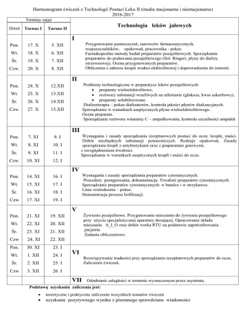 Harmonogram ćwiczeń z Technologii Postaci Leku II (studia stacjonarne i niestacjonarne) 2016-2017 Terminy zajęć Dzień Turnus I Technologia leków jałowych Turnus II I Pon. 17. X 5. XII Wt. 18. X 6. XII Śr. 19. X 7. XII Czw. 20. X 8. XII Przygotowanie pomieszczeń, surowców farmaceutycznych, rozpuszczalników, opakowań, pracownika - pokaz. Farmakopealne metody badań preparatów pozajelitowych. Sporządzanie preparatów do podawania pozajelitowego (Sol. Ringeri, płyny do dializy otrzewnowej). Ocena przygotowanych preparatów. Obliczenia z zakresu terapii wodno-elektrolitowej i doprowadzenia do izotonii. II Pon. 24. X 12.XII Wt. 25. X 13.XII Śr. 26. X 14.XII Czw. 27. X 15.XII Problemy technologiczne w preparatyce leków pozajelitowych: preparaty wieloelektrolitowe, roztwory substancji wrażliwych na utlenianie (glukoza, kwas askorbowy), preparaty solubilizowane. Dializoterapia – pokaz dializatorów, kontrola jakości płynów dializacyjnych. Sporządzanie w warunkach aseptycznych płynu wieloelektrolitowego. Ocena preparatu. Sporządzanie roztworu witaminy C – ampułkowanie, kontrola szczelności ampułek III Pon. 7. XI 9. I Wt. 8. XI 10. I Śr. 9. XI 11. I Czw. 10. XI 12. I Wymagania i zasady sporządzania recepturowych postaci do oczu: krople, maści. Dobór niezbędnych substancji pomocniczych. Rodzaje opakowań, Zasady sporządzania kropli z antybiotykami oraz z praparatami gotowymi, z uwzględnieniem trwałości. Sporządzanie w warunkach aseptycznych kropli i maści do oczu. IV Pon. 14. XI 16. I Wt. 15. XI 17. I Śr. 16. XI 18. I Czw 17. XI 19. I Wymagania i zasady sporządzania preparatów cytostatycznych. Procedury postępowania, dokumentacja. Trwałość preparatów cytostatycznych. Sporządzanie preparatów cytostatycznych: w butelce i w strzykawce. Linie wielodrożne – pokaz. Demonstracja procesu liofilizacji. V Pon. 21. XI 19. XII Wt. 22. XI 20. XII Śr. 23. XI 21. XII Czw 24. XI 22. XII Pon. 30. XI 23. I Wt. 1. XII 24. I Śr. 2. XII 25. I Czw 3. XII 26. I Żywienie pozajelitowe. Przygotowanie mieszanin do żywienia pozajelitowego przy użyciu specjalistycznej aparatury dozującej. Opracowanie składu mieszanin A_I_O oraz dobór worka RTU na podstawie zapotrzebowania pacjenta. Zadania obliczeniowe. VI Rozwiązywanie trudności przy sporządzaniu recepturowych preparatów do oczu. Zaliczenie ćwiczeń. VII Odrabianie zaległości w terminie wyznaczonym przez asystenta. Podstawą uzyskania zaliczenia jest: teoretyczne i praktyczne zaliczenie wszystkich tematów ćwiczeń uzyskanie pozytywnego wyniku z pisemnego sprawdzianu wiadomości