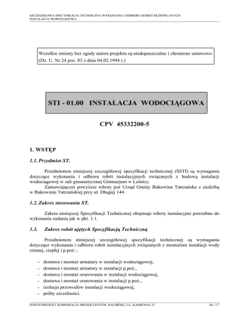 SZCZEGÓŁOWA SPECYFIKACJA TECHNICZNA WYKONANIA I ODBIORU ROBÓT BUDOWLANYCH INSTALACJA WODOCIĄGOWA Wszelkie zmiany bez zgody autora projektu są niedopuszczalne i chronione ustawowo (Dz. U. Nr 24 poz. 83 z dnia 04.02.1994 r.) STI - 01.00 INSTALACJA WODOCIĄGOWA CPV 45332200-5 1. WSTĘP 1.1. Przedmiot ST. Przedmiotem niniejszej szczegółowej specyfikacji technicznej (SSTI) są wymagania dotyczące wykonania i odbioru robót instalacyjnych związanych z budową instalacji wodociągowej w sali gimnastycznej Gimnazjum w Leśnicy. Zamawiającym powyŜsze roboty jest Urząd Gminy Bukowina Tatrzańska z siedzibą w Bukowinie Tatrzańskiej przy ul. Długiej 144. 1.2. Zakres stosowania ST. Zakres niniejszej Specyfikacji Technicznej obejmuje roboty instalacyjne potrzebne do wykonania zadania jak w pkt. 1.1. 1.3. Zakres robót ujętych Specyfikacją Techniczną Przedmiotem niniejszej szczegółowej specyfikacji technicznej są wymagania dotyczące wykonania i odbioru robót instalacyjnych związanych z montaŜem instalacji wody zimnej, ciepłej i p.poŜ.:. – – – – – – dostawa i montaŜ armatury w instalacji wodociągowej, dostawa i montaŜ armatury w instalacji p.poŜ., dostawa i montaŜ orurowania w instalacji wodociągowej, dostawa i montaŜ orurowania w instalacji p.poŜ., izolacja przewodów instalacji wodociągowej, próby szczelności. INWESTPROJEKT KORPORACJA PROJEKTANTÓW, RACIBÓRZ, UL. KAMIENNA 21 Str. 1/7 SZCZEGÓŁOWA SPECYFIKACJA TECHNICZNA WYKONANIA I ODBIORU ROBÓT BUDOWLANYCH INSTALACJA WODOCIĄGOWA 1.4. Określenia podstawowe Określenia podstawowe występujące w szczegółowej specyfikacji technicznej (SST) zdefiniowane zostały w PN-92/B-01706 – Instalacje wodociągowe. Wymagania w projektowaniu oraz są zgodne z określeniami przyjętymi w Rozporządzeniu Ministra Infrastruktury z dnia 12 kwietnia 2002 r. w sprawie warunków, jakim powinny odpowiadać budynki i ich usytuowanie, zeszycie nr 7 "Warunków Technicznych Wykonania i Odbioru Instalacji Wodociągowych" wydanych przez INSTAL, odpowiednimi normami oraz określeniami podanymi w ST "Wymagania ogólne": Instalacja wodociągowa – układ połączonych przewodów, armatury i urządzeń, słuŜące do zaopatrywania budynków w zimną i ciepłą wodę, spełniającą wymagania jakościowe określone w przepisach odrębnych dotyczących warunków, jakim powinna odpowiadać woda do spoŜycia przez ludzi. Instalacja wodociągowa wody zimnej - instalacja zimnej wody doprowadzonej z sieci wodociągowej rozpoczyna się bezpośrednio za zestawem wodomierza głównego a instalacja wody zimnej pochodzącej z własnego ujęcia (studni) od urządzenia, za pomocą którego jest pobierana woda z tego ujęcia. Instalacja wodociągowa wody ciepłej - instalacja ciepłej wody rozpoczyna się bezpośrednio za zaworem na zasilaniu zimna wodą urządzenia do przygotowania ciepłej wody. Woda do picia - woda do picia to taka woda, która jest odpowiednia do spoŜywania przez ludzi i spełnia odpowiednie przepisy zgodnie z dyrektywami EWG. Zestaw wodomierzowy - składa się z wodomierza oraz połączonych kształtek. Studzienka wodociągowa - obiekt na przewodzie wodociągowym przeznaczony do zainstalowania armatury, np. wodomierza. Urządzenie zabezpieczające - urządzenie słuŜące do ochrony jakości wody do picia, uniemoŜliwiające wtórne zanieczyszczenie wody, np. zawór antyskaŜeniowy, filtr. Armatura przepływowa instalacji wodociągowych - wszelkiego rodzaju zawory przeznaczone do sterowania przepływem wody w instalacji wodociągowej. Armatura czerpalna - wszelkiego rodzaju urządzenia przeznaczone do poboru wody z instalacji wodociągowej. Podłączenie wodociągowe – odcinek przewodu łączący źródło wody z instalacją wodociągową. Punkt czerpalny – miejsce poboru wody w obrębie obiektu budowlanego i jego otoczenia. Odcinek obliczeniowy – odcinek przewodu, dla którego prowadzi się obliczenia, charakteryzujący się umownie stałym przepływem wody i stałą średnicą. Centralne przygotowanie ciepłej wody – wspólne podgrzanie wody i doprowadzenie jej do punktów czerpalnych w obrębie obiektu budowlanego zaopatrywanego w energię cieplną. UŜytkownik instalacji – osoba fizyczna lub prawna, powołana do eksploatacji instalacji wodociągowej w obrębie obiektu budowlanego i jego otoczenia. 1.5. Ogólne wymagania dotyczące robót. INWESTPROJEKT KORPORACJA PROJEKTANTÓW, RACIBÓRZ, UL. KAMIENNA 21 Str. 2/7 SZCZEGÓŁOWA SPECYFIKACJA TECHNICZNA WYKONANIA I ODBIORU ROBÓT BUDOWLANYCH INSTALACJA WODOCIĄGOWA Ogólne wymagania dotyczące robót jak w pkt. 1.5 STI - 00.00. Wykonawca robót jest odpowiedzialny za jakość wykonania robót oraz za zgodność z dokumentacją projektową, postanowieniami zawartymi w zeszycie nr 7 WTWiO dla instalacji wodociągowych, szczegółową specyfikacja techniczną i poleceniami Inspektora nadzoru. 2. MATERIAŁY Wszystkie materiały uŜyte przy montaŜu instalacji wody winny spełniać wymagania ogólne zawarte w STI - 00.00 pkt 2. Materiały stosowane do montaŜu instalacji wodociągowych powinny mieć: - oznakowanie znakiem CE co oznacza, Ŝe dokonano oceny ich zgodności ze zharmonizowaną normą europejską wprowadzoną do zbioru Polskich Norm, z europejską aprobatą techniczną lub krajową specyfikacją techniczną państwa członkowskiego Unii Europejskiej lub Europejskiego Obszaru Gospodarczego, uznaną przez Komisję Europejską za zgodną z wymaganiami podstawowymi, lub - deklarację zgodności z uznanymi regułami sztuki budowlanej wydaną przez producenta, jeŜeli dotyczy ona wyrobu umieszczonego w wykazie wyrobów mających niewielkie znaczenie dla zdrowia i bezpieczeństwa określonym przez Komisję Europejską, lub - oznakowanie znakiem budowlanym, co oznacza, Ŝe są to wyroby nie podlegające obowiązkowemu oznakowaniu CE, dla których dokonano oceny zgodności z Polską Normą lub aprobatą techniczną, bądź uznano za "regionalny wyrób budowla