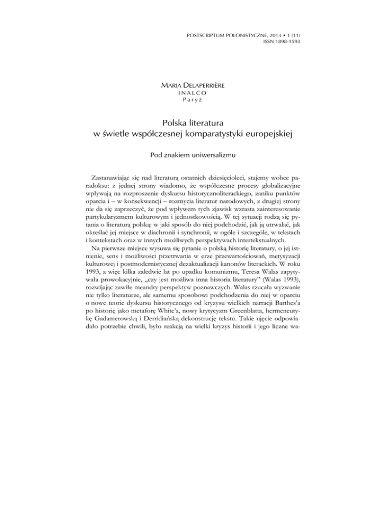 POSTSCRIPTUM POLONISTYCZNE, 2013 • 1 (11) ISSN 1898-1593 MARIA DELAPERRIÈRE INALCO Paryż Polska literatura w świetle współczesnej komparatystyki europejskiej Pod znakiem uniwersalizmu Zastanawiając się nad literaturą ostatnich dziesięcioleci, stajemy wobec paradoksu: z jednej strony wiadomo, że współczesne procesy globalizacyjne wpływają na rozproszenie dyskursu historycznoliterackiego, zaniku punktów oparcia i – w konsekwencji – rozmycia literatur narodowych, z drugiej strony nie da się zaprzeczyć, że pod wpływem tych zjawisk wzrasta zainteresowanie partykularyzmem kulturowym i jednostkowością. W tej sytuacji rodzą się pytania o literaturą polską: w jaki sposób do niej podchodzić, jak ją utrwalać, jak określać jej miejsce w diachronii i synchronii, w ogóle i szczególe, w tekstach i kontekstach oraz w innych możliwych perspektywach intertekstualnych. Na pierwsze miejsce wysuwa się pytanie o polską historię literatury, o jej istnienie, sens i możliwości przetrwania w erze przewartościowań, metysyzacji kulturowej i postmodernistycznej dezaktualizacji kanonów literackich. W roku 1993, a więc kilka zaledwie lat po upadku komunizmu, Teresa Walas zapytywała prowokacyjnie, „czy jest możliwa inna historia literatury” (Walas 1993), rozwijając zawiłe meandry perspektyw poznawczych. Walas rzucała wyzwanie nie tylko literaturze, ale samemu sposobowi podchodzenia do niej w oparciu o nowe teorie dyskursu historycznego od kryzysu wielkich narracji Barthes’a po historię jako metaforę White’a, nowy krytycyzm Greenblatta, hermeneutykę Gadamerowską i Derridiańską dekonstrucję tekstu. Takie ujęcie odpowiadało potrzebie chwili, było reakcją na wielki kryzys historii i jego liczne wa- 30 POSTSCRIPTUM POLONISTYCZNE, 2013 • 1 (11) rianty. Do tego dochodziła w polskim kontekście troska o odkłamanie zideologizowanej przeszłości, którą literaturoznawca dzieli do dziś z historiografem1. Po upływie dwudziestu blisko lat rodzą się nowe niepokoje już nie tylko dotyczące stosunku polskiej literatury do przeszłości, ale także jej miejsca hic et nunc, w obszarze globalnej wioski. Niepokoje te nie miałyby uzasadnienia, gdyby nie gwałtowne zmiany w podejściu do literatury (czy szerzej kultury), w którym zacierają się dotychczasowe podziały i hierarchie. W nowym kontekście kulturowym wyłania się potrzeba nowego zdefiniowania polskiej tożsamości narodowej, która jeszcze do niedawna kształtowała się w ścisłej symbiozie z kulturą europejską i w oparciu o europejski model wartości uniwersalnych. Przypomnijmy, że w XIX wieku wizja Weltliteratur Goethego nie wchodziła w kolizje z Herderowskim powołaniem literatur narodowych. Sam Goethe rozwijał działalność translatorską, sięgając nie tylko po literaturę zachodnioeuropejską (francuską lub włoską), ale także arabską, chińską, hebrajską, perską. Sama ponadczasowość literatury zdawała się łagodzić historyczne opozycje i konflikty geopolityczne. Literatura polska wpisywała się wtedy naturalnie w kulturę europejską właśnie dlatego, że paradoksalnie mogła w niej odkryć i dzięki niej umocnić własną tożsamość narodową. Jeszcze w epoce romantyzmu kosmopolityzm kulturalny nie był dowodem odrzucenia swojskości, ale naturalnym jej poszerzeniem, czego był już świadom młody Mickiewicz podkreślający swą potrójną tożsamość Litwina, Polaka i Europejczyka. Dopiero w zderzeniu z nowoczesnością integralność kultury europejskiej okazuje się metaforyczną iluzją. Gwałtowny zwrot nastąpił po drugiej wojnie światowej. Kultura europejska znalazła się na cenzurowanym: nie przyniosła ocalenia, nie wybroniła przed zagładą. Wyrok na nią podpisywali sami pisarze i myśliciele: Thomas Mann, Theodor Adorno, Paul Celan. W reakcji na kryzys duchowy nowoczesnej Europy rodziły się wspaniałe dzieła Paula Hazarda, Paula Van Tieghena, Ericha Auerbacha, Karla Curtiusa, ale nie zdołały one powstrzymać ogólnych procesów „odczarowania świata” i ściśle z nimi związanej wizji upadku cywilizacji Zachodu2. Wśród licznych prac, które pojawiły się pod koniec pierwszej dekady XXI wieku warto przypomnieć szkice zgrupowane w „Tekstach drugich” z 2008, w numerze 4; są to m.in. Miejsca pamięci Andrzeja Szpocińskiego (s. 11–21), Od poetyki przestrzeni do polityki miejsca, Elżbiety Rybickiej (s. 21–39), oraz Oko Innego / cudzoziemca jako możliwa perspektywa poznawcza literatury polskiej, Teresy Walas (s. 39–48). 2 Częste użycie sformułowań Maxa Webera „odczarowanie świata” (Wissenschaft als Beruf, Monachium 1919) i Osphalda Spenglera „upadek Zachodu” (Der Untergang des Abendlandes. 1 MARIA DELAPERRIÈRE: Polska literatura w świetle współczesnej komparatystyki europejskiej 31 Wraz z kryzysem ideału kultury europejskiej załamywał się europejski model Weltliteratur. René Wellek pisząc o kryzysie badań komparatystycznych, szukał rozwiązań w ahistoryzmie (Wellek 1963), René Etiemble natomiast podkreślał znaczenie kulturowych inwariantów, które można odnaleźć w każdej literaturze (Etiemble 1963). Polscy pisarze powojenni przeżywają te przeobrażenia na dwa sposoby. Herbert, Iwaszkiewicz, Kuśniewicz i Miłosz wpisują się w paradygmat kultury europejskiej i jednocześnie zabarwiają jej obraz resentymentem, który z czasem przerodzi się w syndrom peryferii. Pojęcia „Europy” i „Zachodu” funkcjonują u nich wymiennie, aczkolwiek wiadomo, że tylko pierwsza nazwa przywołuje archetypalne źródła wspólnoty kulturowej, podczas gdy druga kojarzy się z cywilizacyjnym od nich odcięciem. Jeszcze w latach 70. Andrzejewski, Konwicki, Rymkiewicz i Mrożek będą się zagłębiać w zawiłości polskiej tożsamości schizofrenicznej, w której opozycja między przynależnością do kultury europejskiej i tragiczną świadomością oddalenia od niej komplikuje się wyraźnie w momen