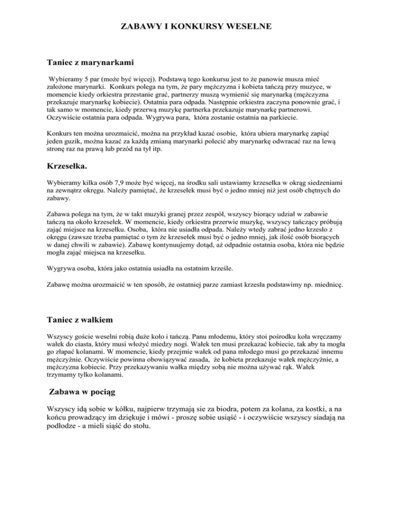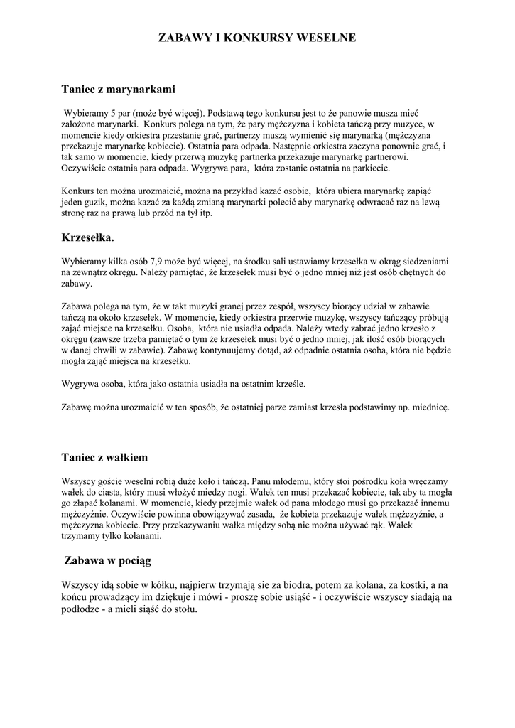 ZABAWY I KONKURSY WESELNE Taniec z marynarkami Wybieramy 5 par (może być więcej). Podstawą tego konkursu jest to że panowie musza mieć założone marynarki. Konkurs polega na tym, że pary mężczyzna i kobieta tańczą przy muzyce, w momencie kiedy orkiestra przestanie grać, partnerzy muszą wymienić się marynarką (mężczyzna przekazuje marynarkę kobiecie). Ostatnia para odpada. Następnie orkiestra zaczyna ponownie grać, i tak samo w momencie, kiedy przerwą muzykę partnerka przekazuje marynarkę partnerowi. Oczywiście ostatnia para odpada. Wygrywa para, która zostanie ostatnia na parkiecie. Konkurs ten można urozmaicić, można na przykład kazać osobie, która ubiera marynarkę zapiąć jeden guzik, można kazać za każdą zmianą marynarki polecić aby marynarkę odwracać raz na lewą stronę raz na prawą lub przód na tył itp. Krzesełka. Wybieramy kilka osób 7,9 może być więcej, na środku sali ustawiamy krzesełka w okrąg siedzeniami na zewnątrz okręgu. Należy pamiętać, że krzesełek musi być o jedno mniej niż jest osób chętnych do zabawy. Zabawa polega na tym, że w takt muzyki granej przez zespół, wszyscy biorący udział w zabawie tańczą na około krzesełek. W momencie, kiedy orkiestra przerwie muzykę, wszyscy tańczący próbują zająć miejsce na krzesełku. Osoba, która nie usiadła odpada. Należy wtedy zabrać jedno krzesło z okręgu (zawsze trzeba pamiętać o tym że krzesełek musi być o jedno mniej, jak ilość osób biorących w danej chwili w zabawie). Zabawę kontynuujemy dotąd, aż odpadnie ostatnia osoba, która nie będzie mogła zająć miejsca na krzesełku. Wygrywa osoba, która jako ostatnia usiadła na ostatnim krześle. Zabawę można urozmaicić w ten sposób, że ostatniej parze zamiast krzesła podstawimy np. miednicę. Taniec z wałkiem Wszyscy goście weselni robią duże koło i tańczą. Panu młodemu, który stoi pośrodku koła wręczamy wałek do ciasta, który musi włożyć miedzy nogi. Wałek ten musi przekazać kobiecie, tak aby ta mogła go złapać kolanami. W momencie, kiedy przejmie wałek od pana młodego musi go przekazać innemu mężczyźnie. Oczywiście powinna obowiązywać zasada, że kobieta przekazuje wałek mężczyźnie, a mężczyzna kobiecie. Przy przekazywaniu wałka między sobą nie można używać rąk. Wałek trzymamy tylko kolanami. Zabawa w pociąg Wszyscy idą sobie w kółku, najpierw trzymają sie za biodra, potem za kolana, za kostki, a na końcu prowadzący im dziękuje i mówi - proszę sobie usiąść - i oczywiście wszyscy siadają na podłodze - a mieli siąść do stołu. Taniec wykupny Zabawa ma swoje miejsce najczęściej po oczepinach. W zabawie bierze udział Para Młoda, Świadkowie i wszyscy chętni goście. Świadkowie dostają miseczki i siadają sobie pod sceną, Para Młoda rozpoczyna taniec. Goście biorący udział w tej zabawie mogą tańczyć z Parą Młodą, aby zatańczyć z Panem lub Panią Młodą należy uiścić opłatę u świadków. Zebrane pieniądze para młoda przeznacza na wcześniej określony cel( np.. kołyska, wózek lub podróż poślubna). Marynarki Wybieranych jest kilka par. Mężczyzna musi mieć ze sobą marynarkę. Zabawa polega na tym, iż wybrane pary tańczą, a na podany przez orkiestrę znak, mężczyzna zdejmuje z siebie marynarkę, przywleka ją na lewą stronę i zakłada ją ponownie. Partnerka może mu w tym pomagać. Para, która to wykona jako ostatnia, odpada. Konkurs kończy się, kiedy pozostanie tylko jedna para. Buteleczka Panu Młodemu zawiązuje się oczy, a na sznureczku( długim do ziemi) uwiązuje się np: długopis i stawia się przed nim butelkę... młoda ma za zadanie tak pokierować młodym aby trafił do butelki długopisem... jak już trafi Wodzirej mówi tak:'' i tak będzie oto wyglądała noc poślubna''. Taniec w kółeczku Zespół gra walca, a wszyscy goście tańczą w dużym kole. W czasie walca zespół nakazuje wykonywać następujące czynności: panowie biorą na ręce partnerkę łączymy się po dwie pary łączymy sie po następne dwie pary (czyli razem 4 pary) panie tańczą w środku kół panowie łapią się mocno za ręce panie siadają na rękach i łapią panów za szyje panowie tańczą w środku kół panowie odwracają się i tańczą z panią do której się odwrócili, zatrzymujemy muzykę i partnerzy stają naprzeciw siebie, a zespół w dalszym ciągu nakazuje wykonywać dalsze czynności i wskazywać palcem -moja głowa - twoja głowa - moje ucho - twoje ucho - mój nos - twój nos moja broda - twoja broda - moja pierś twoja pierś Na koniec panowie klękają na kolano i dziękują swoim partnerkom za taniec. Taniec na gazecie Para dostaje gazetę i tańczy na niej, po chwili składa się gazetę na pół i znowu na pół. Wygrywa para, która dłużej utrzyma się na jak najmniejszym kawałku gazety. Fanty Orkiestra wybiera kilka osób - najlepiej 6 - 8. Następnie ustawiane są krzesła, na których siada Młoda Para. Zadaniem wybranych osób jest przyniesienie wymienionego przez prowadzących konkurs, przedmiotu i położenie go przed młodymi. Fanty są zależne od pomysłowości orkiestry. Mogą to być: począwszy od zapałek, zegarków, szminek, pasków do spodni, grzebieni, butów, marynarek, również różnego rodzaju warzywa i owoce, gaśnice, koła samochodów, teściowe. Każdy z uczestników musi przynieść takiego samego fanta, a osoba, która zrobi to ostatnia odpada z gry. Często tutaj zdarza się, że orkiestra zbyt daleko posuwa się w podsuwaniu niekonwencjonalnych zadań, co wprawia w zakłopotanie uczestników zabawy. Taniec z figurami Wodzirej zaprasza do tańca, w kółeczku tańczymy. Panowie okręcają panie, panowie klęczą panie tańczą wokół panów i takie tam... A żeby było sprawiedliwie to w pewnym momencie wodzirej każe uklęknąć paniom (panie myślą, że teraz panowie będą tańczyć wkoło nich...), a wodzirej mówi: pa