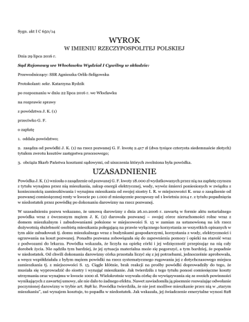 Sygn. akt I C 650/14 WYROK W IMIENIU RZECZYPOSPOLITEJ POLSKIEJ Dnia 29 lipca 2016 r. Sąd Rejonowy we Włocławku Wydział I Cywilny w składzie: Przewodniczący: SSR Agnieszka Orlik-Seligowska Protokolant: sekr. Katarzyna Rydzik po rozpoznaniu w dniu 22 lipca 2016 r. we Włocławku na rozprawie sprawy z powództwa J. K. (1) przeciwko G. F. o zapłatę 1. oddala powództwo; 2. zasądza od powódki J. K. (1) na rzecz pozwanej G. F. kwotę 2.417 zł (dwa tysiące czterysta siedemnaście złotych) tytułem zwrotu kosztów zastępstwa procesowego; 3. obciąża Skarb Państwa kosztami sądowymi, od uiszczenia których zwolniona była powódka. UZASADNIENIE Powódka J. K. (1) wniosła o zasądzenie od pozwanej G. F. kwoty 18.000 zł wydatkowanych przez nią na zapłatę czynszu z tytułu wynajmu przez nią mieszkania, zakup energii elektrycznej, wody, wywóz śmierci poniesionych w związku z koniecznością zamieszkiwania i wynajmu mieszkania od swojej siostry I. R. w miejscowości K. oraz o zasądzenie od pozwanej comiesięcznej renty w kwocie po 1.000 zł miesięcznie począwszy od 1 kwietnia 2014 r. z tytułu popadnięcia w niedostatek przez powódkę po dokonaniu darowizny na rzecz pozwanej. W uzasadnieniu pozwu wskazano, że umową darowizny z dnia 26.10.2006 r. zawartą w formie aktu notarialnego powódka wraz z ówczesnym mężem J. K. (2) darowała pozwanej – swojej córce nieruchomości rolne wraz z domem mieszkalnym i zabudowaniami położone w miejscowości S. 15 w zamian za ustanowioną na ich rzecz dożywotnią służebność osobistą mieszkania polegającą na prawie wyłącznego korzystania ze wszystkich opisanych w tym akie zabudowań tj. domu mieszkalnego wraz z budynkami gospodarczymi, korzystania z wody, elektryczności i ogrzewania na koszt pozwanej. Ponadto pozwana zobowiązała się do zapewnienia pomocy i opieki na starość wraz z podwozami do lekarza. Powódka wskazała, że liczyła na opiekę córki i jej wdzięczność przepisując na nią cały dorobek życia. Nie sądziła tym bardziej, że jej sytuacja materialna może się pogorszyć, a tym bardziej, że popadnie w niedostatek. Od chwili dokonania darowizny córka przestała liczyć się z jej potrzebami, jednocześnie aprobowała, a wręcz współdziałała z byłym mężem powódki na rzecz systematycznego rugowania jej z dotychczasowego miejsca zamieszkania tj. z miejscowości S. 15. Ciągłe kłótnie, brak reakcji na prośby powódki doprowadziły do tego, że musiała się wyprowadzić do siostry i wynająć mieszkanie. Jak twierdziła z tego tytułu ponosi comiesięczne koszty utrzymania oraz wynajmu w kwocie 1000 zł. Wielokrotnie wzywała córkę do wywiązywania się ze swoich powinności wynikających z zawartej umowy, ale nie dało to żadnego efektu. Nawet zawiadomiła ją pisemnie rozważając odwołanie poczynionej darowizny w trybie art. 898 kc. Powódka twierdziła, że nie jest możliwe mieszkanie przez nią w „starym mieszkaniu”, zaś wynajem kosztuje, to popadła w niedostatek. Jak wskazała, jej świadczenie emerytalne wynosi 828 zł i nie wystarcza na zaspokojenie podstawowych potrzeb, zaś z powodu rażącego naruszenia postanowień umownych jak i znacznego pogorszenia jej sytuacji materialnej skłaniającej do przyjęcia, że jest w niedostatku, jej roszczenia dochodzone niniejszym pozwem są zasadne i konieczne. Powódka powołując się na treść art. 897 kc zaznaczyła, że jej powództwo na podstawie przytoczonych okoliczności prawnych i faktycznych oraz przedstawionych dowodów zasługuje na uwzględnienie. W piśmie procesowym z 20 stycznia 2016 r. (k. 228-229) powódka sprecyzowała żądanie zasądzenia kwoty 18.000 zł wskazując, że dochodzona w tym zakresie pozwem kwota stanowi koszty niezbędnego utrzymania powódki tj. mieszkania, leków, opieki medycznej itp. w okresie od stycznia 2009 r. do dnia złożenia pozwu w niniejszej sprawie (7 marca 2014 r.), które to powódka otrzymywała de facto od swojej siostry, z którą w tym okresie czasu mieszkała i nadal mieszka. W przeciwnym razie stałaby się osobą bezdomną. Postanowieniem z dnia 8 grudnia 2015 r. oddalono wniosek powódki o zabezpieczenie roszczenia poprzez zobowiązanie pozwanej do uiszczania na rzecz powódki kwoty po 1000 zł miesięcznie. Pozwana G. F. wniosła o oddalenie powództwa i zasądzenie kosztów procesu, w tym kosztów zastępstwa procesowego według norm przepisanych. Wskazała, że powództwo jest bezzasadne i nie zasługuje na uwzględnienie. Argumentowała, że powódka nie popadła w niedostatek po dokonaniu darowizny, a opuszczenie domu w S. było podyktowane wyłącznie względami leżącymi po jej stronie, związaniem się z innym mężczyzną mieszkającym w K. w sąsiednim budynku do bloku, w którym mieszka jej siostra. Pozwana bowiem ani nie wyganiała powódki z miejsca zamieszkania ani też nie uniemożliwiała jej zamieszkiwania tam, wręcz przeciwnie ponosiła zgodnie z zapisami umownymi wszelkie koszty utrzymania domu w S. i ponosi je do chwili obecnej. Zatem żądanie kwot dochodzonych pozwem jest bezzasadne. Z ostrożności procesowej pozwana wniosła o oddalenie żądania podnosząc zarzut przedawnienia dochodzonych roszczeń, które w jej ocenie przedawniają się z upływem 3 lat. Sąd ustalił, co następuje: Umową darowizny z dnia 26 października 2006 r. J. K. (2) i jego żona J. K. (1) darowali na rzecz swojej córki G. F. nieruchomość położoną w gminie T., we wsi S. i S. o powierzchni 05.84.00 ha zabudowanej budynkiem mieszkalnym murowanym pod dachem krytym eternitem o siedmiu izbach i budynkiem inwentarsko-gospodarczym murowanym pod dachem krytym eternitem, dla której Sąd Rejonowy w Radziejowie prowadzi księgę wieczystą (...). Przedmiotem darowizny była również niezabudowana nieruchomość o powierzchni 02.75.00 ha oraz nieruchomość stanowiąca majątek osobisty J. K. (2). W paragrafie 4 umowy G. F. ustanowiła nieodpłatnie na rzecz J. i J. ma