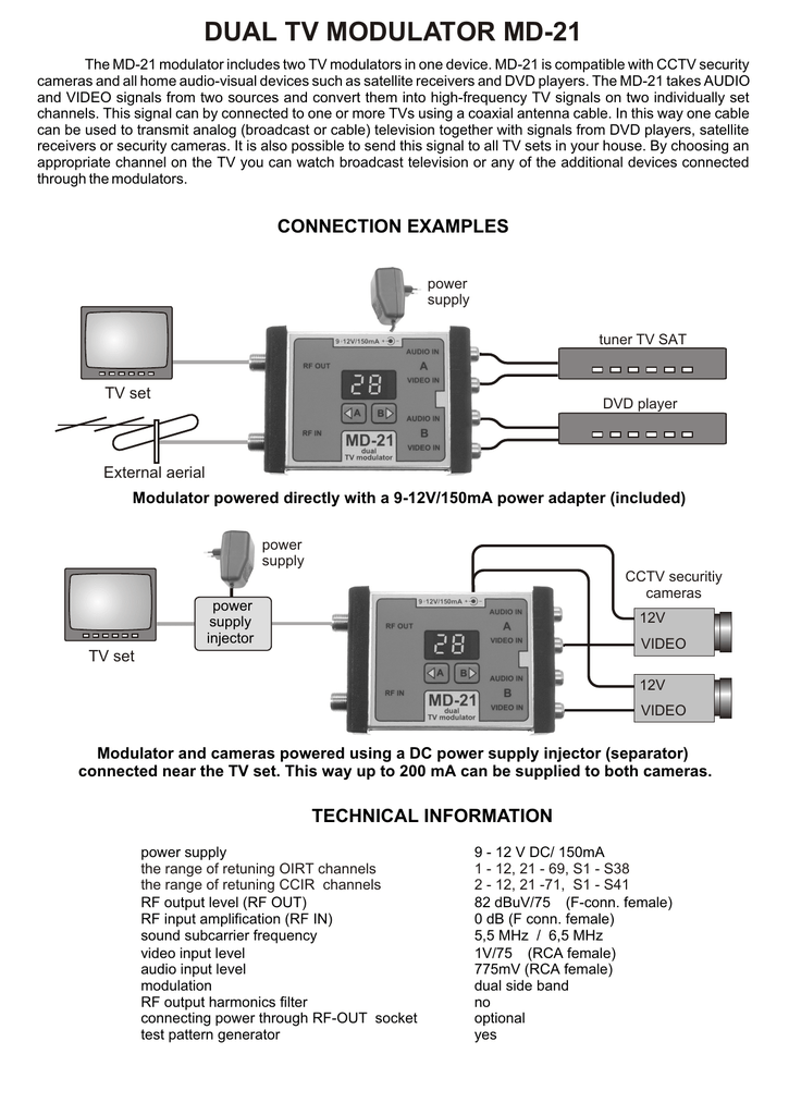 The MD-21 modulator includes two TV modulators in one device. MD-21 is compatible with CCTV security