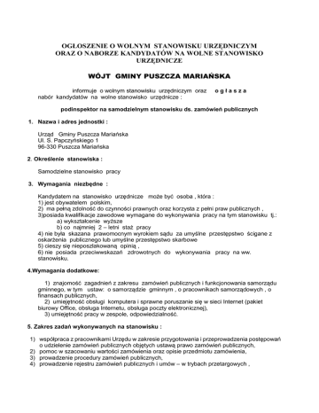 OGŁOSZENIE O WOLNYM STANOWISKU URZĘDNICZYM ORAZ O NABORZE KANDYDATÓW NA WOLNE STANOWISKO URZĘDNICZE WÓJT GMINY PUSZCZA MARIAŃSKA informuje o wolnym stanowisku urzędniczym oraz nabór kandydatów na wolne stanowisko urzędnicze : ogłasza podinspektor na samodzielnym stanowisku ds. zamówień publicznych 1. Nazwa i adres jednostki : Urząd Gminy Puszcza Mariańska Ul. S. Papczyńskiego 1 96-330 Puszcza Mariańska 2. Określenie stanowiska : Samodzielne stanowisko pracy 3. Wymagania niezbędne : Kandydatem na stanowisko urzędnicze może być osoba , która : 1) jest obywatelem polskim, 2) ma pełną zdolność do czynności prawnych oraz korzysta z pełni praw publicznych , 3)posiada kwalifikacje zawodowe wymagane do wykonywania pracy na tym stanowisku tj.: a) wykształcenie wyższe b) co najmniej 2 – letni staż pracy 4) nie była skazana prawomocnym wyrokiem sądu za umyślne przestępstwo ścigane z oskarżenia publicznego lub umyślne przestępstwo skarbowe 5) cieszy się nieposzlakowaną opinią , 6) nie posiada przeciwwskazań zdrowotnych do wykonywania pracy na ww. stanowisku. 4.Wymagania dodatkowe: 1) znajomość zagadnień z zakresu zamówień publicznych i funkcjonowania samorządu gminnego, w tym ustaw: o samorządzie gminnym , o pracownikach samorządowych , o finansach publicznych, 2) umiejętność obsługi komputera i sprawne poruszanie się w sieci Internet (pakiet biurowy Office, obsługa Internetu, obsługa poczty elektronicznej), 3) umiejętność pracy w zespole, odpowiedzialność. 5. Zakres zadań wykonywanych na stanowisku : 1) współpraca z pracownikami Urzędu w zakresie przygotowania i przeprowadzenia postępowań o udzielenie zamówień publicznych objętych ustawą prawo zamówień publicznych, 2) pomoc w szacowaniu wartości zamówienia oraz opisie przedmiotu zamówienia, 3) prowadzenie procedury zamówień publicznych, 4) prowadzenie rejestru zamówień publicznych i umów – w trybach przetargowych , 5) zamieszczanie ogłoszeń w Biuletynie Zamówień Publicznych i przekazywanie dokumentacji przetargowej na stosowne stanowisko do zamieszczenia w Biuletynie Informacji Publicznej, 6) udział w komisjach przetargowych i konkursowych, 7) przygotowywanie informacji o realizacji zamówień publicznych w Urzędzie, 8) gromadzenie i archiwizacja dokumentów zamówień publicznych, 9) składanie sprawozdań z udzielonych zamówień publicznych, 10) sporządzanie planu zamówień publicznych i planu zamówień nie objętych ustawą Prawo zamówień publicznych, 11) przygotowywanie wniosków aplikacyjnych oraz innej niezbędnej dokumentacji w celu uzyskania dofinansowania inwestycji i zadań ze źródeł zewnętrznych, w tym funduszy Unii Europejskiej, 12) zarządzanie realizowanymi projektami , w tym przygotowywanie wniosków o płatność, ankiet monitorujących, 13) prowadzenie działań w zakresie opracowywania dokumentów programowych dla Gminy , ich aktualizacja oraz monitoring realizacji zadań wynikających z tych dokumentów, 14) współpraca z innymi podmiotami w zakresie realizacji przez Gminę projektów i inwestycji z dofinansowaniem zewnętrznym. 6.Informacja o warunkach pracy na danym stanowisku : - praca w pełnym wymiarze czasu pracy , - stanowisko pracy znajduje się na piętrze budynku Urzędu Gminy, wyposażonym w meble i urządzenia biurowe , -budynek administracyjny nie jest przystosowany do potrzeb osób niepełnosprawnych (brak windy, toalet, podjazdów itp.) -praca przy monitorze ekranowym powyżej 4 godzin dziennie, 7. Wskaźnik zatrudnienia osób niepełnosprawnych W miesiącu poprzedzającym datę upublicznienia ogłoszenia wskaźnik zatrudnienia osób niepełnosprawnych w jednostce, w rozumieniu przepisów o rehabilitacji zawodowej i społecznej oraz zatrudnianiu osób niepełnosprawnych, jest niższy niż 6% . Wskaźnik ten wynosi 2,4%. 8. Wymagane dokumenty : 1) list motywacyjny podpisany odręcznie 2) CV z przebiegiem nauki i pracy zawodowej podpisane odręcznie, 3) kopia dowodu osobistego lub innego dokumentu potwierdzającego tożsamość oraz obywatelstwo kandydata (poświadczone przez kandydata za zgodność z oryginałem ), 4) kopie świadectw pracy (poświadczone przez kandydata za zgodność z oryginałem ), lub zaświadczenie o zatrudnieniu – w przypadku, gdy kandydat jest zatrudniony u innego pracodawcy , 5) kopie dokumentów potwierdzających posiadane wykształcenie i kwalifikacje zawodowe (poświadczone przez kandydata za zgodność z oryginałem), 6) oświadczenie , że kandydat ma pełną zdolność do czynności prawnych oraz, że korzysta z pełni praw publicznych, 7) oświadczenie , że kandydat nie był skazany prawomocnym wyrokiem sądu za umyślne przestępstwo ścigane z oskarżenia publicznego lub umyślne przestępstwo skarbowe , 8) oświadczenie o braku przeciwwskazań zdrowotnych do wykonywania pracy na tym stanowisku, 9) kopia dokumentu potwierdzającego niepełnosprawność w przypadku kandydata , który zamierza skorzystać z uprawnienia, o którym mowa w art. 13a ust. 2 ustawy o pracownikach samorządowych 10) podpisana odręcznie klauzula o treści” „wyrażam zgodę na przetwarzanie moich danych osobowych zawartych w ofercie pracy ,na potrzeby prowadzonej rekrutacji na stanowisko podinspektora, zgodnie z ustawą z dnia 29 sierpnia 1997 r. o ochronie danych osobowych”. 9. Termin i miejsce składania dokumentów : Oferty zawierające wymagane dokumenty należy składać w zamkniętych kopertach z podanym adresem zwrotnym i dopiskiem : „ Nabór na wolne stanowisko podinspektora” w terminie do dnia 24 stycznia 2017r. do godz. 15.00 , osobiście – w Sekretariacie Urzędu Gminy (pok. Nr 8 ) , lub pocztą na adres: Urząd Gminy Puszcza Mariańska Ul. S. Papczyńskiego 1 96-330 Puszcza Mariańska Oferty , które wpłyną do Urzędu po wyznaczonym wyżej terminie nie będą rozpatrywane . O zachowaniu terminu decyduje data wpływu do Urzędu . O dopuszczeniu do dalszego postępowania kwalifik