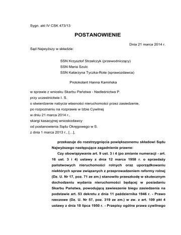 Sygn. akt IV CSK 473/13 POSTANOWIENIE Dnia 21 marca 2014 r. Sąd Najwyższy w składzie: SSN Krzysztof Strzelczyk (przewodniczący) SSN Maria Szulc SSN Katarzyna Tyczka-Rote (sprawozdawca) Protokolant Hanna Kamińska w sprawie z wniosku Skarbu Państwa - Nadleśnictwa P. przy uczestnictwie I. S. o stwierdzenie nabycia własności nieruchomości przez zasiedzenie, po rozpoznaniu na rozprawie w Izbie Cywilnej w dniu 21 marca 2014 r., skargi kasacyjnej wnioskodawcy od postanowienia Sądu Okręgowego w S. z dnia 1 marca 2013 r., […], przekazuje do rozstrzygnięcia powiększonemu składowi Sądu Najwyższego następujące zagadnienie prawne: Czy obowiązywanie art. 9 ust. 3 i 4 (po zmianie numeracji - art. 16 ust. 3 i 4) ustawy z dnia 12 marca 1958 r. o sprzedaży państwowych nieruchomości rolnych oraz uporządkowaniu niektórych spraw związanych z przeprowadzeniem reformy rolnej (Dz. U. Nr 17, poz. 71 ze zm.) stanowiło przeszkodę w skutecznym dochodzeniu wydania nieruchomości będącej w posiadaniu Skarbu Państwa, powodującą zawieszenie biegu zasiedzenia na podstawie art. 53 dekretu z dnia 11 października 1946 r. - Prawo rzeczowe (Dz. U. Nr 57, poz. 319 ze zm.) w zw. z art. 109 pkt 4 ustawy z dnia 18 lipca 1950 r. - Przepisy ogólne prawa cywilnego 2 (Dz. U. Nr 34 poz. 311) w zw. z art. XLI § 1 ustawy z dnia 23 kwietnia 1964 r. - przepisy wprowadzające kodeks cywilny (Dz. U. Nr 16 poz. 94 ze zm.) a następnie art. 175 z art. 121 pkt. 4 kc. UZASADNIENIE Wnioskodawca Skarb Państwa - Nadleśnictwo P. wystąpił o stwierdzenie, że nabył przez zasiedzenie własność nieruchomości leśnej położonej w W., o powierzchni 33.17.66 ha. Uczestnikiem postępowania jest I. S., ujawniony w księdze wieczystej nieruchomości jako jej właściciel. Sąd Rejonowy w C. postanowieniem z dnia 29 maja 2012 r. uwzględnił wniosek wskazując, że nabycie własności nastąpiło z dniem 8 października 2007 r. Ustalił, że Skarb Państwa, powołując się przepisy dekretu PKWN z dnia 12 grudnia 1944 r. o przejęciu niektórych lasów na własność Skarbu Państwa (Dz.U. Nr 15, poz. 82 ze zm.) w dniu 15 grudnia 1953 r. objął w posiadanie teren leśny o powierzchni 32,95 ha, podzielony na parcele nieprzekraczające 25 ha, stanowiący własność poprzednika prawnego uczestnika i od tego czasu prowadził na nieruchomości planową gospodarkę leśną. Sąd Rejonowy ocenił, że Skarb Państwa działał w przekonaniu – ostatecznie nieuzasadnionym, lecz usprawiedliwionym obowiązującą wówczas wykładnią przepisów dekretu - że stał się właścicielem nieruchomości, wobec czego objął ją w posiadanie w dobrej wierze, co uzasadniało zastosowanie krótszego, 20-letniego terminu zasiedzenia z art. 50 dekretu z dnia 11 października 1946 r. - Prawo rzeczowe (Dz. U. Nr 57, poz. 319). Sąd zwrócił uwagę, że w okresie od dnia 12 marca 1958 r. do dnia 1 stycznia 1992 r. obowiązywała ustawa z dnia 12 marca 1958 r. o sprzedaży nieruchomości Państwowego Funduszu Ziemi oraz o uporządkowaniu niektórych spraw związanych z przeprowadzeniem reformy rolnej i osadnictwa rolnego (tekst jedn. Dz. U 1989 Nr 58, poz. 348), która – jego zdaniem - uniemożliwiała skuteczne domaganie się zwrotu od Skarbu Państwa bezprawnie zabranych nieruchomości. Jej obowiązywanie Sąd ocenił jako równoznaczne ze stanem zawieszenia wymiaru 3 sprawiedliwości, a w konsekwencji - powodujące zawieszenie biegu zasiedzenia. W dniu 30 października 2007 r. uczestnik I. S. wytoczył przeciwko Skarbowi Państwa Nadleśnictwu P. powództwo o uzgodnienie treści księgi wieczystej z rzeczywistym stanem prawnym, w wyniku którego został wpisany jako właściciel spornej nieruchomości. Sąd Rejonowy, rozpoznając wniosek o stwierdzenie nabycia własności nieruchomości przez zasiedzenie przyjął, że wnioskodawca był posiadaczem samoistnym nieruchomości od dnia 15 grudnia 1953 r. Po uwzględnieniu czasu posiadania nieruchomości do 12 marca 1958 r., zawieszenia biegu zasiedzenia w okresie od dnia 12 marca 1958 r. do dnia 1 stycznia 1992 r. i jego dalszego biegu po zawieszeniu, Sąd Rejonowy obliczył, że 20-letni okres samoistnego posiadania nieruchomości przez wnioskodawcę upłynął z końcem dnia 7 października 2007 r. i w dniu następnym wnioskodawca uzyskał prawo własności nieruchomości, wobec czego wytoczenie przez uczestnika w dniu 30 października 2007 r. powództwa o uzgodnienie treści księgi wieczystej nie miało już wpływu na bieg zasiedzenia. Sąd Okręgowy w S., rozpoznający sprawę na skutek apelacji uczestnika, zmienił zaskarżone postanowienie i oddalił wniosek. Odwołał się do poglądu wyrażonego przez Sąd Najwyższy w uchwale pełnego składu Izby Cywilnej z dnia 26 października 2007 r. (III CZP 30/07, OSNC 2008/5/43) oraz w postanowieniu z dnia 16 września 2011 r., (IV CSK 77/11, nie publ.) i ocenił, że stan prawny uniemożliwiał właścicielowi skuteczne dochodzenie wydania nieruchomości przez cały okres od dnia objęcia jej w posiadanie przez Skarb Państwa do utraty mocy obowiązującej przez art. 9 (16) ustawy z 12 marca 1958 r., bowiem wszczęcie takiego postępowania prowadziłoby nieuchronnie do przeprowadzenia postępowania administracyjnego przewidzianego w art. 9 (16) ust. 3 ustawy i pozbawienia własności nieruchomości przejętej nieprawidłowo lecz objętej przepisami art. 9 (16) ust. 1 tej ustawy. W konsekwencji przepisy tej ustawy stanowiły przeszkodę w skutecznym windykowaniu nieruchomości przez uczestnika i jego poprzednika, uzasadniając zastosowanie art. 121 pkt 4 w zw. z art. 175 k.c. Sąd odwoławczy uznał ponadto, że Skarb Państwa objął nieruchomość w posiadanie w złej wierze. Nieruchomość została przed dniem 1 września 1939 r. podzielona na parcele nie przekraczające 25 ha i gdyby wnioskodawca zbadał czy 4 występują przesłanki z art. 1 ust 1-3 dekretu z dnia 12 grudnia 1944 r., ustaliłby, że nie było podstaw do jej p