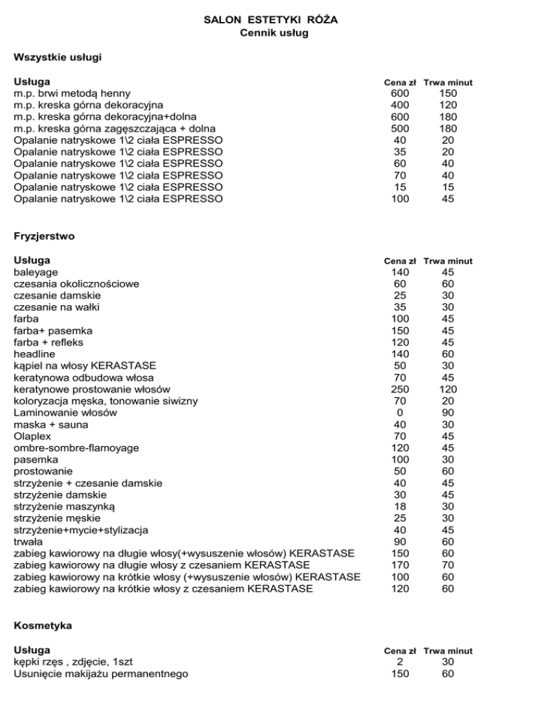 SALON ESTETYKI RÓŻA Cennik usług Wszystkie usługi Usługa m.p. brwi metodą henny m.p. kreska górna dekoracyjna m.p. kreska górna dekoracyjna+dolna m.p. kreska górna zagęszczająca + dolna Opalanie natryskowe 1\2 ciała ESPRESSO Opalanie natryskowe 1\2 ciała ESPRESSO Opalanie natryskowe 1\2 ciała ESPRESSO Opalanie natryskowe 1\2 ciała ESPRESSO Opalanie natryskowe 1\2 ciała ESPRESSO Opalanie natryskowe 1\2 ciała ESPRESSO Cena zł Trwa minut 600 400 600 500 40 35 60 70 15 100 150 120 180 180 20 20 40 40 15 45 Fryzjerstwo Usługa baleyage czesania okolicznościowe czesanie damskie czesanie na wałki farba farba+ pasemka farba + refleks headline kąpiel na włosy KERASTASE keratynowa odbudowa włosa keratynowe prostowanie włosów koloryzacja męska, tonowanie siwizny Laminowanie włosów maska + sauna Olaplex ombre-sombre-flamoyage pasemka prostowanie strzyżenie + czesanie damskie strzyżenie damskie strzyżenie maszynką strzyżenie męskie strzyżenie+mycie+stylizacja trwała zabieg kawiorowy na długie włosy(+wysuszenie włosów) KERASTASE zabieg kawiorowy na długie włosy z czesaniem KERASTASE zabieg kawiorowy na krótkie włosy (+wysuszenie włosów) KERASTASE zabieg kawiorowy na krótkie włosy z czesaniem KERASTASE Cena zł Trwa minut 140 60 25 35 100 150 120 140 50 70 250 70 0 40 70 120 100 50 40 30 18 25 40 90 150 170 100 120 45 60 30 30 45 45 45 60 30 45 120 20 90 30 45 45 30 60 45 45 30 30 45 60 60 70 60 60 Kosmetyka Usługa kępki rzęs , zdjęcie, 1szt Usunięcie makijażu permanentnego Cena zł Trwa minut 2 150 30 60 Zabiegi na ciało Usługa Opalanie natryskowe 1\2 ciała CAPPUCINO/LATTE Opalanie natryskowe 1\2 ciała ESPRESSO Opalanie natryskowe całe ciało CAPPUCINO\LATE Opalanie natryskowe całe ciało ESPRESSO Opalanie natryskowe twarz/szyja/dekolt Cena zł Trwa minut 35 40 60 70 15 20 20 40 40 15 Masaż Usługa Drenaż limfatyczny częściowy Drenaż limfatyczny nóg Masaż Antyageing poprawiający owal twarzy. Masaż antycelulitowy Masaż bańką chińską-całe ciało Masaż bańką chińską- częściowy masaż dłoni świecą Masaż głowy masaż kamieniami całe ciało masaż kamieniami częściowy Masaż klasyczny całego ciała Masaż klasyczny nóg Masaż klasyczny pleców Masaż klasyczny pleców KARNET10 Masaż klasyczny pleców KARNET3 Masaż stóp masaż świecą ciało masaż świecą plecy Masaż twarzy, szyi, dekoltu i karku Cena zł Trwa minut 40 80 40 70 70 30 20 30 120 60 70 40 40 340 105 30 90 50 40 30 60 40 60 60 40 15 30 90 50 60 30 40 40 40 30 60 30 40 Stylizacja paznokci Usługa Korekta żelu bezkwasowego Przedłużanie paznokci żelem bezkwasowym usunięcie żelu Utwardzanie płytki żelem Uzupełnienie żelu bezkwasowego Cena zł Trwa minut 60 130 30 100 90 60 120 30 90 120 Depilacja Usługa Depilacja bikini depilacja bikini brazylijskie Depilacja broda Depilacja brwi Depilacja łydki Depilacja nóg Depilacja nóg i bikini Cena zł Trwa minut 40 80 10 15 40 65 80 30 60 15 15 30 60 60 Depilacja pach depilacja rąk depilacja rąk do łokci Depilacja wąsik 25 45 30 10 20 40 30 15 Manicure Usługa Cyrkonia Svarowsky 1szt. malowanie lakierem hybrydowym Malowanie paznokci Manicure Manicure hybrydowy manicure hybrydowy french \ zdobienie manicure hybrydowy ze zdjęciem hybrydy Manicure ze zdobieniem skrócenie paznokci usunięcie hybrydy +maniciure hybrydowy + french\zdobienie usunięcie hybrydy z manicurem Usunięcie lakieru utwardzanego Zdobienie lakierami, hybrydą Cena zł Trwa minut 1 25 15 35 50 60 60 50 10 70 50 20 5 10 20 15 60 75 90 75 60 10 100 60 20 30 Pedicure Usługa 1wrastający paznokieć malowanie lakierem hybrydowym Malowanie paznokci masaż stóp z maską termiczną Odcisk pedicure franch\zdobienie Pedicure HYBRYDA Pedicure kosmetyczny Pedicure leczniczy Pedicure z lakierem skrócenie paznokci Tamponada, 1szt Usunięcie lakieru utwardzanego Wrastające paznokcie Cena zł Trwa minut 40 35 30 50 35 100 90 70 90 80 20 10 30 60 30 30 30 45 30 90 90 70 90 80 20 10 20 60 Henna Usługa Henna brwi Henna brwi i rzęs Henna rzęs henna rzęs +depilacja brwi Cena zł Trwa minut 25 30 15 25 30 30 15 30 Makijaż Usługa Makijaż mineralny Cena zł Trwa minut 100 60 Makijaż próbny, okazjonalny Makijaż wodoodporny 60 80 60 60 Zabiegi na twarz Usługa nakłuwanie skóry-zabieg oczyszczanie+piling dyniowy oczyszczanie skóry oczyszczenie skóry z jonoforezą witaminową ENVIRON piling dyniowy piling dyniowy, seria 6 w cenie 5 zabieg regenerujący z wit.C ENVIRON(jako zabieg bankietowy) zabieg regenerujący z wit.C ENVIRON(jako zabieg leczniczy) zabieg rewitalizujący ENVIRON zabieg rewitalizujący ENVIRON z roll-citem Cena zł Trwa minut 260 200 100 180 140 700 150 280 250 280 120 120 120 120 60 60 60 120 120 150 Makijaż permanentny Usługa m.p. brwi metodą włosa m.p. kontur + cień ust m.p. kontur + cień + wypełnienie m.p. kontur ust m.p. kreska dolna m.p. kreska górna Cena zł Trwa minut 500 600 750 450 250 300 120 150 180 120 120 120 Rzęsy Usługa Kępki rzęs, 1szt. Przedłużanie rzęs 1:1 Przedłużanie rzęs 2,3:1 Trwała na rzęsy Uzupełnienie rzęs 1:1 Uzupełnienie rzęs 2,3:1 Cena zł Trwa minut 3 130 180 65 65 95 30 120 180 60 60 90 Przekłuwanie uszu Usługa Przekłucie jednego ucha Przekłucie uszu Przekłucie uszu Easy piercy. Cena zł Trwa minut 20 40 58 15 15 15 Termoliza-elektroliza Usługa Usuwanie brodawek Zamykanie naczynek Cena zł Trwa minut 60 60 30 30