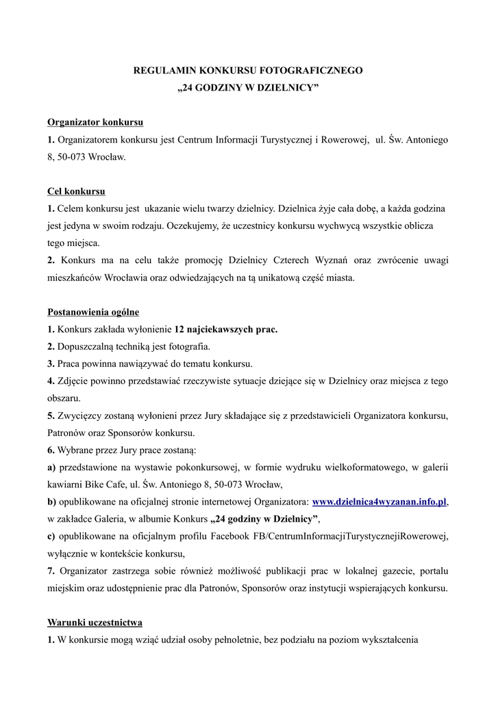 REGULAMIN KONKURSU FOTOGRAFICZNEGO „24 GODZINY W DZIELNICY” Organizator konkursu 1. Organizatorem konkursu jest Centrum Informacji Turystycznej i Rowerowej, ul. Św. Antoniego 8, 50-073 Wrocław. Cel konkursu 1. Celem konkursu jest ukazanie wielu twarzy dzielnicy. Dzielnica żyje cała dobę, a każda godzina jest jedyna w swoim rodzaju. Oczekujemy, że uczestnicy konkursu wychwycą wszystkie oblicza tego miejsca. 2. Konkurs ma na celu także promocję Dzielnicy Czterech Wyznań oraz zwrócenie uwagi mieszkańców Wrocławia oraz odwiedzających na tą unikatową część miasta. Postanowienia ogólne 1. Konkurs zakłada wyłonienie 12 najciekawszych prac. 2. Dopuszczalną techniką jest fotografia. 3. Praca powinna nawiązywać do tematu konkursu. 4. Zdjęcie powinno przedstawiać rzeczywiste sytuacje dziejące się w Dzielnicy oraz miejsca z tego obszaru. 5. Zwycięzcy zostaną wyłonieni przez Jury składające się z przedstawicieli Organizatora konkursu, Patronów oraz Sponsorów konkursu. 6. Wybrane przez Jury prace zostaną: a) przedstawione na wystawie pokonkursowej, w formie wydruku wielkoformatowego, w galerii kawiarni Bike Cafe, ul. Św. Antoniego 8, 50-073 Wrocław, b) opublikowane na oficjalnej stronie internetowej Organizatora: www.dzielnica4wyzanan.info.pl, w zakładce Galeria, w albumie Konkurs „24 godziny w Dzielnicy”, c) opublikowane na oficjalnym profilu Facebook FB/CentrumInformacjiTurystycznejiRowerowej, wyłącznie w kontekście konkursu, 7. Organizator zastrzega sobie również możliwość publikacji prac w lokalnej gazecie, portalu miejskim oraz udostępnienie prac dla Patronów, Sponsorów oraz instytucji wspierających konkursu. Warunki uczestnictwa 1. W konkursie mogą wziąć udział osoby pełnoletnie, bez podziału na poziom wykształcenia artystycznego. 2. W konkursie nie mogą brać udziału pracownicy i przedstawiciele organizatora,członkowie ich najbliższej rodziny oraz inne osoby biorące udział w przygotowaniu i prowadzeniu konkursu, członkowie jury oraz ich najbliższe rodziny. Warunki dotyczące zgłaszania prac 1. Prace konkursowe należy dostarczyć w nieprzekraczalnym terminie do dnia 31 października 2015 r. 2. Organizator zastrzega sobie prawo do wydłużenia czasu przyjmowania zgłoszeń konkursowych. 3. Każdy uczestnik może nadesłać maksymalnie 3 fotografie. 4. Fotografia może być wykonana dowlną techniką (cyfrową, tradycyjną). 5. Fotografia wykonana metodą tradycyjną musi być zapisana w postaci cyfrowej (zeskanowana). 6. Fotografie powinny zawierać dane autora: imię i nazwisko, adres zamieszkania, telefon kontaktowy, adres e-mail , opis miejsca lub zdarzenia przedstawionego na fotografii. 7. Zgłoszenia konkursowe można dostarczyć: • pocztą elektroniczną na adres e-mail: [email protected], z tytułem wiadomości KONKURS, • osobiście do Centrum Informacji Turystycznej i Rowerowej, ul. św. Antoniego 8, codziennie w godz .9.00- 20.00, • przesyłką pocztową na adres Centrum Informacji Turystycznej i Rowerowej, ul. św. Antoniego 8, 50-073 Wrocław, z dopiskiem KONKURS. 8. Prace nadsyłane pocztą elektroniczną oraz dostarczane na nośniku obrazu powinny być w formacie JPG, TIFF lub BMP w jak najwyższej rozdzielczości: nie mniejszym niż 10 Mpix, minimalnej rozdzielczość 200 dpi, umożliwiającym ich wykorzystanie w materiałach drukowanych oraz na wykonanie wydruku wielkoformatowego A1. 9. Każdy uczestnik oświadcza iż jest autorem pracy i posiada do niej pełne prawa autorskie. 10. Z autorami nagrodzonych prac, Organizator podpisze umowę o przeniesieniu autorskich praw majątkowych do fotografii. Wynagrodzenie za przeniesienie własności i nabycie autorskich praw majątkowych do fotografii stanowi przyznana nagroda. 11. Uczestnicy konkursu upoważniają Organizatora Konkursu (udzielają licencji) na zasadzie niewyłączności, do nieodpłatnego korzystania i rozporządzania zgłoszonymi do konkursu pracami, w sposób nieograniczony terytorialnie, czasowo oraz co do liczby zwielokrotnień na następujących polach eksploatacji: -utrwalania (zapisu), we wszystkich dostępnych formach, w szczególności techniką drukarską, - zwielokrotnienia na wszelkich nośnikach obrazu, - wprowadzania do obrotu w każdej formie, w szczególności w formie drukowanej, - publikowania w każdej formie, w szczególności publiczne wystawienie oraz publikacje prasowe, - udzielania nieodpłatnej licencji na wykorzystanie, udostępniania w taki sposób, aby każdy mógł mieć dostęp do prac w miejscu i czasie przez siebie wybranym, w tym poprzez Internet, publicznego odtwarzania, publicznego wyświetlania, nadawania bezprzewodowego, przewodowego, satelitarnego oraz reemisji i retransmisji, każdorazowo w kontekście ich związku z konkursem. 12. Zabrania się nadsyłania zgłoszeń, które w jakikolwiek sposób są obraźliwe lub naruszają dobre obyczaje. 13. W przypadku uwidocznienia na zdjęciu wizerunku osób trzecich, autor ma obowiązek dostarczenia ich pozwolenia na wykorzystanie ich wizerunku. W innym przypadku zdjęcie zostanie wykluczone z Konkursu. 14. Zgłoszenia, które nie będą spełniały technicznych wymogów Konkursu, zapisanych w niniejszym Regulaminie, nie będą brane pod uwagę podczas wyłaniania zwycięzców. 15. Dane osobowe przekazane Organizatorowi będą przetwarzane zgodnie z ustawą z dnia 29 sierpnia 1997 r. o ochronie danych osobowych (Dz.U. z 2002 r., Nr 101, poz. 926 ze zm.) w celu przeprowadzenia Konkursu i przekazania nagrody. Podanie danych osobowych jest dobrowolne, jednak ich nie podanie lub odmowa wyrażenia zgody na ich przetwarzanie uniemożliwia uczestniczenie w Konkursie. Wyłonienie zwycięzców 1. Konkurs podzielony jest na dwa etapy: a) I etap - z nadesłanych prac Jury wybierze 12 najciekawszych fotografii, spośród których : jednej fotografii przyznana zostanie NAGRODA GŁÓWNA . Podczas I etapu konkursu pod uwagę będą brane osobiste gusta członków Jury. b) 