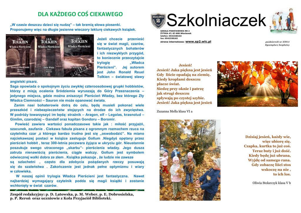 DLA KAŻDEGO COŚ CIEKAWEGO „W czasie deszczu dzieci się nudzą” – tak brzmią słowa piosenki. Proponujemy więc na długie jesienne wieczory lekturę ciekawych książek. Jeżeli chcecie przenieść się w świat magii, czarów, fantastycznych bohaterów i ich niezwykłych przygód, to koniecznie przeczytajcie trylogię „Władca Pierścieni”. Jej autorem jest John Ronald Reuel Tolkien – światowej sławy angielski pisarz. Saga opowiada o spokojnym życiu zwykłej czteroosobowej grupki hobbistów, którzy z misją ocalenia Sródziemia wyruszają do Góry Przeznaczenia – jedynego miejsca, gdzie można zniszczyć Pierścień Władzy, bez którego Zły Władca Ciemności – Sauron nie może opanować świata. Zanim nasi bohaterowie dotrą do celu, będą musieli pokonać wiele przeszkód i niebezpieczeństw stojących na drodze do ich zwycięstwa. W podróży towarzyszyć im będą: strażnik – Aragon, elf – Legolas, krasnolud – Gimlim, czarodziej – Gandalf oraz kapitan Gondoru – Boromir. Powieść zawiera wartości ponadczasowe takie jak : miłość przyjaźń, szacunek, zaufanie . Ciekawa fabuła pisana z ogromnym rozmachem rzuca na czytelnika czar ,z którego bardzo trudno jest się ,,oswobodzić”. Na miano najciekawszej postaci w książce zasługuje Gollum .Niegdyś opętany przez pierścień hobbit , teraz 300-letnia poczwara żyjąca w ukryciu gór. Nieustannie poszukuje swego utraconego „skarbu’’- pierścienia władzy. Jego dusza zatruta nienawiścią pierścienia, ciągle walczy. Gollum jest symbolem odwiecznej walki dobra ze złem . Książka pokazuje , że ludzie nie zawsze są szlachetni , często dla zdobycia pożądanych rzeczy posuwają się do szaleństwa . Zakończenie jest jednak pełne optymizmu i wiary w człowieka. W naszej opinii trylogia Władca Pierścieni jest fantastyczna. Nawet najbardziej wymagający czytelnik podda się magii książki i zostanie wchłonięty w świat czarów. Zespół redakcyjny: p. D. Latowska, p. M. Weber, p. E. Dobrosielska, p. P. Reroń oraz uczniowie z Koła Przyjaciół Biblioteki. Szkolniaczek SZKOŁA PODSTAWOWA NR 2 ŻYTNIA 47; 87-800 Włocławek telefon: 0542338163 fax: 0542338163 strona internetowa: www.sp2.wlc.pl październik nr 2/2014 Egzemplarz bezpłatny Jesień! Jesień! Jaka piękna jest jesień Gdy liście opadają na ziemię. Kiedy kroplami deszczu płacze świat. Siedzę przy oknie i patrzę jak strugi deszczu spływają po czystej szybie. Jesień! Jaka piękna jest jesień Zuzanna Mella klasa VI a Dzisiaj jesień, każdy wie, więc ubiorę się. Czapka, kurtka to już coś. Teraz buty i już dość. Kiedy będę już ubrana, Wyjdę od samego rana. Gdy zobaczę liści stos wskoczę na nie , to ich los. Oliwia Stolarczyk klasa V b Z ŻYCIA SZKOŁY W październiku w naszej szkole odbyły się szkolne etapy Kuratoryjnych Konkursów Przedmiotowych. Uczniowie z klas V i VI wzięli udział w konkursie z języka polskiego, języka angielskiego, przyrody i matematyki. Nad prawidłowym przebiegiem konkursów czuwała Dyrekcja Szkoły i poszczególne komisje. Uczestnicy wykazali się dużą wiedzą rozwiązując zadania przygotowane z każdego przedmiotu w formie testu. Uczniowie, którzy uzyskali zgodnie z regulaminem konkursów wymaganą ilośd punktów zakwalifikowali się do etapu rejonowego. Poniżej przedstawiamy listę uczniów, którzy w najbliższym czasie będą reprezentowali naszą szkołę na etapie regionalnym: Natalia Krzewina, kl. VI a z matematyki Małgorzata Ziółkowska, kl. VI a z matematyki Aleksandra Zarzycka, kl. VI a z matematyki Zofia Sztandera, kl. VI b z matematyki, przyrody i języka angielskiego Martyna Winiecka, kl. VI b z języka angielskiego Wiktor Kuchta, kl. VI b z matematyki Bartosz Lewandowski, kl. VI c z języka angielskiego Robert Spychalski, kl. VId z matematyki Patryk Daroszewski, kl. Vc z matematyki Gratulujemy i życzymy dalszych sukcesów na etapie rejonowym ! ! ! Wszystkim dziękujemy za tak liczny udział i zachęcamy do dalszej pracy ! ! Wywiad z panem Dyrektorem Januszem Ziółkowskim. W miesiącu październiku uczennice z Koła Przyjaciół Biblioteki przeprowadziły wywiad z panem Dyrektorem: Ile ma pan lat? Pięddziesiąt. Czy pan urodził się we Włocławku? Tak. Jaki jest Pana znak zodiaku? Koziorożec Czy był pan wzorowym uczniem? Tak. Czy dostał pan kiedyś uwagę? Na pewno tak. W jakim wieku rozpoczął pan pracę w szkole? W wieku 26 lat. Jak długo jest pani nauczycielem? 24 lata. Od jak dawna pracuje pan jako dyrektor naszej szkoły? Od 3 lat. Co robi dyrektor szkoły i czy trudno byd dyrektorem szkoły takiej jak nasza? Dyrektor zawiaduje pracą całej szkoły, kieruje nauczycielami, administracją, pracownikami obsługi i tym samym pośrednio kieruje uczniami i dba, aby teren szkoły był przyjazny dla uczniów. Jakie jest Pana największe marzenie, jako dyrektora szkoły? Chciałbym żeby nasza szkoła przeszła gruntowy remont, aby wyposażenie było nowoczesne. Żeby teren szkolny był ogrodzony, aby były trawniki, o które dzieci będą dbały. Chciałbym, żeby uczniowie tak się uczyli, by o nas było głośno. Czy lubi pan chipsy? Nie. Czy ma pan jakieś zwierzęta w domu? Mam psa owczarka niemieckiego. Czy lubi pan czytad książki, jeśli tak to jakie? Lubię czytad książki popularnonaukowe. Ostatnio czytałem książkę “Jak zostad milionerem’’. Pana motto na życie? Nie zastanawiad się co było wczoraj tylko myśled o tym co jest dzisiaj, co może byd jutro. Co pan woli w-f czy dyrektorowanie? w-f. Pana ulubiony kolor? Biel i granat . Ulubiony owoc? Uwielbiam wszystkie owoce i warzywa, a szczególnie jabłka. Proszę dokooczyd zdanie. Lubię uczniów, którzy... Są uśmiechnięci i pozytywnie nastawieni do życia. Proszę dokooczyd zdanie. Mam marzenie, by.. Mój najmłodszy synek urósł na ile tylko może i żeby był zdrowy i szczęśliwy, żebym ja mógł to widzied i oceniad. Dziękujemy za poświęcony nam czas,