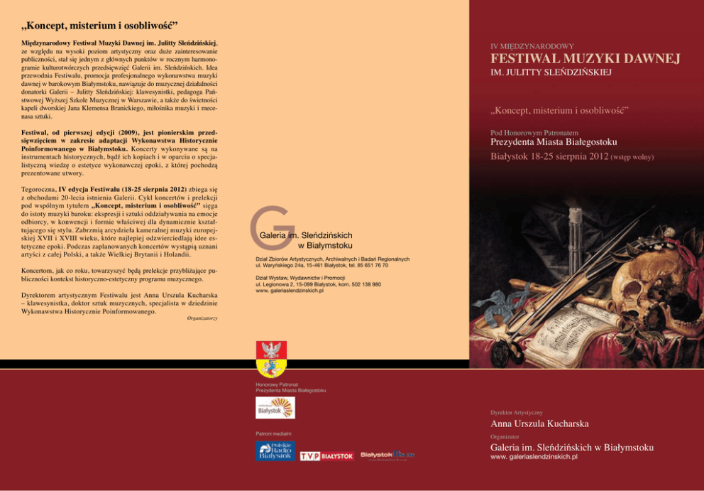 „Koncept, misterium i osobliwość” Międzynarodowy Festiwal Muzyki Dawnej im. Julitty Sleńdzińskiej, ze względu na wysoki poziom artystyczny oraz duże zainteresowanie publiczności, stał się jednym z głównych punktów w rocznym harmonogramie kulturotwórczych przedsięwzięć Galerii im. Sleńdzińskich. Idea przewodnia Festiwalu, promocja profesjonalnego wykonawstwa muzyki dawnej w barokowym Białymstoku, nawiązuje do muzycznej działalności donatorki Galerii – Julitty Sleńdzińskiej: klawesynistki, pedagoga Państwowej Wyższej Szkole Muzycznej w Warszawie, a także do świetności kapeli dworskiej Jana Klemensa Branickiego, miłośnika muzyki i mecenasa sztuki. IV MIĘDZYNARODOWY Festiwal, od pierwszej edycji (2009), jest pionierskim przedsięwzięciem w zakresie adaptacji Wykonawstwa Historycznie Poinformowanego w Białymstoku. Koncerty wykonywane są na instrumentach historycznych, bądź ich kopiach i w oparciu o specjalistyczną wiedzę o estetyce wykonawczej epoki, z której pochodzą prezentowane utwory. Pod Honorowym Patronatem Tegoroczna, IV edycja Festiwalu (18-25 sierpnia 2012) zbiega się z obchodami 20-lecia istnienia Galerii. Cykl koncertów i prelekcji pod wspólnym tytułem „Koncept, misterium i osobliwość” sięga do istoty muzyki baroku: ekspresji i sztuki oddziaływania na emocje odbiorcy, w konwencji i formie właściwej dla dynamicznie kształtującego się stylu. Zabrzmią arcydzieła kameralnej muzyki europejskiej XVII i XVIII wieku, które najlepiej odzwierciedlają idee estetyczne epoki. Podczas zaplanowanych koncertów wystąpią uznani artyści z całej Polski, a także Wielkiej Brytanii i Holandii. Koncertom, jak co roku, towarzyszyć będą prelekcje przybliżające publiczności kontekst historyczno-estetyczny programu muzycznego. Dyrektorem artystycznym Festiwalu jest Anna Urszula Kucharska – klawesynistka, doktor sztuk muzycznych, specjalista w dziedzinie Wykonawstwa Historycznie Poinformowanego. FESTIWAL MUZYKI DAWNEJ IM. JULITTY SLEŃDZIŃSKIEJ „Koncept, misterium i osobliwość” Prezydenta Miasta Białegostoku Białystok 18-25 sierpnia 2012 (wstęp wolny) G Galeria im. Sleńdzińskich w Białymstoku Dział Zbiorów Artystycznych, Archiwalnych i Badań Regionalnych ul. Waryńskiego 24a, 15-461 Białystok, tel. 85 651 76 70 Dział Wystaw, Wydawnictw i Promocji ul. Legionowa 2, 15-099 Białystok, kom. 502 138 980 www. galeriaslendzinskich.pl Organizatorzy Honorowy Patronat Prezydenta Miasta Białegostoku Dyrektor Artystyczny Patroni medialni Anna Urszula Kucharska Organizator Galeria im. Sleńdzińskich w Białymstoku www. galeriaslendzinskich.pl PROGRAM 18 sierpnia (sobota) godz. 19.30 Stary Kościół Farny, ul. Kościelna 2 Koncert Inauguracyjny „Tombeau i Lamentacja” Wykonawcy: Jerzy Łazewski - aktor Joshua Cheatham - viola da gamba Anna Urszula Kucharska - klawesyn Program: Johann Jacob Froberger (1616-1667) Tombeau uczynione w Paryżu na śmierć Pana Blancheroche Marin Marais (1656-1728) Tombeau pour Monsieur de Sainte Colombe (Pièces de Viole, II Livre, 1701) Johann Jacob Froberger (1616-1667) Lamentacja uczyniona na śmierć Jego Cesarskiej Mości Ferdynanda III (1657) Jan Pieterszoon Sweelinck (1562-1621) Moje młode życie ma swój kres Marin Marais (1656-1728) Le Tombeau pour Marais le Cadet (Pièces de Viole, V Livre, 1725) Johann Jacob Froberger (1616-1667) Suite XX in D Medytacja o mojej przyszłej śmierci... albo Memento Mori Froberger Gigue – Courante – Sarabande Marin Marais (1656-1728) Suite in G (Pièces de Viole, III Livre, 1711) Sarabande grave – Gigue à l’anglosie Chaconne in G (Pièces de Viole, V Livre, 1725) Słowo: Z manuskryptu Johanna Jacoba Frobergera (1652): opis śmierci pana Blancheroche William Szekspir - Hamlet, Akt III, Scena I, Monolog Księga Koheleta 1.2-3, 8-11; 2.1-3, 11, 22-23; 3.10-11, 12.1-2, 4-8 Księga Hioba 3.3-14, 20-23 Księga Hioba 17.1, 11-16 Księga Psalmów 130.1-6 Księga Hioba 28.1-3, 9-14, 17-18, 20-28 19 sierpnia (niedziela) godz. 18.00 Aula Magna Pałacu Branickich „Dialogo a Quatro” Wykonawcy: Judyta Tupczyńska - skrzypce barokowe Joshua Cheatham - viola da gamba Karolina Zych - flet traverso Tomasz Pokrzywiński - wiolonczela barokowa Anna Urszula Kucharska - klawesyn Jerzy Łazewski - aktor Program: Marin Marais (1656-1728) La Sonnerie de Ste. Geneviève du Mont-de-Paris (La gamme et autres morceaux de symphonie, Paryż 1723) Georg Philipp Telemann (1681-1767) I Kwartet Paryski D-dur TWV 43 (Paryż 1738) Dietrich Buxtehude (1637-1707) Sonata IV B-dur Op. 1 Georg Philipp Telemann (1681-1767) VI Kwartet Paryski e-moll TWV43 (Paryż 1738) Słowo: René Descartes - „Medytacje o Pierwszej Filozofii” (1641), fragmenty z Przedmowy i Medytacji drugiej Giovanni Bardi - „Rozważania przesłane przez Giovanniego de`Bardi Guilo Cacciniemu zwanemu Rzymianinem o muzyce dawnej i dobrym śpiewaniu”, (Florencja 1578, fragmenty) Jan Chryzostom Pasek - Pamiętniki (2 fragmenty z roku 1659) John Dowland (1562-1626) „Come again, sweet love doth now invite” (First Booke of Songes or Ayres, 1597) William Byrd (1543-1623) The Bells Henry Purcell (1659-1695) „If music be the food of love” (Z.379) - pieśń na sopran i basso continuo Suite in g (Z.661) Almand – Corant – Saraband 20 sierpnia (poniedziałek) godz. 18.00 Galeria im. Sleńdzińskich, ul. Waryńskiego 24a „Misterium i osobliwość” - recital skrzypcowy Matthew Locke (1621-1677) Suite in C z Melothesia (1673) Wykonawcy: Judyta Tupczyńska - skrzypce barokowe Anna Urszula Kucharska - klawesyn Henry Purcell (1659-1695) „Sweeter then Roses” (Z.585) Program: Heinrich Ignaz Franz von Biber (1644-1704) Sonata XIV in D „Wniebowzięcie Najświętszej Marii Panny” (Sonaty Misteryjne, Salzburg 1676) Sonata V in A „Odnalezienie w świątyni” (Sonaty Misteryjne, Salzburg 1676) Johann Kuhnau (1660-1722) Souonata secondo in g „Saul malinconico e trastullato per mezzo della Musica” (Mu