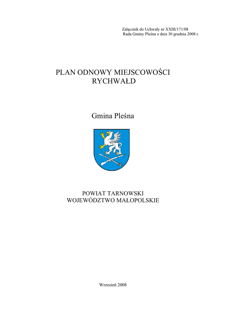 Załącznik do Uchwały nr XXIII/171/08 Rada Gminy Pleśna z dnia 30 grudnia 2008 r. PLAN ODNOWY MIEJSCOWOŚCI RYCHWAŁD Gmina Pleśna POWIAT TARNOWSKI WOJEWÓDZTWO MAŁOPOLSKIE Wrzesień 2008 PLAN ODNOWY MIEJSCOWOŚCI RYCHWAŁD SPIS TREŚCI 1.WSTĘP 2.CHARAKTERYSTYKA MIEJSCOWOŚCI 2.1. 2.2. 2.3. 2.4. 2.5. 2.6. Położenie miejscowości Przynależność administracyjna Powierzchnia i liczba ludności Szlaki komunikacyjne, dostępność komunikacyjna Położenie i środowisko przyrodnicze Historia miejscowości 3. INWENTARYZACJA - ANALIZA ZASOBÓW SOŁECTWA 3.1. ŚRODOWISKO PRZYRODNICZE 3.1.1 Zagospodarowanie przestrzenne 3.1.2 Walory krajobrazowe i klimatyczne 3.1.3 Zasoby przyrodnicze 3.2. ŚRODOWISKO KULTUROWE, ZABYTKI 3.2.1 Instytucje 3.2.2 Ukształtowanie przestrzeni publicznej 3.2.3 Walory architektury wiejskiej, zabytki 3.2.4 Osobliwości, tradycje, obrzędy, zwyczaje 3.3. OBIEKTY I TERENY 3.3.1 Tereny budowlane 3.3.2 Tereny rekreacyjno- turystyczne i sportowe 3.3.3 Tereny dla działalności gospodarczej 3.4. INFRASTRUKTURA SPOŁECZNA 3.4.1 Liczba ludności 3.4.2 Placówka oświatowa 3.4.3 Ochrona zdrowia 3.4.4 Ochrona przeciwpożarowa 3.4.5 Bezpieczeństwo publiczne 3.4.6 Organizacje pozarządowe 3.5 INFRASTRUKTURA TECHNICZNA 3.5.1 Wodociągi i zaopatrzenie w wodę 3.5.2 Kanalizacja i gospodarka ściekowa 3.5.3 Gospodarka odpadami stałymi 3.5.4 Gazyfikacja – zaopatrzenie w gaz 3.5.5 Energetyka 3.5.6 Telekomunikacja 3.6. GOSPODARKA I ROLNICTWO 3.6.1 Miejsca pracy 3.6.2 Gospodarka 3.6.3 Miejsca noclegowe, gastronomia 3.6.4 Rolnictwo 3.6.5 Przedsiębiorstwa 4. OCENA ZASOBÓW SOŁECTWA 5. MOCNE I SŁABE STRONY MIEJSCOWOŚCI 6. OPIS PLANOWANYCH ZADAŃ INWESTYCYJNYCH I PRZEDSIĘWZIĘĆ AKTYWIZUJĄCYCH SPOŁECZNOŚĆ LOKALNĄ 7. WDROŻENIE I MONITOROWANIE PLANU 2 PLAN ODNOWY MIEJSCOWOŚCI RYCHWAŁD 1.WSTĘP Wraz z rozwojem cywilizacyjnym problemy i bolączki nie są możliwe do pokonania przez działania samych mieszkańców. Głównym ograniczeniem w rozwoju sołectwa są możliwości finansowe Gminy. Jedną z dróg do poprawy jakości życia mieszkańców Rychwałdu może być pozyskiwanie funduszy zewnętrznych, między innymi z Unii Europejskiej. W związku z tym mieszkańcy opracowali Plan Odnowy Miejscowości. Plan Odnowy Miejscowości Rychwałd został opracowany przy udziale: Sołtysa, Rady Sołeckiej, Radnej, Członków Rady Parafialnej, Rolników, Powstał on w wyniku spotkań warsztatowych oraz licznych konsultacji z mieszkańcami. Koordynatorem prac ze strony Gminy Pleśna był Władysław Węgiel, z-ca wójta Gminy Pleśna. Plan Odnowy Miejscowości jest dokumentem o wielorakim znaczeniu, mającym na celu: scharakteryzowanie miejscowości, ocenienie zasobów sołectwa, wypracowanie wizji rozwoju, planowanie zadań zbieżnych z celami strategicznymi wynikającymi ze Strategii Rozwoju Gminy Pleśna 2008-2015, opracowanie wieloletniego harmonogramu zadań inwestycyjnych i przedsięwzięć, integrowanie i pobudzenie społeczności lokalnej oraz władz lokalnych do wspólnego działania na rzecz wsi, umożliwienie efektywnego gospodarowania zasobami ludzkimi środowiskowymi i finansowymi. Plan Odnowy Miejscowości ma być między innymi załącznikiem do projektów zgłaszanych w celu uzyskania pomocy finansowej w ramach działania „Odnowa i rozwój wsi” Programu Rozwoju Obszarów Wiejskich na lata 2007-2013 i w innych instytucjach finansujących. Plan Odnowy Miejscowości wypracowany został na okres 2008-2015. Zawarto w nim działania inwestycyjne, szkoleniowe, rekreacyjno-wypoczynkowe, sportowe, które zapisano w oparciu o wytyczne środowiska lokalnego i konsultacje społeczne. Podjęcie się realizacji wyznaczonych zadań poprzedzone zostanie ich przygotowaniem wraz z opisem i opracowaniem zakresu rzeczowego, określeniem kosztów i terminów wykonania. Przygotowany Plan Odnowy Miejscowości zostanie przyjęty przez Zebranie Wiejskie i stanowić będzie nierozerwalny załącznik wniosków składanych do różnych instytucji o środki finansowe. Dokumenty i materiały na podstawie, których opracowano Plan Odnowy Miejscowości Rychwałd: 1. „Strategia Rozwoju Województwa Małopolskiego”, 2. „Strategia Rozwoju Powiatu Tarnowskiego”, 3. Strategia Rozwoju Gminy Pleśna 2008-2015, 4. Statystyki UG Pleśna, 5. Oficjalna strona internetowa Gminy Pleśna. 3 PLAN ODNOWY MIEJSCOWOŚCI RYCHWAŁD 2.CHARAKTERYSTYKA MIEJSCOWOŚCI - RYCHWAŁD 2.1. Położenie miejscowości Z geograficznego punktu widzenia Rychwałd leży na skraju Pogórza Ciężkowickiego, otoczony zalesionymi stokami i rozciąga się wzdłuż potoku Rychwałdzianka uchodzącego do rzeki Biała Tarnowska. Centrum miejscowości położone jest w odległości ok.14 km na południe od Tarnowa. Rychwałd wchodzi w skład Obszaru Chronionego Krajobrazu Pogórza Ciężkowickiego pełniąc funkcję otuliny parków krajobrazowych poprzez system obszarów chronionych (Ciężkowicko-Rożnowski Park Krajobrazowy, Park Krajobrazowy Pasma Brzanki). Wieś i otoczenie odznacza się dużymi walorami krajobrazowymi. Warunki naturalne można określić jako korzystne. 2.2.Przynależność administracyjna Gminy Pleśna położona jest w granicach powiatu tarnowskiego, we wschodniej części województwa małopolskiego, na południe od Tarnowa Rychwałd jest jednym z 11 sołectw gminy. Usytuowanie Gminy Pleśna w granicach powiatu tarnowskiego Rychwałd Położenie Rychwału w granicach Gminy Pleśna 2.3.Powierzchnia i liczba ludności Powierzchnia miejscowości Rychwałd wynosi 8,16 km2 (powierzchnia gminy 83,1 km2) Pod względem obszaru jest to raczej duże sołectwo w porównaniu z innymi położonymi na terenie Gminy Pleśna. Liczba ludności wynosi 687. 4 PLAN ODNOWY MIEJSCOWOŚCI RYCHWAŁD 2.4.Szlaki komunikacyjne, dostępność komunikacyjna Sołectwo usytuowane jest przy drogach powiatowych: Rzuchowa – Pleśna – Siedliska, Lubinka – Tuchów i Tarnów – Zakliczyn. Słabo jest rozwinięta dostępność miejscowo