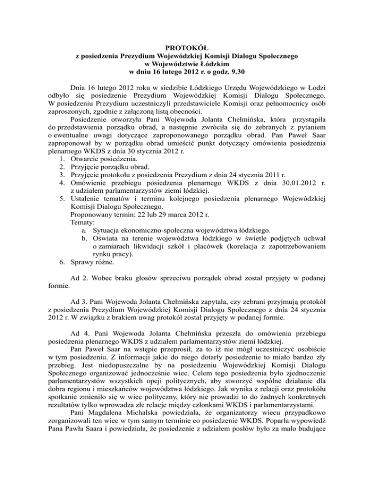 PROTOKÓŁ z posiedzenia Prezydium Wojewódzkiej Komisji Dialogu Społecznego w Województwie Łódzkim w dniu 16 lutego 2012 r. o godz. 9.30 Dnia 16 lutego 2012 roku w siedzibie Łódzkiego Urzędu Wojewódzkiego w Łodzi odbyło się posiedzenie Prezydium Wojewódzkiej Komisji Dialogu Społecznego. W posiedzeniu Prezydium uczestniczyli przedstawiciele Komisji oraz pełnomocnicy osób zaproszonych, zgodnie z załączoną listą obecności. Posiedzenie otworzyła Pani Wojewoda Jolanta Chełmińska, która przystąpiła do przedstawienia porządku obrad, a następnie zwróciła się do zebranych z pytaniem o ewentualne uwagi dotyczące zaproponowanego porządku obrad. Pan Paweł Saar zaproponował by w porządku obrad umieścić punkt dotyczący omówienia posiedzenia plenarnego WKDS z dnia 30 stycznia 2012 r. 1. Otwarcie posiedzenia. 2. Przyjęcie porządku obrad. 3. Przyjęcie protokołu z posiedzenia Prezydium z dnia 24 stycznia 2011 r. 4. Omówienie przebiegu posiedzenia plenarnego WKDS z dnia 30.01.2012 r. z udziałem parlamentarzystów ziemi łódzkiej. 5. Ustalenie tematów i terminu kolejnego posiedzenia plenarnego Wojewódzkiej Komisji Dialogu Społecznego. Proponowany termin: 22 lub 29 marca 2012 r. Tematy: a. Sytuacja ekonomiczno-społeczna województwa łódzkiego. b. Oświata na terenie województwa łódzkiego w świetle podjętych uchwał o zamiarach likwidacji szkół i placówek (korelacja z zapotrzebowaniem rynku pracy). 6. Sprawy różne. Ad 2. Wobec braku głosów sprzeciwu porządek obrad został przyjęty w podanej formie. Ad 3. Pani Wojewoda Jolanta Chełmińska zapytała, czy zebrani przyjmują protokół z posiedzenia Prezydium Wojewódzkiej Komisji Dialogu Społecznego z dnia 24 stycznia 2012 r. W związku z brakiem uwag protokół został przyjęty w podanej formie. Ad 4. Pani Wojewoda Jolanta Chełmińska przeszła do omówienia przebiegu posiedzenia plenarnego WKDS z udziałem parlamentarzystów ziemi łódzkiej. Pan Paweł Saar na wstępie przeprosił, za to iż nie mógł uczestniczyć osobiście w tym posiedzeniu. Z informacji jakie do niego dotarły posiedzenie to miało bardzo zły przebieg. Jest niedopuszczalne by na posiedzeniu Wojewódzkiej Komisji Dialogu Społecznego organizować jednocześnie wiec. Celem tego posiedzenia było zjednoczenie parlamentarzystów wszystkich opcji politycznych, aby stworzyć wspólne działanie dla dobra regionu i mieszkańców województwa łódzkiego. Jak wynika z relacji oraz protokółu spotkanie zmieniło się w wiec polityczny, który nie prowadzi to do żadnych konkretnych rezultatów tylko wprowadza złe relacje między członkami WKDS i parlamentarzystami. Pani Magdalena Michalska powiedziała, że organizatorzy wiecu przypadkowo zorganizowali ten wiec w tym samym terminie co posiedzenie WKDS. Poparła wypowiedź Pana Pawła Saara i powiedziała, że posiedzenie z udziałem posłów było za mało budujące i tworzące. Miała nadzieję, że usłyszy od posłów, że są gotowi coś wspólnie zrobić. Pan Artur Matiaszczyk stwierdził, że odniósł wrażenie, że posłowie przyjechali się tylko zaprezentować ale nic konkretnego nie mówili co by mogli zrobić dla województwa. Odnośnie manifestacji stwierdził, że była to akcja celowo zaplanowana oraz że niesmak po takim wiecu pozostaje. Pan Bogdan Osiński powiedział, że zawsze będzie tak, że społeczność niezadowolona zawsze będzie starała się wykorzystać okazję do przedstawienia własnych problemów. Należy wyciągać wnioski na przyszłość, z pewnością skuteczniejsze by było gdyby petycja została przyjęta na samym początku, podziękować i przejść do porządku obrad. Pan Marcin Szmaja powiedział, że Łódzki Urząd Wojewódzki w Łodzi już po czasie otrzymał kserokopię zgłoszenia demonstracji, która odbyła się tuż przed a później w trakcie obrad WKDS. Z pisma wynikało jednoznacznie kto jest organizatorem oraz że po spotkaniu o godzinie 9:30, czyli jak należało domniemywać że około godziny 10:00 lub później demonstranci zamierzają przekazać petycję wojewodzie, prezydentowi oraz parlamentarzystom. Organizatorem demonstracji była przedstawicielka Forum Związków Zawodowych, zgłoszenie było podpisane również przez inne organizacje związkowe należące do Komitetu Miejskich Przychodni. Pani Jolanta Chełmińska w nawiązaniu do kwestii przyjęcia petycji powiedziała, że zarówno posiedzeniami prezydium jak i plenarnymi WKDS rządzą pewne reguły, które są przestrzegane niezależnie od tego czego temat dotyczy. Na samym początku posiedzenia WKDS był zaproponowany porządek obrad do którego nikt nie wniósł uwag. Jeżeli wiadomo było że petycja ma być wręczona to powinno być to zgłoszone na samym początku posiedzenia. W takiej sytuacji gdy w trakcie bloków merytorycznych prezentowanych przez poszczególnych referentów przestawienie mi propozycji przyjęcia petycji było burzeniem pewnego porządku. W momencie dyscyplinowania referentów w kwestii poruszania się w obrębie tematów przyjętych na posiedzeniu prezydium Pan Zbigniew Jagieło zwrócił uwagę Wojewodzie w sposób przekraczający granice nawet kultury osobistej i przyzwoitości. W trakcie tego posiedzenia Pani Wojewoda zwróciła uwagę, żeby osoby zabierające głos poruszały się w obrębie tematów przyjętych na posiedzeniu prezydium i Komisji. Wszyscy członkowie WKDS wiedzieli, że kwestia kontraktowania usług przez NFZ będzie omawiana w dniu 16.02.2012 r. podczas gdy temat ten zdominował posiedzenie z dnia 30.01.2012 r. Zaprzepaszczona została szansa na zjednanie sobie parlamentarzystów w zakresie wsparcia niezmiernie ważnych tematów dla miasta i województwa. Było tak jak podsumowała pani poseł Iwona ŚledzińskaKatarasińska, że czuła się tak jak na posiedzeniach Sejmu i pozwoliliśmy po uwadze pana Zbigniewa Jagiełły na wolne wypowiedzi i to już nie było posiedzenie Komisji tylko wolna trybuna, ka