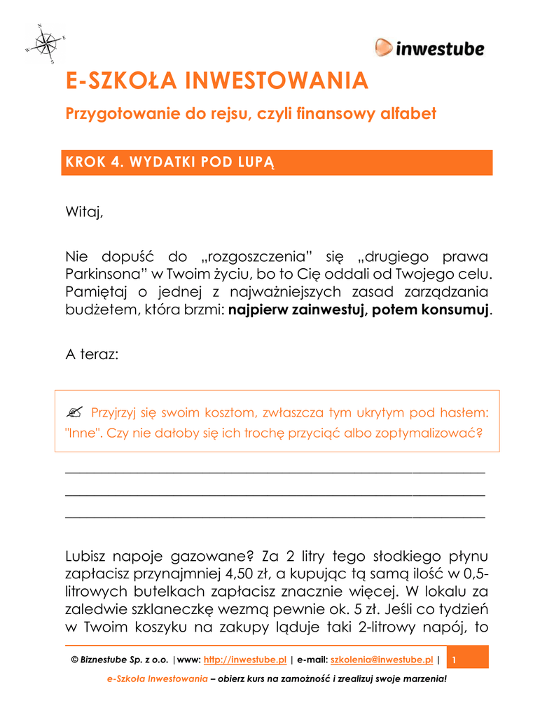 E-SZKOŁA INWESTOWANIA Przygotowanie do rejsu, czyli finansowy alfabet KROK 4. WYDATKI POD LUPĄ Witaj, Nie dopuść do „rozgoszczenia” się „drugiego prawa Parkinsona” w Twoim życiu, bo to Cię oddali od Twojego celu. Pamiętaj o jednej z najważniejszych zasad zarządzania budżetem, która brzmi: najpierw zainwestuj, potem konsumuj. A teraz: Przyjrzyj się swoim kosztom, zwłaszcza tym ukrytym pod hasłem: "Inne". Czy nie dałoby się ich trochę przyciąć albo zoptymalizować? __________________________________________________________ __________________________________________________________ __________________________________________________________ Lubisz napoje gazowane? Za 2 litry tego słodkiego płynu zapłacisz przynajmniej 4,50 zł, a kupując tą samą ilość w 0,5litrowych butelkach zapłacisz znacznie więcej. W lokalu za zaledwie szklaneczkę wezmą pewnie ok. 5 zł. Jeśli co tydzień w Twoim koszyku na zakupy ląduje taki 2-litrowy napój, to © Biznestube Sp. z o.o. |www: http://inwestube.pl | e-mail: [email protected] | e-Szkoła Inwestowania – obierz kurs na zamożność i zrealizuj swoje marzenia! 1 rocznie wydajesz na to jakieś 234 zł (przykładowe 4,5 zł/butelkę x 52 tygodnie w roku). Spójrz na swoje wydatki okiem inwestora. Zapisz poniżej, których produktów możesz kupować mniej i czy mógłbyś w ramach tego samego budżetu kupić sobie jakieś aktywa, np. związane z tymi produktami akcje ich producenta? __________________________________________________________ __________________________________________________________ __________________________________________________________ __________________________________________________________ Małe kwoty bardzo łatwo się wydaje. Czasem nawet ciężko sobie przypomnieć na co poszło 10 czy 20 zł z budżetu. Jednak te małe wydatki w ciągu miesiąca mogą się skumulować w całkiem pokaźną sumkę. Weź pod lupę swoje drobne wydatki i sprawdź ile w sumie zabierają z Twojego budżetu. Zastanów się, czy nie dałoby się trochę tu zaoszczędzić. Może przenieść konto do banku, który nie pobiera opłat za prowadzenie rachunku? Może prenumerata Twojej ulubionej gazety wyjdzie Cię taniej? A może oferują jeszcze tańsze e-wydanie? __________________________________________________________ __________________________________________________________ __________________________________________________________ © Biznestube Sp. z o.o. |www: http://inwestube.pl | e-mail: [email protected] | e-Szkoła Inwestowania – obierz kurs na zamożność i zrealizuj swoje marzenia! 2 Twoje zadanie na dziś: przyjrzyj się swoim wydatkom i zastanów się, czy można zminimalizować niektóre z Twoich kosztów. Ale UWAGA – bez zaciskania pasa! PO PRZEANALIZOWANIU MOICH KOSZTÓW UDAŁO MI SIĘ ZAOSZCZĘDZIĆ: .......................... ZŁ A w następnym kroku będziemy wyczarowywać pieniądze na inwestycje © Biznestube Sp. z o.o. |www: http://inwestube.pl | e-mail: [email protected] | e-Szkoła Inwestowania – obierz kurs na zamożność i zrealizuj swoje marzenia! 3