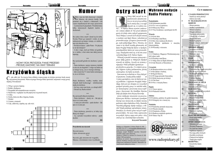 Rozr y wka Rozr y wka Katarzyna Buchacz N Humor ikt z nas nie lubi chorować i chodzić do lekarza, ale prawie każdy lubi pośmiać się z żartów o lekarzach i ich często niepokornych lub wręcz przeciwnie – wystraszonych pacjentach. Przedstawiamy kilka śmiesznych śląskich żartów o dochtorach. *** Roz jedyn chory umarł i dostał się do nieba. Świnty Pieter go wpuścił i widzi, że tyn nieboszczyk się śmieje i śmieje, a w niebie to tam tyla śmiechu ni ma. – Powidz mi duszo – pado Pieter – Po jakymu ty sie tak śmiejesz? – A dyć z tego, żech już blisko od godziny tu w niebie, a łoni mnie tam dalej jeszcze łoperują. *** Roz prziszedł górnik do dochtora i prawi mu: – Panie dochtorze, tamtyn rejonowy dochtór to mie nic nie dogodził. U niego się ludzie na co innego lyczą, a na co inszego umierają. – Jak to może być? U mnie ludzie umierają na to, na co ich lecza. K r z y ż ó w k a śląsk a C – jak cołki rok. Na trzecią literę alfabetu rozpoczynają się kolejne poziome hasła naszej styczniowej krzyżówki. Warto na progu Nowego Roku sprawdzić znajomość swojej gwary śląskiej. Powodzenia! 1. 50 kg w gwarze śląskiej. 2. Robak, chrabąszcz. 3. Przypadek lub niespodziewane szczęście. 4. Wydziwiać, wygłupiać się lub popisywać się przed innymi. 5. Córka. 6. Osoba, która nie dba o higienę, brudas. 7. Wróbel. 8. Ciemno, ciemność. 9. Cały, całkowity, zupełny, np. cała wieś. 4 7 6 9 2 3 *** Roz prziszedł chłop do dochtora. – Panie dochtorze – skarży sie – Jak pija se kawa to ni umia usnąć. – U mnie jest odwrotnie – pado dochtor – Jak śpia to ni umia pić. 1 *** – Panie dochtorze, prawda to, że baby żyją dłużyj niż chopy? – Ja, a przede wszystkim wdowy – pado dochtór. DD 5 Przysłowia na styczeń Styczeń mrozi, Lipiec skwarcem grozi. *** Styczeń, gdy mrozem nie wygodzi, Marzec z kwietniem wraz wychłodzi. DD 8 DD 26 *** Panie dochtorze, wartko, wartko, nosz Alojzik złykł korkociąg! – telefonuwała matka do dochtora. – Już leca, zaroz tam byda, a co dotąd robili? – Otwarli my flacha nożem! Redakcja Redakcja Os t r y s t ar t Nowy Rok zaczął się niespodziewanie dynamicznie. Jeszcze nie przyzwyczailiśmy się do zmiany daty, a tu nagle okazało się, że wybory tuż, tuż… W Radzie Miasta wyraźne zamieszanie i zmiana układu sił. Tuż przed oddaniem gazety do druku ośmiu radnych ugrupowania Nasze Piekary i czterech SLD złożyło wniosek o zwołanie sesji Rady Miasta i odwołanie jej przewodniczącego, Grzegorza Gowarzewskiego, szefa piekarskiego PiS-u. Niestety, nie znam w tej chwili wyniku głosowania, ale kiedy Przegląd Piekarski będzie w kioskach, prawdopodobnie będzie już nowy przewodniczący. Nieoficjalnie mówi się, że ma nim zostać szef piekarskiego SLD, Tadeusz Kupiec. Wniosek wywołał nerwowe poruszenie i przez kilka godzin w Piekarach Śląskich urywały się telefony. Zaczęły się rozmowy i negocjacje. Widać polityków ogarnęła już przedwyborcza gorączka. A to dopiero początek. Najpierw wybory parlamentarne, później samorządowe. Oj, będzie się działo… Tymczasem my wchodzimy w Nowy Rok pełni optymizmu. Zwiększyliśmy nakład do 3 tysięcy egzemplarzy, więc nie będzie już więcej problemów z kupieniem Przeglądu Piekarskiego, który jest już dostępny we wszystkich punktach sprzedaży prasy i w siedzibie redakcji. Kontynuujemy i poszerzamy naszą współpracę z harcerzami. Do Aniołków Marcina dołączyły kolejne dwie drużyny harcerskie. Grono redakcyjne nieustannie się poszerza. Katarzyna Buchacz świetnymi rysunkami ilustruje nasz miesięcznik, na okładce możemy podziwiać zdjęcie Radosława Folty, Dominika Wyciślok pielęgnuję śląskie tradycje, a Michał Wojak podejmuje najtrudniejsze tematy. Powiększa się również grono naszych współpracowników. Na nasze łamy zapraszamy wszystkich, którzy mają ostre pióro i chcą zmierzyć się z dziennikarskim rzemiosłem. W y b r an e au d y cje Ra dia P iek ar y : Poniedziałek: 10.40 Informator poselski. 19.10 To i owo na sportowo. 20.10 Muzyczny Mixer. 22.15 Trzy kwadranse z przebojami lat 80. Wtorek: 12.10 Gość dnia. 14.10 Przeboje znad Renu. 19.10 Kto chce (audycja dla dzieci). 20.10 Bliskie spotkania z muzyką chrześcijańską. 21.30 Piosenką i wierszem. 4 5 6 7 Środa: 12.15 Radiowy Magazyn Wielotematyczny lub Lekarz radzi. 14.10 Przeboje znad Renu. 17.15 Moje okno na Śląsk (felieton). 19.10 Jak Ślonzok ze Ślonzokiem. 8 9 10 11 Czwartek: 11.40 Bezpieczeństwo na co dzień. 17.10 Kwadrans z kulturą. 17.40 Kącik filmowy. 19.10 W kręgu piosenki francuskiej. 20.10 Klub muzyczny po kolacji. 21.10 Tok Duet. 00.10 Noc z muzyką Dance. 14 Piątek: 15.15 Nasze sprawy. 20.10 Piekarski Familok. Sobota: 9.30 Godomy, godomy, bo godać muszymy. 20.10 Szlagiery nie z naszej ery. Niedziela: 9.10 Niedzielny poranek muzyczny. 14.10 Wesołe minutki. 19.10 Niedziela u Wicka. 20.10 Radiowa niedziela sportowa. 20.45 Dance Top 20. Krzysztof Turzański Redakcja: ul. Olimpijska 3; Piekary Śląskie 41–940 tel. 0509–234–972 ; e–mail:przeglad–[email protected] stona internetowa: www.pp.u2.pl Redaguje zespół. Redaktor naczelny: Krzysztof Turzański, skład: Łukasz Warzecha. Wydawca: TURKAT, ul. Różana 2/6; Chorzów 41–500 Nakład: 3000 egzemplarzy Redakcja nie ponosi odpowiedzialności za treść ogłoszeń. Redakcja zastrzega sobie prawo skracania i redagowania nadesłanych artykułów. Materiałów nie zamówionych redakcja nie zwraca. Co w numerze: 12 16 17 18 19 20 21 22 23 24 25 www.radiopiekary.pl 26 Z NASZEJ PERSPEKTYWY – Naród czy może plemię? – Zalewa nas nuda... W TELEGRAFICZNYM SKRÓCIE – Miasto pamięta – Jasełka w przedszkolu – Młodzi kolędnicy – Okrągły jubileusz – Najstarsza piekarzanka – Ubiegły rok w liczbach – Bezpieczne życie – Bezkarna głupota – Renualt zamiast „ludwiczka” – Po raz trzynasty MIEJSKIE SPRAWY –