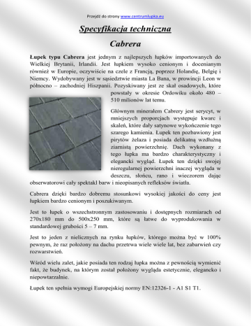 Przejdź do strony www.centrumlupka.eu Specyfikacja techniczna Cabrera Łupek typu Cabrera jest jednym z najlepszych łupków importowanych do Wielkiej Brytanii, Irlandii. Jest łupkiem wysoko cenionym i docenianym również w Europie, oczywiście na czele z Francją, poprzez Holandię, Belgię i Niemcy. Wydobywany jest w sąsiedztwie miasta La Bana, w prowincji Leon w północno – zachodniej Hiszpanii. Pozyskiwany jest ze skał osadowych, które powstały w okresie Ordowiku około 480 – 510 milionów lat temu. Głównym minerałem Cabrery jest serycyt, w mniejszych proporcjach występuje kwarc i skaleń, które dały satynowe wykończenie tego szarego kamienia. Łupek ten pozbawiony jest pirytów żelaza i posiada delikatną wzdłużną ziarnistą powierzchnię. Dach wykonany z tego łupka ma bardzo charakterystyczny i elegancki wygląd. Łupek ten dzięki swojej nieregularnej powierzchni inaczej wygląda w deszczu, słońcu, rano i wieczorem dając obserwatorowi cały spektakl barw i nieopisanych refleksów światła. Cabrera dzięki bardzo dobremu stosunkowi wysokiej jakości do ceny jest łupkiem bardzo cenionym i poszukiwanym. Jest to łupek o wszechstronnym zastosowaniu i dostępnych rozmiarach od 270x180 mm do 500x250 mm, które są łatwe do wyprodukowania w standardowej grubości 5 – 7 mm. Jest to jeden z nielicznych na rynku łupków, którego można być w 100% pewnym, że raz położony na dachu przetrwa wiele wiele lat, bez zabarwień czy rozwarstwień. Wśród wielu zalet, jakie posiada ten rodzaj łupka można z pewnością wymienić fakt, że budynek, na którym został położony wygląda estetycznie, elegancko i niepowtarzalnie. Łupek ten spełnia wymogi Europejskiej normy EN:12326-1 - A1 S1 T1. Specyfikacja techniczna: TEST* OTRZYMANE WYNIKI Absorpcja wody Ekspozycja na dwutlenek siarki (SO2) Cykl termiczny Zawartość węgla niewęglanowego Zawartość węglanów Odporność na ogień Reakcja na ogień Uwalnianie substancji niebezpiecznych Odporność mechaniczna wzdłużna Odporność mechaniczna poprzeczna A1 S1 T1 0,49 % (≤1,5 %) 0,28 % (≤1,5 %) Zgodne Zgodne, klasa A1 Brak w określonych stosowania 65 MPa 54 MPa warunkach *Wyniki otrzymane z próbek testowych zgodnie z EN 12326 -2: 2000. Łupek i inne wyroby z kamienia naturalnego do zakładkowych pokryć dachowych i okładzin elewacyjnych. Tabela pokryć łupkiem: Ułożenie zakładkowe – head lap mm Rozmiar mm 600x300 500x300 500x250 460x225 400x250 400x200 75mm 12,5 15,4 18,5 17,5 24,1 30 80mm 12,6 15,6 18,7 17,7 24,5 30,5 85mm 12,7 15,8 18,9 18 24,9 31 90mm 12,9 16 19,1 18,2 25,3 31,5 95mm 13 16,2 19,4 18,5 25,7 32 100mm 13,1 16,4 19,6 18,7 26,1 32,5 105mm 13,2 16,6 19,9 19 26,6 33,1 110mm 13,4 16,8 20,1 19,3 27 33,6 115mm 13,4 17 20,4 19,6 27,5 34,2 Minimalne zalecane ułożenie zakładkowe zależne od kąta nachylenia dachu: Rozmiar mm Minimalne nachylenie dachu – Severe exposure (56.5 L/M2 or greater per spell) 20◦ 600x300 500x300 500x250 460x225 400x250 400x200 Rozmiar mm 22,5◦ 25◦ 27,5◦ 130 120 110 30◦ 100 100 100 100 100 100 35◦ 90 90 90 90 90 90 40◦ 80 80 80 80 80 80 45◦ - 75◦ 70 70 70 70 70 70 85◦ 65 65 65 65 Minimalne nachylenie dachu – Moderate exposure (Less than 56.5 L/M2 per spell) 600x300 500x300 500x250 460x225 400x250 400x200 20◦ 22,5◦ 115 105 25◦ 95 95 95 27,5◦ 85 85 85 30◦ 80 80 80 80 80 80 35◦ 70 70 70 70 70 70 40◦ 60 60 60 60 60 60 45◦ - 75◦ 55 55 55 55 55 55 85◦ 50 50 50 50 W celu uzyskania pomocy technicznej lub innych pytań prosimy o kontakt [email protected] lub pod numerem telefonu 511 – 596 – 988. AWR & BHP Sp. z o.o. www.centrumlupka.eu