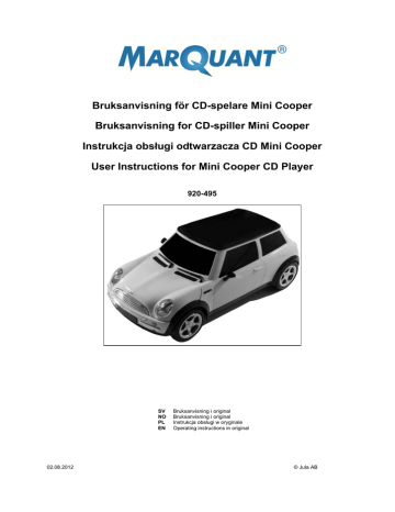 Bruksanvisning för CD-spelare Mini Cooper Bruksanvisning for CD-spiller Mini Cooper Instrukcja obsługi odtwarzacza CD Mini Cooper User Instructions for Mini Cooper CD Player 920-495 SV NO PL EN 02.08.2012 Bruksanvisning i original Bruksanvisning i original Instrukcja obsługi w oryginale Operating instructions in original © Jula AB SVENSKA 3 SÄKERHETSANVISNINGAR ....................................................................................................................... 3 Elsäkerhet ............................................................................................................................................ 3 Lasersäkerhet ...................................................................................................................................... 3 TEKNISKA DATA ......................................................................................................................................... 3 BESKRIVNING ............................................................................................................................................. 4 Manöverpanel ...................................................................................................................................... 4 HANDHAVANDE .......................................................................................................................................... 5 Förberedelser....................................................................................................................................... 5 Radiofunktion ....................................................................................................................................... 5 CD-spelning ......................................................................................................................................... 6 Tillbehör ............................................................................................................................................... 8 FELSÖKNING .............................................................................................................................................. 9 NORSK 10 SIKKERHETSANVISNINGER .................................................................................................................... 10 El-sikkerhet ........................................................................................................................................ 10 Lasersikkerhet.................................................................................................................................... 10 TEKNISKE DATA ....................................................................................................................................... 10 BESKRIVELSE ........................................................................................................................................... 11 Betjeningspanel ................................................................................................................................. 11 BRUK .......................................................................................................................................................... 12 Forberedelser..................................................................................................................................... 12 Radiofunksjon .................................................................................................................................... 12 CD-avspilling ...................................................................................................................................... 13 Tilbehør .............................................................................................................................................. 15 FEILSØKING .............................................................................................................................................. 16 POLSKI 17 ZASADY BEZPIECZEŃSTWA ................................................................................................................... 17 Bezpieczeństwo elektryczne.............................................................................................................. 17 Bezpieczeństwo urządzeń laserowych .............................................................................................. 17 DANE TECHNICZNE ................................................................................................................................. 17 OPIS ........................................................................................................................................................... 18 Panel sterowania ............................................................................................................................... 18 OBSŁUGA .................................................................................................................................................. 19 Przygotowania ................................................................................................................................... 19 Funkcja radia ..................................................................................................................................... 19 Odtwarzanie CD................................................................................................................................. 20 Akcesoria ........................................................................................................................................... 22 WYKRYWANIE USTEREK......................................................................................................................... 23 ENGLISH 24 SAFETY INSTRUCTIONS.......................................................................................................................... 24 Electrical safety ............
