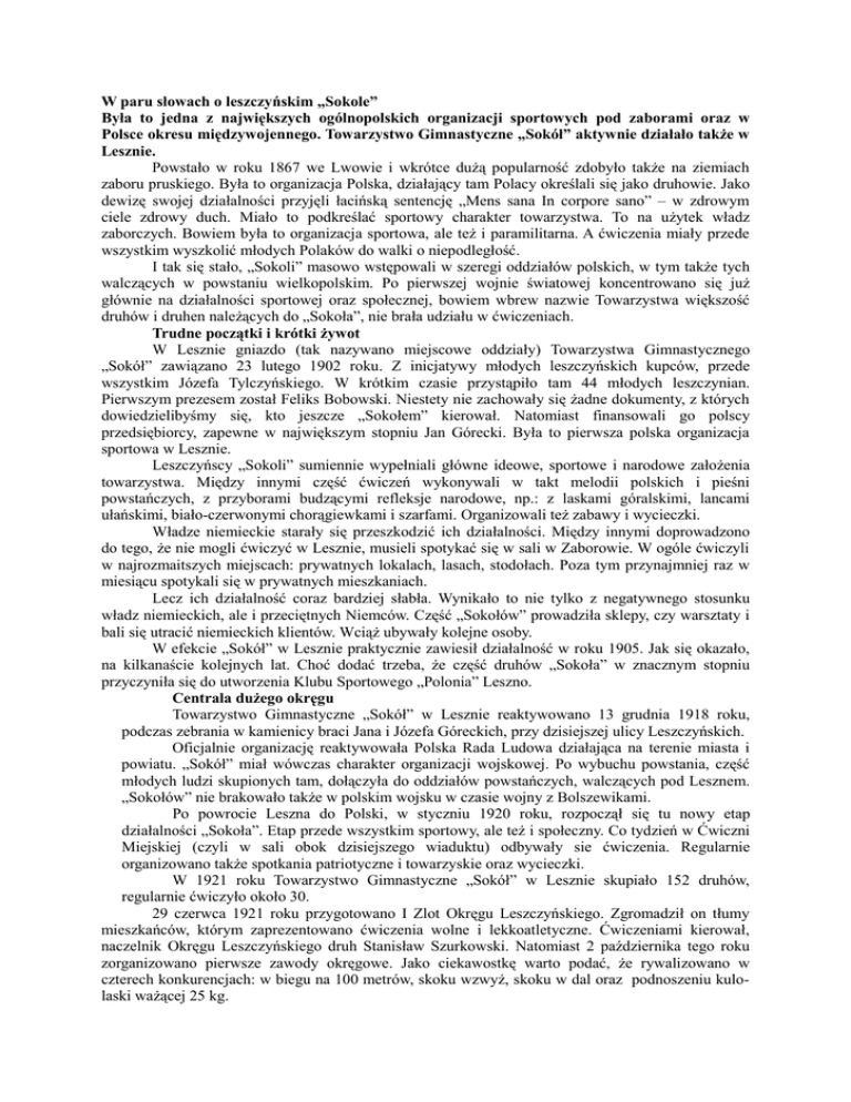 W paru słowach o leszczyńskim „Sokole” Była to jedna z największych ogólnopolskich organizacji sportowych pod zaborami oraz w Polsce okresu międzywojennego. Towarzystwo Gimnastyczne „Sokół” aktywnie działało także w Lesznie. Powstało w roku 1867 we Lwowie i wkrótce dużą popularność zdobyło także na ziemiach zaboru pruskiego. Była to organizacja Polska, działający tam Polacy określali się jako druhowie. Jako dewizę swojej działalności przyjęli łacińską sentencję „Mens sana In corpore sano” – w zdrowym ciele zdrowy duch. Miało to podkreślać sportowy charakter towarzystwa. To na użytek władz zaborczych. Bowiem była to organizacja sportowa, ale też i paramilitarna. A ćwiczenia miały przede wszystkim wyszkolić młodych Polaków do walki o niepodległość. I tak się stało, „Sokoli” masowo wstępowali w szeregi oddziałów polskich, w tym także tych walczących w powstaniu wielkopolskim. Po pierwszej wojnie światowej koncentrowano się już głównie na działalności sportowej oraz społecznej, bowiem wbrew nazwie Towarzystwa większość druhów i druhen należących do „Sokoła”, nie brała udziału w ćwiczeniach. Trudne początki i krótki żywot W Lesznie gniazdo (tak nazywano miejscowe oddziały) Towarzystwa Gimnastycznego „Sokół” zawiązano 23 lutego 1902 roku. Z inicjatywy młodych leszczyńskich kupców, przede wszystkim Józefa Tylczyńskiego. W krótkim czasie przystąpiło tam 44 młodych leszczynian. Pierwszym prezesem został Feliks Bobowski. Niestety nie zachowały się żadne dokumenty, z których dowiedzielibyśmy się, kto jeszcze „Sokołem” kierował. Natomiast finansowali go polscy przedsiębiorcy, zapewne w największym stopniu Jan Górecki. Była to pierwsza polska organizacja sportowa w Lesznie. Leszczyńscy „Sokoli” sumiennie wypełniali główne ideowe, sportowe i narodowe założenia towarzystwa. Między innymi część ćwiczeń wykonywali w takt melodii polskich i pieśni powstańczych, z przyborami budzącymi refleksje narodowe, np.: z laskami góralskimi, lancami ułańskimi, biało-czerwonymi chorągiewkami i szarfami. Organizowali też zabawy i wycieczki. Władze niemieckie starały się przeszkodzić ich działalności. Między innymi doprowadzono do tego, że nie mogli ćwiczyć w Lesznie, musieli spotykać się w sali w Zaborowie. W ogóle ćwiczyli w najrozmaitszych miejscach: prywatnych lokalach, lasach, stodołach. Poza tym przynajmniej raz w miesiącu spotykali się w prywatnych mieszkaniach. Lecz ich działalność coraz bardziej słabła. Wynikało to nie tylko z negatywnego stosunku władz niemieckich, ale i przeciętnych Niemców. Część „Sokołów” prowadziła sklepy, czy warsztaty i bali się utracić niemieckich klientów. Wciąż ubywały kolejne osoby. W efekcie „Sokół” w Lesznie praktycznie zawiesił działalność w roku 1905. Jak się okazało, na kilkanaście kolejnych lat. Choć dodać trzeba, że część druhów „Sokoła” w znacznym stopniu przyczyniła się do utworzenia Klubu Sportowego „Polonia” Leszno. Centrala dużego okręgu Towarzystwo Gimnastyczne „Sokół” w Lesznie reaktywowano 13 grudnia 1918 roku, podczas zebrania w kamienicy braci Jana i Józefa Góreckich, przy dzisiejszej ulicy Leszczyńskich. Oficjalnie organizację reaktywowała Polska Rada Ludowa działająca na terenie miasta i powiatu. „Sokół” miał wówczas charakter organizacji wojskowej. Po wybuchu powstania, część młodych ludzi skupionych tam, dołączyła do oddziałów powstańczych, walczących pod Lesznem. „Sokołów” nie brakowało także w polskim wojsku w czasie wojny z Bolszewikami. Po powrocie Leszna do Polski, w styczniu 1920 roku, rozpoczął się tu nowy etap działalności „Sokoła”. Etap przede wszystkim sportowy, ale też i społeczny. Co tydzień w Ćwiczni Miejskiej (czyli w sali obok dzisiejszego wiaduktu) odbywały sie ćwiczenia. Regularnie organizowano także spotkania patriotyczne i towarzyskie oraz wycieczki. W 1921 roku Towarzystwo Gimnastyczne „Sokół” w Lesznie skupiało 152 druhów, regularnie ćwiczyło około 30. 29 czerwca 1921 roku przygotowano I Zlot Okręgu Leszczyńskiego. Zgromadził on tłumy mieszkańców, którym zaprezentowano ćwiczenia wolne i lekkoatletyczne. Ćwiczeniami kierował, naczelnik Okręgu Leszczyńskiego druh Stanisław Szurkowski. Natomiast 2 października tego roku zorganizowano pierwsze zawody okręgowe. Jako ciekawostkę warto podać, że rywalizowano w czterech konkurencjach: w biegu na 100 metrów, skoku wzwyż, skoku w dal oraz podnoszeniu kulolaski ważącej 25 kg. W roku 1923 nastąpiło uroczyste poświęcenie sztandaru leszczyńskiego „Sokoła”. W roku następnym towarzystwo kupiło 18,5 morgi gruntu, na którym trzy lata później udało się uruchomić boisko sportowe. W roku 1925 Towarzystwo Gimnastyczne „Sokół” w Lesznie skupiało już 210 druhów, do tego działał tam oddział młodzieżowy, liczący 92 młodych mieszkańców miasta. W dniach 2-3 lipca 1927 roku w Lesznie odbył się Zlot Okręgu Leszczyńskiego, podczas którego uroczyście poświęcono boisko „Sokoła”. Podjęto też decyzję o budowie „Sokolni”, siedziby leszczyńskiego „Sokoła”. „Sokolnię” uroczyście poświęcono 13 lipca 1930 roku. Był to duży budynek, w którym spotkać się mogło nawet kilkaset osób. Mieścił się w miejscu, gdzie dziś znajduje się hotel i pływalnia „Akwawit”. Dzięki temu, że Leszno dysponowało tak dużym i na tamte czasy nowoczesnym obiektem, często odbywały się tam zloty Okręgu Leszczyńskiego. A okręg był naprawdę duży. W pewnych okresach (kilkakrotnie dzielono go, by później znów przyłączyć część gniazd) obejmował obszar od Miejskiej Górki i Rawicza po Wolsztyn i Nowy Tomyśl. Działalność sportowa Najprawdopodobniej w 1928 roku założono tam sekcję piłki nożnej. W krótkim czasie stała się ona w Towarzys
