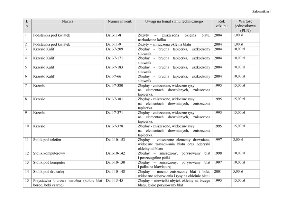 Załącznik nr 1 L p. Nazwa Numer inwent. 1 Podstawka pod kwiatek Dz I-11-8 2 3 Podstawka pod kwiatek Krzesło Kalif Dz I-11-9 Dz I-7-209 4 Krzesło Kalif Dz I-7-171 5 Krzesło Kalif Dz I-7-183 6 Krzesło Kalif Dz I-7-66 7 Krzesło Dz I-7-380 8 Krzesło Dz I-7-381 9 Krzesło Dz I-7-371 10 Krzesło Dz I-7-378 11 Stolik pod telefon Dz I-10-153 12 Stolik komputerowy Dz I-10-142 13 Stolik pod komputer Dz I-10-130 14 Stolik pod drukarkę Dz I-10-148 15 Przystawka biurowa narożna (kolor: blat Dz I-13-45 bordo, boki czarne) Uwagi na temat stanu technicznego Zużyty – zniszczona okleina blatu, uszkodzone kółka Zużyty – zniszczona okleina blatu Zbędny - brudna tapicerka, uszkodzony siłownik Zbędny - brudna tapicerka, uszkodzony siłownik Zbędny - brudna tapicerka, uszkodzony siłownik Zbędny - brudna tapicerka, uszkodzony siłownik Zbędny - zniszczone, widoczne rysy na elementach drewnianych, zniszczona tapicerka. Zbędny - zniszczone, widoczne rysy na elementach drewnianych, zniszczona tapicerka. Zbędny - zniszczone, widoczne rysy na elementach drewnianych, zniszczona tapicerka. Zbędny - zniszczone, widoczne rysy na elementach drewnianych, zniszczona tapicerka. Zbędny – zniszczone elementy drewniane, widoczne zarysowania blatu oraz odpryski okleiny od blatu Zbędny – zniszczony, porysowany blat i poszczególne półki Zbędny – zniszczony, porysowany blat i półka na klawiaturę Zbędny – mocno zniszczony blat i boki, widoczne odbarwienia i rysy na okleinie blatu Zbędny – niewielki ubytek okleiny na brzegu blatu, lekko porysowany blat Rok zakupu Wartość jednostkowa (PLN) 2004 1,00 zł 2004 2004 1,00 zł 10,00 zł 2004 10,00 zł 2004 10,00 zł 2004 10,00 zł 1995 15,00 zł 1995 15,00 zł 1995 15,00 zł 1995 15,00 zł 1997 3,00 zł 1998 10,00 zł 1997 10,00 zł 2001 5,00 zł 1995 15,00 zł 16 Stolik owalny (czarny) Dz I-10-165 Zbędny – pęknięta okleina blatu, odklejona 1997 okleina na bokach blatu 8,00 zł 17 Stolik pod telefon (na kółkach) Dz I-10-160 1998 5,00 zł 18 Szafka Dz I-5-150 2003 10,00 zł 19 Szafa biurowa z nadstawką Dz I-3-200 1997 25,00 zł 20 Dostawka do biurka (szafka narożna) Dz I-2-100 1997 10,00 zł 21 Dostawka do biurka (szafka narożna) Dz I-2-101 1997 10,00 zł 22 Dywan 3x4 Dz II-2-33 2003 5,00 zł 23 24 25 Wentylator Czajnik Zelmer Czajnik Philips Dz VI-1-23 Ew.il. Dz IV-5-3 Dz IV-5-48 1995 2012 2007 1,00 zł 1,00 zł 1,00 zł 26 27 28 29 30 31 32 33 34 2004 2001 1995 1998 2007 2009 2009 2009 2009 1,00 zł 1,00 zł 1,00 zł 1,00 zl 1,00 zł 1,00 zł 1,00 zł 1,00 zł 1,00 zł 35 36 37 38 Zegar ścienny Termowentylator farel Termowentylator farel Termowentylator farel Telefon komórkowy Telefon komórkowy Telefon komórkowy Telefon komórkowy Telefon komórkowy (Nokia 6210) Telefon komórkowy Telefon komórkowy Telefon Saga Memo Telefon Eurit 25 ISDN Zbędny - zniszczony, wyraźnie widoczne ślady użytkowania, porysowany blat Zbędny – zniszczona, widoczne otarcia i rysy okleiny Zbędny – widoczne ślady użytkowania, zniszczona okleina, brak klucza do zamka Zbędny – zniszczona, widoczne otarcia i rysy okleiny Zbędny – zniszczona, widoczne otarcia i rysy okleiny Zużyty – poplamiony, wyblakły kolor po wielokrotnym praniu oraz widoczne wgniecenia od mebli Zużyty - urządzenie niesprawne Zużyty – spalony włącznik termostatyczny Zużyty – przepalona grzałka, nieszczelny i zakamieniony dzbanek, brak filtra Zużyty – zbite szkło, uszkodzony mechanizm Zużyty - urządzenie niesprawne Zużyty - urządzenie niesprawne Zużyty - urządzenie niesprawne Zużyty - niesprawny, zniszczona obudowa Zużyty – niesprawny, zniszczona obudowa Zużyty – niesprawny, zniszczona obudowa Zużyty – niesprawny, zniszczona obudowa Zużyty – niesprawny, zniszczona obudowa 2009 2009 1998 2003 1,00 zł 1,00 zł 1,00 zł 5,00 zł 39 Telefon Swissvoice Avena Dz III-1-5 2004 1,00 zł 40 Telefon Swissvoice Avena Dz III-1-6 2004 1,00 zł Dz II-4-18 Dz VI-2-19 Dz VI-2-5 Dz VI-2-8 Dz III-1-151 Dz III-1-154 Dz III-1-155 Dz III-1-156 nawigator Dz III-1-157 Dz III-1-159 Dz III-1-160 Dz III-1-90 Dz III-1-38 Zużyty – niesprawny, zniszczona obudowa Zużyty – niesprawny, zniszczona obudowa Zużyty – niesprawny, zniszczona obudowa Zbędny – widoczne ślady użytkowania na obudowie, brak kabla zasilającego Zużyty – niesprawny, zniszczona obudowa, brak akumulatorów Zużyty – niesprawny, zniszczona obudowa, brak akumulatorów 41 Telefon Siemens Gigaset Dz III-1-138 42 Telefon Siemens Gigaset Dz III-1-132 43 Telefon Siemens Dz III-1-137 44 Telefon Siemens Dz III-1-131 45 Telefon Siemens Dz III-1-143 46 Telefon Siemens Dz III-1-144 47 Telefon Siemens Dz III-1-133 48 Telefon Siemens Dz III-1-135 49 Kamera monitoringu 6-66-669-12 50 Kserokopiarka Ricoh Aficio 2045 8-80-800-5 Zużyty – cześci wykorzystane do naprawy innych słuchawek, niesprawny Zużyty – niesprawny, zniszczona obudowa, brak akumulatorów Zużyty – niesprawny, zniszczona obudowa, brak akumulatorów Zużyty – niesprawny, zniszczona obudowa, brak akumulatorów Zużyty – niesprawny, zniszczona obudowa, brak akumulatorów Zużyty – niesprawny, zniszczona obudowa, brak akumulatorów Zużyty – niesprawny, zniszczona obudowa, brak akumulatorów Zużyty – niesprawny, zniszczona obudowa, brak akumulatorów Zużyty - uszkodzona elektronika, urządzenie niesprawne Zużyty – zgodnie z ekspertyzą techniczną w urządzeniu stwierdzono zużycie następujących materiałów eksploatacyjnych: bęben światłoczuły, listwa czyszcząca, deweloper, pas transferowy, listwa czyszcząca pasa transferowego, wałek teflonowy, wałek dociskowy, odrywacze, rolki pobierania papieru. Ponadto stwierdzono nadmierne zużycie przekładni napędowej oraz mechanizmu przeniesienia napędu. 2006 1,00 zł 2006 1,00 zł 2006 1,00 zł 2006 1,00 zł 2006 1,00 zł 2006 1,00 zł 2006 1,00 zł 2006 1,00 zł 2003 1,00 zł 2003 400,00 zł