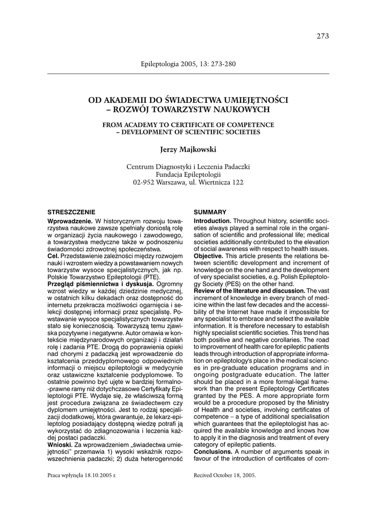 273 Epileptologia 2005, 13: 273-280 OD AKADEMII DO ŚWIADECTWA UMIEJĘTNOŚCI – ROZWÓJ TOWARZYSTW NAUKOWYCH FROM ACADEMY TO CERTIFICATE OF COMPETENCE – DEVELOPMENT OF SCIENTIFIC SOCIETIES Jerzy Majkowski Centrum Diagnostyki i Leczenia Padaczki Fundacja Epileptologii 02-952 Warszawa, ul. Wiertnicza 122 STRESZCZENIE SUMMARY Wprowadzenie. W historycznym rozwoju towarzystwa naukowe zawsze spełniały doniosłą rolę w organizacji życia naukowego i zawodowego, a towarzystwa medyczne także w podnoszeniu świadomości zdrowotnej społeczeństwa. Cel. Przedstawienie zależności między rozwojem nauki i wzrostem wiedzy a powstawaniem nowych towarzystw wysoce specjalistycznych, jak np. Polskie Towarzystwo Epileptologii (PTE). Przegląd piśmiennictwa i dyskusja. Ogromny wzrost wiedzy w każdej dziedzinie medycznej, w ostatnich kilku dekadach oraz dostępność do internetu przekracza możliwości ogarnięcia i selekcji dostępnej informacji przez specjalistę. Powstawanie wysoce specjalistycznych towarzystw stało się koniecznością. Towarzyszą temu zjawiska pozytywne i negatywne. Autor omawia w kontekście międzynarodowych organizacji i działań rolę i zadania PTE. Drogą do poprawienia opieki nad chorymi z padaczką jest wprowadzenie do kształcenia przeddyplomowego odpowiednich informacji o miejscu epileptologii w medycynie oraz ustawiczne kształcenie podyplomowe. To ostatnie powinno być ujęte w bardziej formalno-prawne ramy niż dotychczasowe Certyfikaty Epileptologii PTE. Wydaje się, że właściwszą formą jest procedura związana ze świadectwem czy dyplomem umiejętności. Jest to rodzaj specjalizacji dodatkowej, która gwarantuje, że lekarz-epileptolog posiadający dostępną wiedzę potrafi ją wykorzystać do zdiagnozowania i leczenia każdej postaci padaczki. Wnioski. Za wprowadzeniem „świadectwa umiejętności” przemawia 1) wysoki wskaźnik rozpowszechnienia padaczki; 2) duża heterogenność Introduction. Throughout history, scientific societies always played a seminal role in the organisation of scientific and professional life; medical societies additionally contributed to the elevation of social awareness with respect to health issues. Objective. This article presents the relations between scientific development and increment of knowledge on the one hand and the development of very specialist societies, e.g. Polish Epileptology Society (PES) on the other hand. Review of the literature and discussion. The vast increment of knowledge in every branch of medicine within the last few decades and the accessibility of the Internet have made it impossible for any specialist to embrace and select the available information. It is therefore necessary to establish highly specialist scientific societies. This trend has both positive and negative corollaries. The road to improvement of health care for epileptic patients leads through introduction of appropriate information on epileptology's place in the medical sciences in pre-graduate education programs and in ongoing postgraduate education. The latter should be placed in a more formal-legal framework than the present Epileptology Certificates granted by the PES. A more appropriate form would be a procedure proposed by the Ministry of Health and societies, involving certificates of competence – a type of additional specialisation which guarantees that the epileptologist has acquired the available knowledge and knows how to apply it in the diagnosis and treatment of every category of epileptic patients. Conclusions. A number of arguments speak in favour of the introduction of certificates of com- Praca wpłynęła 18.10.2005 r. Recived October 18, 2005. 274 Jerzy Majkowski i złożoność padaczki z wysokim wskaźnikiem błędów diagnostycznych i terapeutycznych; 3) wysoki odsetek (ok. 50%) współwystępowania zaburzeń nerwicowych, behawioralnych, psychicznych, intelektualnych i narządowych; 4) postęp w epileptologii – i innych dziedzinach neurologii – wykracza poza dotychczasowe programy nauczania i przekracza możliwości objęcia całokształtu dostępnej wiedzy przez lekarza neurologa; 5) potrzeba umiejętności przez epileptologa współpracy z innymi specjalistami; 6) przynależność padaczki do najbardziej kosztownych przewlekłych schorzeń neurologicznych. petency: 1) the high prevalence of epilepsy; 2) the high heterogeneity and complexity of epilepsy and the high rate of diagnostic and therapeutic errors; 3) the high rate (about 50%) of comorbidity of neurotic, behavioural, mental and cognitive disorders; 4) progress in epileptology – and several other branches of neurology – beyond the existing syllabuses and beyond neurologists' capacity to embrace the existing knowledge in its entirety; 5) epileptologists should have good knowledge of multi-specialist co-operation and competency therein; 6) epilepsy is one of the most expensive chronic neurological conditions. Słowa kluczowe: Towarzystwa naukowe – Świadectwo umiejętności – Epileptologia Key words: Scientific societies – Certificates of competence – Epileptology RYS HISTORYCZNY I ntelektualna ciekawość poznawania otaczającej rzeczywistości jest spiritus movens powstawania towarzystw naukowych czy naukowo-zawodowych. Początek tego ruchu zaczął się od Platona, który zakupił w 386 r. p. n. Ch. od Akademosa – herosa ateńskiego, część ogrodu w celu uprawiania w gronie przyjaciół ćwiczeń intelektualnych z dala od „zgiełku współczesnego świata i życia publicznego”. Od ogrodu Akademosa powstała nazwa „akademia”. W 79 r. Ateny odwiedził Cycero i po powrocie do Rzymu jedną ze swych willi nazwał „Academia”. Nazwę przyjęli Włosi, wprowadzając ją w XV w. dla określania stowarzyszeń. Początkowo były to niewielkie elitarne grupy osób zainteresowanych sztuką, literaturą, filozofią, naukami przyrodniczymi, matematyką itp. Już w XVII w. rozwój nauki uniemożliwił encyklopedyczne opanowanie