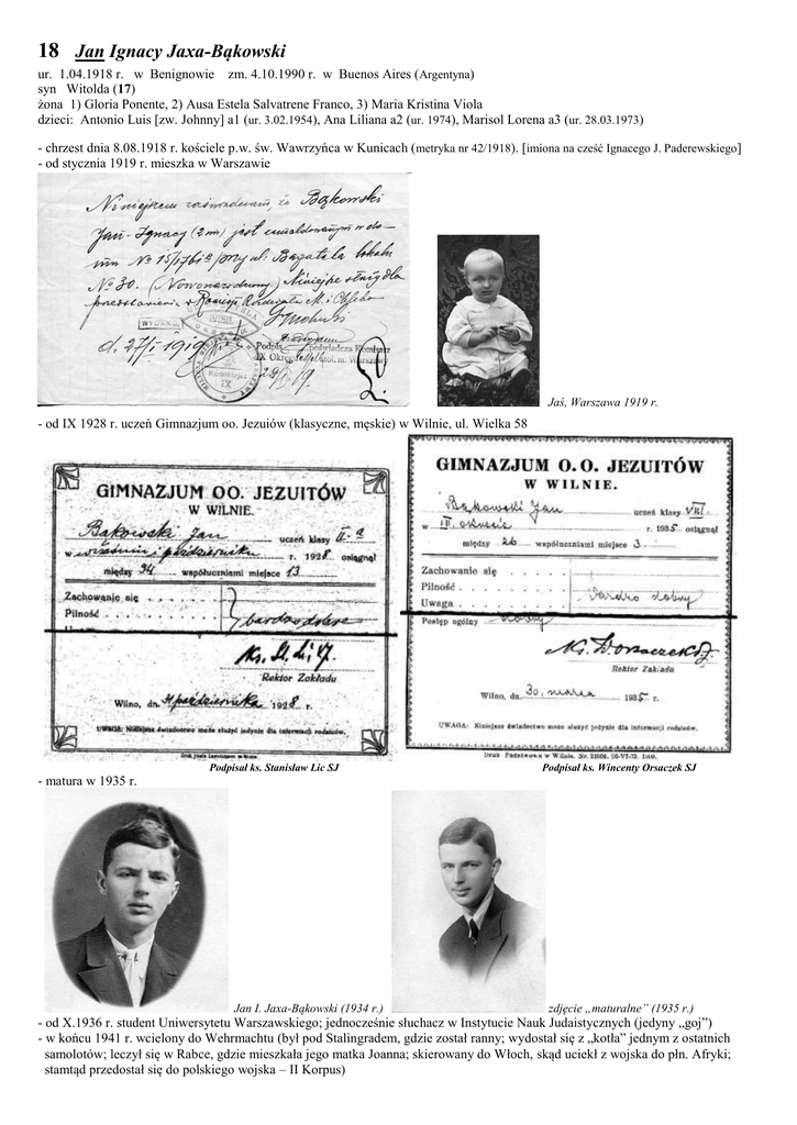 18 Jan Ignacy Jaxa-Bąkowski ur. 1.04.1918 r. w Benignowie zm. 4.10.1990 r. w Buenos Aires (Argentyna) syn Witolda (17) żona 1) Gloria Ponente, 2) Ausa Estela Salvatrene Franco, 3) Maria Kristina Viola dzieci: Antonio Luis [zw. Johnny] a1 (ur. 3.02.1954), Ana Liliana a2 (ur. 1974), Marisol Lorena a3 (ur. 28.03.1973) - chrzest dnia 8.08.1918 r. kościele p.w. św. Wawrzyńca w Kunicach (metryka nr 42/1918). [imiona na cześć Ignacego J. Paderewskiego] - od stycznia 1919 r. mieszka w Warszawie Jaś, Warszawa 1919 r. - od IX 1928 r. uczeń Gimnazjum oo. Jezuiów (klasyczne, męskie) w Wilnie, ul. Wielka 58 Podpisał ks. Stanisław Lic SJ Podpisał ks. Wincenty Orsaczek SJ - matura w 1935 r. Jan I. Jaxa-Bąkowski (1934 r.) zdjęcie „maturalne” (1935 r.) - od X.1936 r. student Uniwersytetu Warszawskiego; jednocześnie słuchacz w Instytucie Nauk Judaistycznych (jedyny „goj”) - w końcu 1941 r. wcielony do Wehrmachtu (był pod Stalingradem, gdzie został ranny; wydostał się z „kotła” jednym z ostatnich samolotów; leczył się w Rabce, gdzie mieszkała jego matka Joanna; skierowany do Włoch, skąd uciekł z wojska do płn. Afryki; stamtąd przedostał się do polskiego wojska – II Korpus) w mieszkaniu Joanny Jaxa-Bąkowskiej w Rabce „Twoja stara Mu i Twój brat pozdrawiają Cię!” [pisane do Heleny w Wilnie] [Stanisław Grabowski z żoną Katarzyną prowadzili w czasie II wojny w Rabce zakłady fotograficzne w Bazarze i willi „Granit”] - był telefonistą w „dowództwie ognia artylerii lekkiej” 15. Wileńskiego Baonu Strzelców [„Wilki”] 5. Kresowej Dywizji Piechoty II Korpusu gen. Andersa we Włoszech [przedtem w szkole podchorążych łączności w Matera (Włochy)] Na jesieni 1944 r. Sztab Wojskowego Centrum Szkoleniowego 2° Korpusu Polskiego wraz z lokalnymi władzami zdecydował założyć w mieście Matera szkołę podchorążych rezerwy wojsk Piechoty, Artylerii, Łączności, Zaopatrzenia i Transportu oraz Korpusu Pomocniczej Wojskowej Służby Kobiet. Szkoła Podchorążych Piechoty i Artylerii mieściła się w wielkim budynku dzisiejszej szkoły podstawowej “Padre Giovanni Minozzi”, natomiast w byłym seminarium Lanfranchi znalazła swoją siedzibę szkoła przyszłych oficerów łączności. - Rozkazem Dowództwa 5 Kresowej Dywizji Piechoty otrzymał Odznakę Pamiątkową 5 KDP (legitymację nr 7342 podpisał gen. bryg. Sulik Nikodem) - po II wojnie pozostał w W. Brytanii; wyjechał do Argentyny - do Argentyny (Buenos Aires) przypłynął na statku „Empire Deben”*) dnia 4.02.1948 r. z Southampton *) „Empire Deben” was a 11.251 GRT ocean liner which was built by Howaldtswerke, Kiel. Launched in 1922 as Thuringia for Hamburg America Line. Used on the New York and Boston routes until 1929 when she was sold to Hamburg South America Line and renamed General San Martin. Requisitioned in 1940 by the Kriegsmarine, used as a floating barracks, then a tender and finally a hospital ship. She took part in the evacuation of civilians from the Baltic. Seized in May 1945 at Copenhagen. To MoWT and renamed Empire Deben. Operated under the management of Shaw, Savill & Albion Line. Scrapped in March 1949 at Newport, Monmouthshire. - pracował jako sternik na statkach handlowych, pływających głównie do portów nad Morzem Karaibskim i na wschodnim wybrzeżu USA. Statki, na których pływał zawijały też czasami do różnych portów w Europie, skąd przyjeżdżał do Matki w Duisburgu. “Matka i syn” (Duisburg, 1955 r.) Jan Bąkowski z przyszła żoną Glorią Ponente i synem Antonio Luisem (nazywanym Johnny) w Rosario Jan I. Jaxa-Bąkowski, sternik na statku (1960 r.) - „(…) 2 marca [1960] otrzymałem argentyński dokument wojskowy, który stwierdza, że jestem obywatelem argentyńskim i że o tej 40 samej godzinie 15 zawarłem ślub z panną Gloria Ponente argentynką i że mam z nią 6-cio letniego syna, który nazywa się Luis Antonio i w tym roku zacznie chodzić do szkoły (…). [z listu z dn. 3.03.1960 r., Buenos Aires] -„(…) Moja żona ma 30 lat, ale temperament ma włoski i wcale się na mnie nie skarży. Synek jest mój – chłopczyk zuchowaty. (…). [z listu z dn. 18.08.1960 r.] - po ślubie rozpoczął budowę domu w nowopowstającej dzielnicy Buenos Aires – Florencio Varela Jan w czasie kolejnych odwiedzin Matki w Duisburgu, styczeń 1967 r. Jan I. Bąkowski z synem Johnym przed swoim (rozbudowywanym) domem - „(…) 11.11. [1974] wziąłem tutaj ślub z Ausa Estela Salvatrene Franco i że mam z nią córkę Ana Liliana, która urodziła się 30 VIII. Moja żona (…) ukończyła 13.11. 21 lat. (…)”. [z listu J. z dn. 16.11.1974 r., Guatemala] - „(…) moja nowa żona nazywa się Maria Kristina, ma 27 lat, miała jak dotąd 3 mężów (…). Moja wychowanica ma 6 lat….” [z listu J. z dn. 8.10.1979 r., Buenos Aires] - „(…) moja córeczka Marisol Lorena Jaxa-Bakowski ur. się 28 III 1973 r. w Buenos Aires. Matka nazywa się Cristina Viola” [Viola – nazwisko Krystyny?] [z listu J. z dn. 24.12.1980 r., Buenos Aires] - w 1976 r. został „spensjonowany” – przeszedł na emeryturę -m - „mam b. smutne życie, ponieważ dn. 17.02.1984 r. zmarła Krystyna lat 34. Pozostała mi moja córka Marisol, która jest teraz w 6 odddziale powszechnym (…). [z listu J. z dn. 20.05.1984 r., Buenos Aires] [z innego listu wynikało, że Marisol b. lubiła konie; chciała zostać dżokejem; w wieku kilkunastu lat pracowała (bezpłatnie) w stajni przy obsłudze koni] - adres w 1987 r.: Localidad Julio A. Lesta B San Jorge Florencio Varela 1888 C.P. (Pr. Buenos Aires) - zmarł podczas kiermaszu książki w Buenos Aires (dzielnica Florencio Varela) na udar (wylew krwi do mózgu). - pochowany na Cementerio de Florencio Varela (kwatera J, rząd 17, grób 35) Benignów, kol., pow. opoczyński, gm. i par. Opoczno [Sul]; obecnie Benignów (część miejscowości Gawrony) powiat opoczyński, gmina wiejska Sławno Gawrony, w