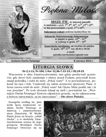 MSZE SW. w naszej parafii w niedziele: o godz. 7 , 9 , 1015, 1130, 1300 i 1800; w dni powszednie o godz. 7 i 18200. 00 00 Sakrament pokuty podczas każdej Mszy św. | Adoracja Najświętszego Sakramentu w piątki w godz. 1500 - 2100 w sobotę w godz. 800 - 1000 Kancelaria parafialna: od wtorku do piątku w godz. 1600-1730. tel. 22-811-79-22 e-mail: [email protected] Zesłanie Ducha Świętego 8 czerwca 2014 r. LITURGIA SŁOWA Dz 2,1-11; Ps 104; 1 Kor 12,3b-7.12-13; J 20,19-23 Wieczorem w dniu Zmartwychwstania, tam gdzie przebywali uczniowie, gdy drzwi były zamknięte z obawy przed Żydami, przyszedł Jezus, stanął pośrodku i rzekł do nich: „Pokój wam!" A to powiedziawszy, pokazał im ręce i bok. Uradowali się zatem uczniowie ujrzawszy Pana. A Jezus znowu rzekł do nich: „Pokój wam! Jak Ojciec Mnie posłał, tak i Ja was posyłam". Po tych słowach tchnął na nich i powiedział im: „Weźmijcie Ducha Świętego! Którym odpuścicie grzechy, są im odpuszczone, a którym zatrzymacie, są im zatrzymane". - Oto słowo Pańskie. Ewangelia według św. Jana ściśle łączy wydarzenie zesłania Ducha Świętego ze śmiercią i zmartwychwstaniem Zbawiciela. W Wielki Piątek Jezus na krzyżu „oddał Ducha", a w niedzielę Zmartwychwstania wzywa do Jego przyjęcia: Weźmijcie Ducha Świętego! Otworzyć się na • Ducha Świętego to poddać się Jego wyzwalającej mocy: uwierzyć w niestrudzoną Bożą miłość i zacząć nią żyć. To dać się ponieść, zamiast iść pod wiatr. Doświadczając działania Ducha Świętego, przestajemy narzekać na życie i męczyć się rytualną religijnością, a stajemy się tym, kim mamy być z natury: dziećmi Boga i braćmi dla siebie. ks.Jarosław Januszewski, Oremus SEKWENCJA Przybądź Duchu Święty, Ześlij z nieba wzięty Światła Twego strumień. Przyjdź, Ojcze ubogich, Przyjdź, Dawco łask drogich, Przyjdź, Światłości sumień. O, najmilszy z gości, Słodka serc radości, Słodkie orzeźwienie. W pracy Tyś ochłodą, W skwarze żywą wodą, W płaczu utulenie. Światłości najświętsza, Serc wierzących wnętrza Poddaj Twej potędze. Bez Twojego tchnienia, Cóż jest wśród stworzenia? Jeno cierń i nędze. Obmyj co nieświęte, Oschłym wlej zachętę, Ulecz serca ranę. Nagnij, co jest harde, Rozgrzej serca twarde, Prowadź zabłąkane. Daj Twoim wierzącym, W Tobie ufającym, Siedmiorakie dary. Daj zasługę męstwa, Daj wieniec zwycięstwa, Daj szczęście bez miary. ZESŁANIE DUCHA ŚWIĘTEGO Pięćdziesiątego dnia po swoim zmartwychwstaniu Pan Jezus zesłał Ducha Świętego na Maryję i Apostołów zgromadzonych w Wieczerniku, wypełniając tym samym swoją obietnicę: "Gdy przyjdzie Duch Pocieszyciel, którego Ja wam poślę od Ojca, Duch Prawdy, który od Ojca pochodzi, On będzie świadczył o Mnie" (J 15, 26). W dniu Pięćdziesiątnicy Kościół, ożywiony Duchem Świętym, rozpoczyna przepowiadanie radosnej nowiny o zbawieniu wszystkim narodom. Zielone Świątki, bo tak brzmi popularna nazwa dzisiejszej uroczystości, to jedno z najstarszych świąt Kościoła, obchodzone już w czasach apostol- skich. Dzień ten posiadał wtedy praktycznie tę samą rangę, co uroczystość Paschy. W pierwszych wiekach w wigilię tego święta udzielano chrztu katechumenom. W średniowieczu istniał zwyczaj rzucania z sufitu kościoła, w trakcie odprawiania Mszy świętej, róż i innych kwiatów symbolizujących dary Ducha Świętego. W bazylikach i katedrach w czasie uroczystości wypuszczano z klatek gołębie: symbol Ducha Świętego. Kościół przypomina, że Pięćdziesiątnica jest wypełnieniem i zakończeniem Świąt Paschalnych. Duch Święty - Nowe Życie w Chrystusie - był celem całej działalności Chrystusa. Zgodnie z obiet- nicą, po wywyższeniu Chrystusa na drzewie krzyża, gdy dostęp do Ojca został otwarty, a dziecięctwo Boże stało się rzeczywistością, posłany zostaje Duch Ojca i Syna, by prowadził dalej dzieło Jezusa. Za pobożne, publiczne odmówienie lub odśpiewanie całego hymnu: "O Stworzycielu Duchu, przyjdź..." można dziś dostąpić odpustu zupełnego, pod zwykłymi warunkami. SW. JAN PAWEŁ II POWIEDZIAŁ Św. Łukasz opisuje Pięćdziesiątnicę jako teofanię, objawienie się Boga, podobne do objawienia na górze Synaj (Wj 19, 16-25): głośny szum, gwałtowny wicher, ogniste języki. Przesłanie jest jasne: Pięćdziesiątnica to nowy Synaj, Duch Święty to nowe przymierze, to dar nowego prawa. Bardzo wnikliwie opisuje ten związek św. Augustyn: «Bracia, jest to wielka i wspaniała tajemnica: zwróćcie uwagę, że w dniu Pięćdziesiątnicy (Żydzi) otrzymali prawo napisane palcem Bożym i w tym samym dniu Pięćdziesiątnicy zstąpił Duch Święty» (Ser. Mai 158, 4). Natomiast jeden z Ojców Wschodu, Sewerian z Gabali, zauważa: «Było rzeczą słuszną, aby w tym samym dniu, w którym zostało przekazane stare prawo, została też dana łaska Ducha Świętego» (Cat. in Act. Apost. 2, 1). W ten sposób wypełnia się obietnica złożona ojcom. Czytamy u proroka Jeremiasza: «Takie będzie przymierze, jakie zawrę z domem Izraela po tych dniach: Umieszczę swe prawo w głębi ich jestestwa i wypiszę na ich sercu» (Jr 31, 33). A u proroka Ezechiela: «dam wam serce nowe i ducha nowego tchnę do waszego wnętrza, odbiorę wam serce kamienne, a dam wam serce z ciała. Ducha mojego chcę tchnąć w was i sprawić, byście żyli według mych nakazów i przestrzegali przykazań, i według nich postępowali» (Ez 36, 26-27). W jaki sposób Duch Święty ustanawia nowe i odwieczne przymierze? Usuwając grzech i rozlewając w sercu człowieka miłość Bożą: «prawo Ducha, które daje życie w Chrystusie Jezusie, wyzwoliło cię spod prawa grzechu i śmierci» (Rz 8, 2). Prawo Mojżeszowe nakładało obowiązki, ale nie mogło przemienić serca człowieka. Potrzebne było nowe serce i takie właśnie serce ofiarowuje nam Bóg dzięki odkupieniu dokonanemu przez Jezus