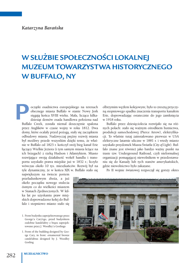 Katarzyna Barańska W SŁUŻBIE SPOŁECZNOŚCI LOKALNEJ MUZEUM TOWARZYSTWA HISTORYCZNEGO W BUFFALO, NY oczątki osadnictwa europejskiego na terenach obecnego miasta Buffalo w stanie Nowy Jork sięgają końca XVIII wieku. Mała, licząca kilkadziesiąt domów osada handlowa położona nad Buffalo Creek, została niemal doszczętnie spalona przez Anglików w czasie wojny w roku 1812. Dwa domy, które ocalały przed pożogą, stały się zaczątkiem odbudowy miasta. Nadzwyczaj prężny rozwój miasta był możliwy przede wszystkim dzięki temu, że właśnie w Buffalo od 1825 r. kończył swój bieg kanał Erie łączący Wielkie Jeziora (i tym samym miasta leżące na ich brzegach) z rzeką Hudson i Atlantykiem. Miasto rozwijające swoją działalność wokół handlu i transportu uzyskało prawa miejskie już w 1832 r.; liczyło wówczas około 10 tys. mieszkańców. Rozwój był na tyle dynamiczny, że w końcu XIX w. Buffalo stało się największym na świecie portem przeładunkowym zboża, a już około początku nowego stulecia ósmym co do wielkości miastem w Stanach Zjednoczonych. W kilka lat po uzyskaniu praw miejskich doprowadzono kolej do Buffalo i stopniowo miasto stało się 1. Front budynku zaprojektowanego przez George’a Cary'ego, przed budynkiem ozdobne kandelabry z brązu zaprojektowane przez J. Woodley’a Goslinga 1. Front of the building designed by George Cary, in front: ornamental bronze candelabras designed by J. Woodley Gosling 282 MUZEALNICTWO olbrzymim węzłem kolejowym; było to zresztą przyczyną stopniowego spadku znaczenia transportu kanałem Erie, doprowadzając ostatecznie do jego zamknięcia w 1918 roku. Buffalo przez dziesięciolecia rozwijało się na różnych polach: stało się ważnym ośrodkiem hutnictwa, produkcji samochodowej (Pierce Arrow), elektryfikacji. To właśnie tutaj zainstalowano pierwsze w USA elektryczne latarnie uliczne w 1881 r. i wtedy miasto uzyskało przydomek Miasta Światła (City of Light). Buffalo znane jest również jako bardzo ważny punkt na trasie tzw. Underground Railroad, czyli nieformalnej organizacji pomagającej niewolnikom w przedostawaniu się do Kanady lub tych stanów amerykańskich, gdzie niewolnictwo było zakazane. Po II wojnie światowej rozpoczął się gorszy okres Z zagranicy 2. Południowy portyk budynku muzeum, przed nim statua Abrahama Lincolna autorstwa Charlesa Niehausa 2. Southern portico of the museum building, in front: statue of Abraham Lincoln by Charles Niehaus dla miasta – rozwój przemysłu metalowego na Dalekim Wschodzie stopniowo doprowadził do zamknięcia wszystkich hut w Buffalo i okolicznych miastach, zaś rozbudowa sieci autostrad i budowa Drogi Wodnej Świętego Wawrzyńca spowodowały utratę pierwszorzędnej pozycji w zakresie transportu kolejowego, z czasem doprowadzając do niemal zupełnego zaniku ruchu kolejowego. Od lat 50. ubiegłego wieku rozpoczął się również powolny spadek liczby ludności: obecnie miasto zamieszkuje około 280 tys. mieszkańców, to jest mniej więcej połowę stanu zaludnienia, jaki był około roku 1950, tyle samo natomiast, co w końcu XIX wieku. Ten stan spowodowany jest z jednej strony sytuacją ekonomiczną, a z drugiej – ogólnoamerykańskim trendem suburbanizacji. Obecnie miasto, choć przeżywa kryzys, znane jest jako prężny ośrodek akademicki. Należy tu przede wszystkim wymienić uczelnie założone już w wieku XIX: University of Buffalo (ufundowany w 1846 r.) oraz Canisius College – katolicką uczelnię działającą od 1870 roku. Młode i prężnie rozwijające się miasto już wkrótce stało się obiektem zainteresowań historycznych, co zaowocowało utworzeniem w 1862 r. Towarzystwa Historycznego (obecnie noszącego nazwę Buffalo and Erie County Historical Society – BECHS). Inicjatorem był były prezydent Stanów Zjednoczonych Millard Fillmore, który już wcześniej przyczynił się do założenia uniwersytetu. W czasie adresu wygłoszonego podczas inauguracji podkreślał konieczność sięgania do zasobów historii miasta (wszak istniało wówczas zaledwie od kilkudziesięciu lat!), która miała być nauką na przyszłość. Według niego ludzie są niczym aktorzy, którzy pojawiają się na scenie tylko po to, by w wielkim dramacie życia odegrać rolę wyznaczoną im przez Opatrzność, a potem zniknąć z naszych oczu na zawsze. Ich dzieła jednak, materialne i duchowe, pozostają, błogosławione lub przeklinane przez ludzi, zależnie od tego czy były dobre, czy złe. Rola Towarzystwa Historycznego polegała – jak wielokrotnie podkreślano – na zachowywaniu znaków przeszłości. Ostatnia część przemówienia Fillmore’a jest często cytowana i stanowi swego rodzaju sformułowanie misji Towarzystwa: Niech ta instytucja będzie wielkim repozytorium wszystkich rzeczy, które mają rzucać światło na naszą historię. Książki, gazety, listy, broszury, mapy, medale i zabytki wszelkiego rodzaju powinny tu być zdeponowane. A nasi obywatele niech zjednoczą serca i dłonie w budowaniu społeczeństwa, które jeśli oddaje sprawiedliwość zmarłym, odzwierciedla szacunek dla żyjących. Poza tworzeniem kolekcji wszelkich śladów historii Buffalo, a później także Hrabstwa Erie, Towarzystwo uznawało za swój cel gromadzenie i publikowanie danych statystycznych dotyczących handlu, przemysłu i życia gospodarczego tego obszaru. Dane i doniesienia o działalności Towarzystwa publikowane były w dorocznych raportach, które sukcesywnie ukazywały się w okresie 1887-1952, a także w licznych wydawnictwach o charakterze zarówno roczników (np. „Publications of the Buffalo Historical Society” 3. Hall główny muzeum, po prawej fortepian z Wystawy Panamerykańskiej 3. Main hall of the museum, to the right: a piano from the PanAmerican Exposition MUZEALNICTWO 283 Z zagranicy 4. Wejściowe drzwi do muzeum zaprojektowane przez J. Woodley’a Goslinga, przedstawiające personifikacje Historii i Etnologii