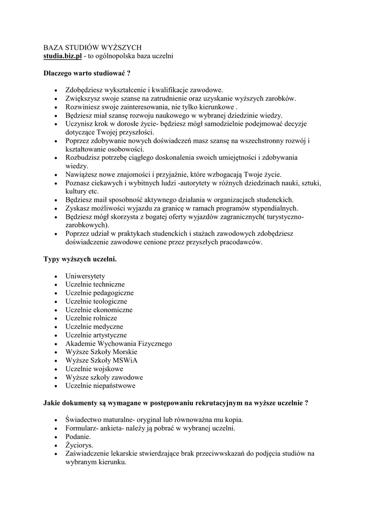 BAZA STUDIÓW WYŻSZYCH studia.biz.pl - to ogólnopolska baza uczelni Dlaczego warto studiować ? Zdobędziesz wykształcenie i kwalifikacje zawodowe. Zwiększysz swoje szanse na zatrudnienie oraz uzyskanie wyższych zarobków. Rozwiniesz swoje zainteresowania, nie tylko kierunkowe . Będziesz miał szansę rozwoju naukowego w wybranej dziedzinie wiedzy. Uczynisz krok w dorosłe życie- będziesz mógł samodzielnie podejmować decyzje dotyczące Twojej przyszłości. Poprzez zdobywanie nowych doświadczeń masz szansę na wszechstronny rozwój i kształtowanie osobowości. Rozbudzisz potrzebę ciągłego doskonalenia swoich umiejętności i zdobywania wiedzy. Nawiążesz nowe znajomości i przyjaźnie, które wzbogacają Twoje życie. Poznasz ciekawych i wybitnych ludzi -autorytety w różnych dziedzinach nauki, sztuki, kultury etc. Będziesz maił sposobność aktywnego działania w organizacjach studenckich. Zyskasz możliwości wyjazdu za granicę w ramach programów stypendialnych. Będziesz mógł skorzysta z bogatej oferty wyjazdów zagranicznych( turystycznozarobkowych). Poprzez udział w praktykach studenckich i stażach zawodowych zdobędziesz doświadczenie zawodowe cenione przez przyszłych pracodawców. Typy wyższych uczelni. Uniwersytety Uczelnie techniczne Uczelnie pedagogiczne Uczelnie teologiczne Uczelnie ekonomiczne Uczelnie rolnicze Uczelnie medyczne Uczelnie artystyczne Akademie Wychowania Fizycznego Wyższe Szkoły Morskie Wyższe Szkoły MSWiA Uczelnie wojskowe Wyższe szkoły zawodowe Uczelnie niepaństwowe Jakie dokumenty są wymagane w postępowaniu rekrutacyjnym na wyższe uczelnie ? Świadectwo maturalne- oryginał lub równoważna mu kopia. Formularz- ankieta- należy ją pobrać w wybranej uczelni. Podanie. Życiorys. Zaświadczenie lekarskie stwierdzające brak przeciwwskazań do podjęcia studiów na wybranym kierunku. 3-5 fotografii (bez nakrycia głowy) w formacie legitymacyjnym. Potwierdzenie uciszenia opłaty egzaminacyjnej. O PRAWIE PRACY Zapraszam do zapoznania się z podstawowymi zagadnieniami dotyczącymi problematyki prawa pracy. Poniższe informacje przeznaczone są w szczególności dla osób, które podejmują zatrudnienie po raz pierwszy. Gdy ubiegasz się o pracę, pracodawca może wymagać od Ciebie przedstawienia następujących danych: imię (imiona) i nazwisko, imiona rodziców, miejsce zamieszkania, (a w przypadku zamieszkania w innym miejscu niż miejsce zameldowania – adres do korespondencji), data urodzenia, wykształcenie i przebieg dotychczasowego zatrudnienia, Przez nawiązanie stosunku pracy pracownik zobowiązuje się do wykonania pracy określonego rodzaju na rzecz pracodawcy i pod jego kierownictwem oraz w miejscu i czasie wyznaczonym przez pracodawcę, a pracodawca do zatrudnienia pracownika za określonym wynagrodzeniem. Zakres podstawowych obowiązków pracownika: sumienne i staranne wykonywanie pracy na rzecz pracodawcy i pod jego kierownictwem wykonywanie poleceń służbowych przełożonego pod warunkiem, że nie są one sprzeczne z przepisami prawa bądź umową o pracę przestrzeganie ustalonego w zakładzie pracy czasu pracy przestrzeganie regulaminu pracy oraz ustalonego w zakładzie pracy porządku przestrzeganie przepisów i zasad bezpieczeństwa i higieny pracy oraz przepisów przeciwpożarowych dbałość o dobro zakładu pracy zachowanie w tajemnicy informacji, których ujawnienie mogłoby narazić pracodawcę na szkodę Zakres podstawowych obowiązków pracodawcy: terminowa zapłata pracownikowi wynagrodzenia zapewnienie bezpiecznych i higienicznych warunków pracy oraz systematyczne szkolenie pracowników w tym zakresie zapoznanie pracownika z zakresem jego obowiązków, sposobem wykonywania pracy na wyznaczonym stanowisku oraz podstawowymi uprawnieniami przestrzeganie czasu pracy pracownika zgodnie z obowiązującymi przepisami prowadzenie ewidencji czasu pracy oraz wszelkiej dokumentacji w sprawach związanych ze stosunkiem pracy zapłata pracownikowi dodatkowego wynagrodzenia za pracę w godzinach nadliczbowych oraz dodatku za pracę w porze nocnej udzielanie pracownikowi urlopu oraz dni wolnych od pracy ułatwienie pracownikowi podnoszenia kwalifikacji zawodowych stosowanie obiektywnych i sprawiedliwych kryteriów oceny pracownika i wyników jego pracy poszanowanie godności i innych dóbr osobistych pracownika przeciwdziałanie dyskryminacji w zatrudnieniu przeciwdziałanie lobbingowi w środowisku pracy UMOWA O PRACĘ Umowa o pracę musi zawierać następujące elementy: oznaczenie stron (kto jest pracodawcą, kto jest pracownikiem), rodzaj umowy, datę jej zawarcia, rodzaj i miejsce wykonywania pracy, wynagrodzenie za pracę, termin rozpoczęcia pracy (jeśli nie jest dokładnie określony w umowie, to przyjmuje się, że jest to dzień podpisania umowy), wymiar czasu pracy. Umowa o pracę daje pracownikowi następujące uprawnienia: prawo do urlopu (wypoczynkowego, macierzyńskiego, zdrowotnego), określenie możliwości dokształcania się, wynagrodzenie za czas choroby (bezpłatny dostęp do usług medycznych, pokrycie kosztów leczenia i rehabilitacji, itp.), zaliczenie stażu pracy (bez względu na fakt odprowadzania składek na ubezpieczenie emerytalne i rentowe), zasady wypowiadania umowy, zasady wynagradzania za pracę w godzinach nadliczbowych Przed nawiązaniem stosunku pracy pracodawca ma obowiązek skierować potencjalnego pracownika na badania lekarskie, które pozwolą stwierdzić, czy dana osoba może wykonać daną pracę. Umowa o pracę może być zawarta: na okres próbny, na czas określony, na czas określony w celu zastępstwa, na czas wykonywania określonej pracy, na czas nieokreślony. Umowa na okres próbny pozwala sprawdzić umiejętności i kwalifikacje pracownika na danym stanowisku, pracownikowi daje z kolei możliwość oceny, czy dana praca spełnia jego oczekiwania. Umowa na okres próbny może być zawarta na czas ustalony przez strony, nieprzekraczający jednak trzech 