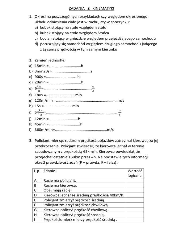 ZADANIA Z KINEMATYKI 1. Określ na poszczególnych przykładach czy względem określonego układu odniesienia ciało jest w ruchu, czy w spoczynku: a) kubek stojący na stole względem stołu b) kubek stojący na stole względem Słońca c) bocian stojący w gnieździe względem przejeżdżającego samochodu d) poruszający się samochód względem drugiego samochodu jadącego z tą samą prędkością w tym samym kierunku 2. a) b) c) d) Zamień jednostki: 15min =……………………………h 3min20s =…………………………………s 900s =…………………………..h 20min = …………………………..h e) 9 =…………………………………………. f) 180s =…………………………min g) 120m/min =………………………………………………………m/s h) 15s =………………………..min i) 54 =……………………………………………………………….. j) 12min =…………………………h k) 45min =…………………………..h l) 360m/min=……………………………………………..m/s 3. Policjant mierząc radarem prędkość pojazdów zatrzymał kierowcę za jej przekroczenie. Policjant stwierdził, że kierowca jechał w terenie zabudowanym z prędkością 65km/h. Kierowca powiedział, że przejechał ostatnie 160km przez 4h. Na podstawie tych informacji określ prawdziwość zdań (P – prawda, F – fałsz) : L.p. Zdanie A B C D E F G H I Racje ma policjant. Rację ma kierowca. Obaj mają rację. Kierowca jechał ze średnią prędkością 40km/h. Policjant zmierzył prędkość średnią. Policjant zmierzył prędkość chwilową. Kierowca obliczył prędkość chwilową. Kierowca obliczył prędkość średnią. Prędkościomierz mierzy prędkość średnią . Wartość logiczna 4. Które z ciał przedstawionych w tabeli ma największą, a które najmniejszą prędkość średnią? Ciało Odległość Czas ruchu 1 5km 10min 2 36km 1h 3 2400m 2min 4 40m 5. Rowerzysta przez 1 godzinę przebył 12km, a po następnych 30min 9km. Jaka była jego prędkość średnia? 6. Które z ciał przedstawionych w tabeli pokonało najdłuższą, a które najkrótszą drogę? Ciało Prędkość Czas ruchu 1 10m/s 200s 2 60km/h 2min 3 15m/s 0,5min 4 18km/h 7. Pojazd porusza się z prędkością 36 przez 10min. Jaką odległość przebędzie? 8. Które z ciał przedstawionych w tabeli ma najmniejsze, a które największe przyspieszenie? Ciało Wzrost prędkości Czas zmiany 1 10m/s 2s 2 36km/h min 3 15m/s 2min 4 18km/h 9. Na podstawie tabeli określ: a) rodzaj ruchu b) prędkość początkową i prędkość w 4s ruchu c) przyspieszenie t, s v, 0 0 1 3 2 6 3 9 t, s v, 0 1 1 4 2 7 3 10 t, s S, m 0 0 1 3 2 6 3 9 t, s S, m 0 0 1 1 2 4 3 9 10.Sporządź tabelę i wykres zależności (do 4s ruchu) prędkości od czasu w przypadkach, gdy: a) ciało porusz się ruchem jednostajnym z prędkością 5 , b) ciało porusz się ruchem jednostajnie przyspieszonym, vp= 0, a=2 11.Sporządź tabelę i wykres zależności drogi od czasu w przypadkach, gdy: c) ciało porusz się ruchem jednostajnym z prędkością 3 , d) ciało porusz się ruchem jednostajnie przyspieszonym, vp= 0, a=1 12.Uzupełnij tabele tak, by przedstawiały ruch: a) jednostajny t, s 0 1 v, b) jednostajny t, s 0 S, m c) jednostajnie przyspieszony t, s 0 v, d) jednostajnie przyspieszony t, s 0 S, m 0 e) jednostajnie opóźniony t, s 0 v, 2 3 3 1 5 2 3 1 6 2 3 1 1 2 3 1 9 2 3 13.*Ciało poruszające się ze stałą prędkością po 10 przebyło odległość 0,4km. Jak długo trwał ruch? 14. *Motocyklista rozpoczął ruch i przebył drogę 0,8km poruszając się ruchem jednostajnie przyspieszonym z przyspieszeniem 0,5 . Jak długo trwał ten ruch? 15. Na podstawie wykresów określ: a) rodzaje ruchów na poszczególnych odcinkach, b) przyspieszenie na 1, 2 i 4 odcinku c) drogę na odcinku 1 i 2 v, m/s 4 0 2 t, s 16. Na podstawie wykresów określ: a) rodzaje ruchów na poszczególnych odcinkach b) prędkość na 1 i 3 odcinku c) drogę na odcinku 1 i 2 d) całkowitą drogę e) prędkość średnią ruchu S, m 10 0 1 t, s 17. Na podstawie wykresu zależności drogi od czasu odpowiedz na pytania ( na osi drogi każda kratka to 10): S, m 0 1 2 a) b) c) d) e) f) g) 6 8 10 t, s Jakie ruchy przedstawiają wykresy? Które ciało poruszało się z największą prędkością? Jaką drogę pokonały poszczególne ciała? Jakie wartości mają prędkości poszczególnych ciał? Jaką drogę pokona ciało (zielone) po 3 s ruchu? Po jakim czasie ciało (czerwone) pokona 30m? Jak długo trwał ruch ciała (niebieskiego)? 18. Na podstawie wykresu zależności prędkości od czasu odpowiedz na pytania (na osi prędkości każda kratka to 5): v, m/s 0 1 2 6 8 10 t, s h) Jakie ruchy przedstawiają poszczególne wykresy? i) Które ciało miało największą prędkość początkową? j) Jaką drogę pokonało ciało (czerwone)? k) Jakie wartości mają prędkości początkowe poszczególnych ciał? l) Jaką drogę pokona ciało (zielone)? m) Po jakim czasie ciało (zielone) osiągnie prędkość 20m/s? n) Jak długo trwał ruch ciała (niebieskiego)? 19. Do każdej tabeli dopasuj rodzaj ruchu: A) B) t, s 0 1 2 3 v, m/s 4 4 4 4 C) t, s 0 1 2 3 v, m/s 0 3 6 9 D) t, s 0 1 2 3 v, m/s 10 8 6 4 E) t, s 0 1 2 3 v, m/s 0 2 4 7 F) t, s 0 1 2 3 S, m 0 2 4 6 G) t, s 0 1 2 3 S, m 0 1 4 9 H) t, s 0 1 2 3 S, m 4 4 4 4 t, s 0 1 2 3 v, m/s 0 4 8 12 1) ruch jednostajnie przyspieszony 2) ruch jednostajny 3) ruch jednostajnie opóźniony 4) spoczynek (bezruch) 5) ruch niejednostajnie przyspieszony 6) ruch niejednostajnie opóźniony wykres A B C D E F G H ruch 20.Określ wartość logiczną zdań: L.p. Zdanie A B C D E F G H Droga to tor ruchu. Droga to odległość jaką pokonało ciało. Tor to inaczej ślad. Przyspieszenie określa jak prędkość zmienia się w czasie. Prędkość określa drogę przebytą w jednostce czasu. W ruchu jednostajnym prędkość rośnie. W ruchu jednostajnie przyspi