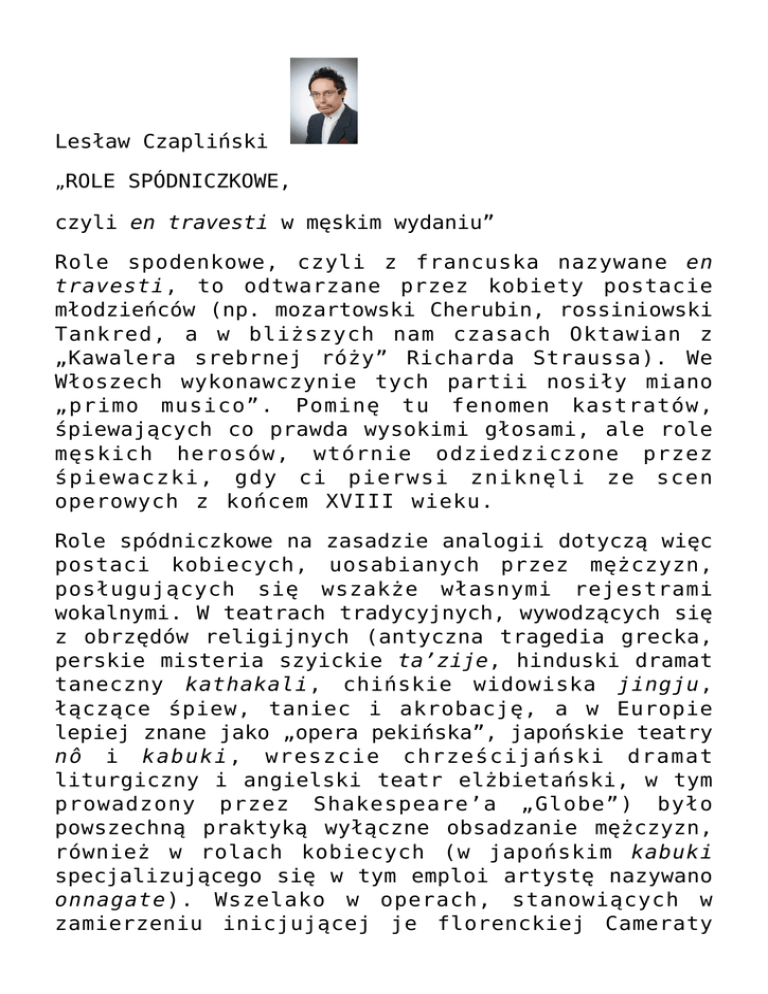 Lesław Czapliński „ROLE SPÓDNICZKOWE, czyli en travesti w męskim wydaniu” Role spodenkowe, czyli z francuska nazywane en travesti, to odtwarzane przez kobiety postacie młodzieńców (np. mozartowski Cherubin, rossiniowski Tankred, a w bliższych nam czasach Oktawian z „Kawalera srebrnej róży” Richarda Straussa). We Włoszech wykonawczynie tych partii nosiły miano „primo musico”. Pominę tu fenomen kastratów, śpiewających co prawda wysokimi głosami, ale role męskich herosów, wtórnie odziedziczone przez śpiewaczki, gdy ci pierwsi zniknęli ze scen operowych z końcem XVIII wieku. Role spódniczkowe na zasadzie analogii dotyczą więc postaci kobiecych, uosabianych przez mężczyzn, posługujących się wszakże własnymi rejestrami wokalnymi. W teatrach tradycyjnych, wywodzących się z obrzędów religijnych (antyczna tragedia grecka, perskie misteria szyickie ta’zije, hinduski dramat taneczny kathakali, chińskie widowiska jingju, łączące śpiew, taniec i akrobację, a w Europie lepiej znane jako „opera pekińska”, japońskie teatry nô i kabuki, wreszcie chrześcijański dramat liturgiczny i angielski teatr elżbietański, w tym prowadzony przez Shakespeare’a „Globe”) było powszechną praktyką wyłączne obsadzanie mężczyzn, również w rolach kobiecych (w japońskim kabuki specjalizującego się w tym emploi artystę nazywano onnagate). Wszelako w operach, stanowiących w zamierzeniu inicjującej je florenckiej Cameraty próbę wskrzeszenia starożytnej tragedii w oparciu o wyobrażenia jakimi wtedy rozporządzano, od początku występowały śpiewaczki. Aliści w siedemnastowiecznej operze weneckiej pojawiła się konwencja powierzania tenorom drugoplanowych ról zaawansowanych wiekiem komicznych postaci kobiecych. Już w „Koronacji Poppei” (1642) Claudio Monteverdiego mamy do czynienia ze starymi piastunkami obydwu antagonistek: anonimową Mamką cesarzowej Oktawii oraz wierną Arnaltą, dawną nianią Poppei, nowej kochanki cezara Nerona. W „Statirze, perskiej księżniczce” Francesco Cavallego z 1655 roku jest to dawna piastunka tytułowej bohaterki – Elissena – kobieta w podeszłym wieku i o bogatej przeszłości. Przywołując wspomnienie zaznanych niegdyś rozkoszy z ogrodnikiem, cynicznie doradza swej pani, aby nie miała skrupułów, lecz póki czas korzystała z młodości i nie rezygnowała z okazji do pocieszenia się w trakcie rozłąki z ukochanym. Dwuznaczność obsadzenia tej roli przez mężczyznę dochodzi szczególnie do głosu w scenie prześmiewczych umizgów ze strony Eurilla, młodziutkiego pazia księżniczki. Z podobnym komizmem sytuacyjnym mamy do czynienia w przypadku o cztery lata wcześniejszej „Calisto” tego samego kompozytora, kiedy mały Satyr napastuje podstarzałą nimfę Linfeę, która pod wpływem sentymentalnych wzdychań młodego pasterza Eudymiona do jej pani – Diany – również zapragnęła zasmakować w cielesnych uciechach. Od tej pory bezskutecznie prześladuje nieszczęsnego adoratora bogini. W operze tej nie brak zresztą innych wątków erotycznych o perwersyjnym zabawieniu jak namiętność tytułowej bohaterki do Diany, co wykorzystuje Jowisz, przybierając jej postać, aby tym sposobem uwieść Calisto, przy czym staje się zarazem przedmiotem adoracji ze strony także zwiedzionego takim pozorem Eudymiona. Pod względem muzycznym lubieżne zapały Elisseny i Linfei przybierają formę utrzymanych w skocznym rytmie mezz’arii. W dobie przywracania barokowej twórczości do repertuaru w omawianym emploi zasłynął szwajcarski tenor Hugues Adhémar Cuénod. Na grunt francuski praktykę tę przeszczepił pochodzący z Włoch Jean-Baptiste Lully, przy czym dotyczyło to głównie postaci, mających budzić grozę, jak Meduza w „Perseuszu” z 1682 roku, bądź alegorycznych, czego przykładem jest Nienawiść w „Armidzie”, przybywająca na wezwanie tytułowej bohaterki w otoczeniu męskiego chóru, by ukarać Rinalda, obojętnego na wdzięki pięknej czarodziejki. Gdy w ostatniej chwili tamta rezygnuje z zemsty, Nienawiść w brawurowej arii zarzeka się więcej nie interweniować w ziemskie awantury miłosne. Podobnie postępował Jean-Philippe Rameau w odniesieniu do postaci o męskim charakterze jak w przypadku bogini wojny Bellony z prologu do „Wykwintnych Indii” (Les Indes galantes”}, w którym zachęca ona młodych Francuzów, Hiszpanów, Włochów i Polaków do zaprawiania się w żołnierskim rzemiośle i wykazania w ten sposób swych rycerskich przymiotów. Stosownie do dziedziny, nad którą sprawuje pieczę, śpiewa basem. W „Paladynach” z 1760 roku jest to natomiast dobra wróżka Manto, pomagająca parze młodych kochanków pokrzyżować plany opiekuna dziewczyny, który sam pragnie się z nią ożenić. Za sprawą czarów unieszkodliwia srogiego strażnika, w cudowny sposób przemienia zamek, w którym skryli się młodzi, w chiński pałac, wreszcie sama uwodzi podstarzałego zalotnika, przybierając postać mauretańskiej niewolnicy, czym do reszty kompromituje go jako pretendenta do ręki wychowanicy, która juz bez przeszkód może złączyć się ze swym ukochanym. O ile wszystkie dotychczasowe przykłady odnosiły się do postaci drugoplanowych, to we wcześniejszej o piętnaście lat „Platei” rzecz dotyczyła tytułowej bohaterki. Tym razem nie jest ona w podeszłym wieku, lecz pozbawioną krzty urody nimfą błotna, cynicznie wykorzystaną przez Jowisza i Merkurego w ich intrydze przeciw zazdrosnej Junonie, która, gdy przekona się, kto w istocie jest rzekomą wybranką jej męża, wyzbędzie się ostatecznie swych bezpodstawnych podejrzeń. W wykpieniu nieświadomej niczego nimfy zawiera się znaczna doza okrucieństwa, a w fakcie, że prapremiera 31 marca 1745 roku w Wersalu uświetniała zaślubiny delfina Ludwika (pierworodnego syna Ludwika XV i Marii Leszczyńskiej) z hiszpańską księżniczką Marią Teresą (niebawem zmarł