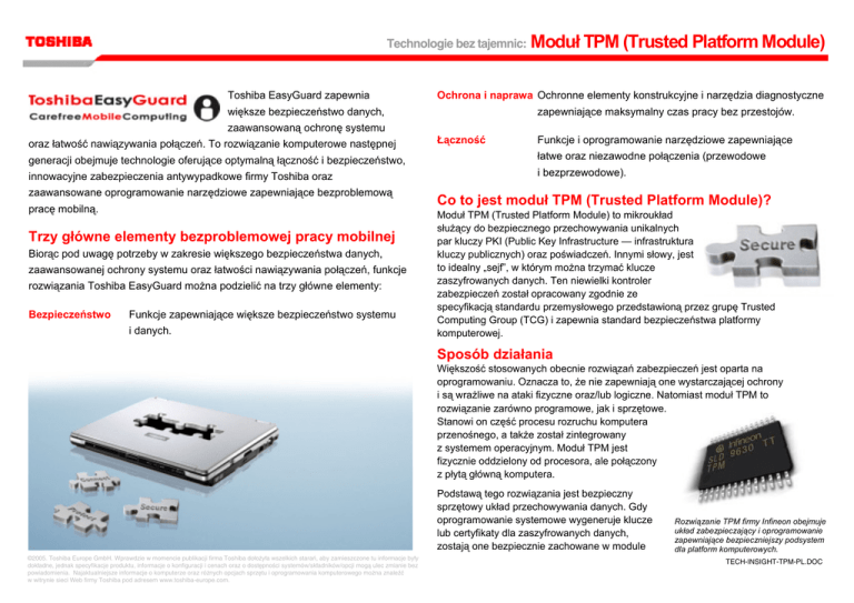 Technologie bez tajemnic: Toshiba EasyGuard zapewnia Moduł TPM (Trusted Platform Module) Ochrona i naprawa Ochronne elementy konstrukcyjne i narzędzia diagnostyczne większe bezpieczeństwo danych, zapewniające maksymalny czas pracy bez przestojów. zaawansowaną ochronę systemu oraz łatwość nawiązywania połączeń. To rozwiązanie komputerowe następnej Łączność Funkcje i oprogramowanie narzędziowe zapewniające generacji obejmuje technologie oferujące optymalną łączność i bezpieczeństwo, łatwe oraz niezawodne połączenia (przewodowe innowacyjne zabezpieczenia antywypadkowe firmy Toshiba oraz i bezprzewodowe). zaawansowane oprogramowanie narzędziowe zapewniające bezproblemową pracę mobilną. Trzy główne elementy bezproblemowej pracy mobilnej Biorąc pod uwagę potrzeby w zakresie większego bezpieczeństwa danych, zaawansowanej ochrony systemu oraz łatwości nawiązywania połączeń, funkcje rozwiązania Toshiba EasyGuard można podzielić na trzy główne elementy: Bezpieczeństwo Funkcje zapewniające większe bezpieczeństwo systemu i danych. Co to jest moduł TPM (Trusted Platform Module)? Moduł TPM (Trusted Platform Module) to mikroukład służący do bezpiecznego przechowywania unikalnych par kluczy PKI (Public Key Infrastructure — infrastruktura kluczy publicznych) oraz poświadczeń. Innymi słowy, jest to idealny „sejf”, w którym można trzymać klucze zaszyfrowanych danych. Ten niewielki kontroler zabezpieczeń został opracowany zgodnie ze specyfikacją standardu przemysłowego przedstawioną przez grupę Trusted Computing Group (TCG) i zapewnia standard bezpieczeństwa platformy komputerowej. Sposób działania Większość stosowanych obecnie rozwiązań zabezpieczeń jest oparta na oprogramowaniu. Oznacza to, że nie zapewniają one wystarczającej ochrony i są wrażliwe na ataki fizyczne oraz/lub logiczne. Natomiast moduł TPM to rozwiązanie zarówno programowe, jak i sprzętowe. Stanowi on część procesu rozruchu komputera przenośnego, a także został zintegrowany z systemem operacyjnym. Moduł TPM jest fizycznie oddzielony od procesora, ale połączony z płytą główną komputera. Podstawą tego rozwiązania jest bezpieczny sprzętowy układ przechowywania danych. Gdy oprogramowanie systemowe wygeneruje klucze lub certyfikaty dla zaszyfrowanych danych, zostają one bezpiecznie zachowane w module ©2005. Toshiba Europe GmbH. Wprawdzie w momencie publikacji firma Toshiba dołożyła wszelkich starań, aby zamieszczone tu informacje były dokładne, jednak specyfikacje produktu, informacje o konfiguracji i cenach oraz o dostępności systemów/składników/opcji mogą ulec zmianie bez powiadomienia. Najaktualniejsze informacje o komputerze oraz różnych opcjach sprzętu i oprogramowania komputerowego można znaleźć w witrynie sieci Web firmy Toshiba pod adresem www.toshiba-europe.com. Rozwiązanie TPM firmy Infineon obejmuje układ zabezpieczający i oprogramowanie zapewniające bezpieczniejszy podsystem dla platform komputerowych. TECH-INSIGHT-TPM-PL.DOC Technologie bez tajemnic: TPM. Te zapisane fragmenty informacji służą do uwierzytelniania, w razie potrzeby zapewniają dane dotyczące integralności platformy, jak również informują użytkownika i partnerów w komunikacji (np. dostawcę zawartości) o stanie środowiska sprzętowego i programowego. Informacje o stanie są podawane na podstawie unikalności danej platformy, która z kolei jest oparta na unikalnych kluczach przechowywanych w module TPM. Każdy moduł TPM ma unikalny numer, ale system uwierzytelnia użytkownika na podstawie kluczy lub identyfikatorów przechowywanych w tym module, a nie według tego unikalnego numeru. W rezultacie moduł TPM jest odporny na ataki logiczne i fizyczne, chroniąc zapisane klucze i poświadczenia. Najwyższy poziom bezpieczeństwa można osiągnąć dzięki dwukierunkowemu uwierzytelnianiu, polegającemu na używaniu mikroukładu TPM do identyfikacji platformy oraz klucza USB lub tokenu SD do uwierzytelniania użytkownika. Ta metoda dwukierunkowego uwierzytelniania może działać tylko osobno, gdyż na przykład nie jest możliwe zapisanie tokenu SD w module TPM. Moduł TPM (Trusted Platform Module) Podsumowanie funkcji i zalet X Moduł TPM (Trusted Platform Module) Zapewnia ochronę poufnych danych, a szyfrowanie i podpisy cyfrowe chronią zawartość i prywatność. X Rozwiązanie sprzętowoprogramowe Odporność na ataki logiczne i fizyczne w celu ochrony zapisanych kluczy i poświadczeń. X Funkcje zgodne ze standardem przemysłowym (np. TCG) Możliwość używania na wielu platformach. Jakich aplikacji można używać z modułem TPM? X Szyfrowanie plików i folderów • Windows EFS (Encrypting File System — system szyfrowania plików) • Zaszyfrowany dysk wirtualny (Personal Secure Drive — bezpieczny dysk osobisty) X Bezpieczna poczta e-mail Wersje programów Outlook, Outlook Express i Netscape Communicator z obsługą podpisów cyfrowych oraz funkcjami szyfrowania i deszyfrowania poczty X Bezpieczne strony sieci Web Przeglądarki Internet Explorer i Netscape Communicator z obsługą bezpiecznych protokołów (SSL) X Inne • Wirtualna sieć prywatna (Virtual Private Network, VPN) • Hasło jednorazowe (np. RSA SecurID) • Uwierzytelnianie klienta TECH-INSIGHT-TPM-PL.DOC