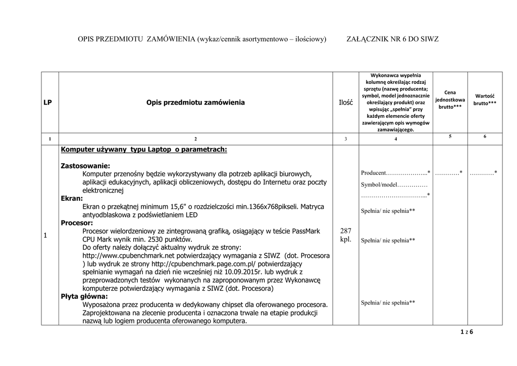 OPIS PRZEDMIOTU ZAMÓWIENIA (wykaz/cennik asortymentowo – ilościowy) LP 1 ZAŁĄCZNIK NR 6 DO SIWZ Opis przedmiotu zamówienia Ilość Wykonawca wypełnia kolumnę określając rodzaj sprzętu (nazwę producenta; symbol, model jednoznacznie określający produkt) oraz wpisując „spełnia” przy każdym elemencie oferty zawierającym opis wymogów zamawiającego. 2 3 4 Cena jednostkowa brutto*** Wartość brutto*** 5 6 Komputer używany typu Laptop o parametrach: 1 Zastosowanie: Komputer przenośny będzie wykorzystywany dla potrzeb aplikacji biurowych, aplikacji edukacyjnych, aplikacji obliczeniowych, dostępu do Internetu oraz poczty elektronicznej Ekran: Ekran o przekątnej minimum 15,6" o rozdzielczości min.1366x768pikseli. Matryca antyodblaskowa z podświetlaniem LED Procesor: Procesor wielordzeniowy ze zintegrowaną grafiką, osiągający w teście PassMark CPU Mark wynik min. 2530 punktów. Do oferty należy dołączyć aktualny wydruk ze strony: http://www.cpubenchmark.net potwierdzający wymagania z SIWZ (dot. Procesora ) lub wydruk ze strony http://cpubenchmark.page.com.pl/ potwierdzający spełnianie wymagań na dzień nie wcześniej niż 10.09.2015r. lub wydruk z przeprowadzonych testów wykonanych na zaproponowanym przez Wykonawcę komputerze potwierdzający wymagania z SIWZ (dot. Procesora) Płyta główna: Wyposażona przez producenta w dedykowany chipset dla oferowanego procesora. Zaprojektowana na zlecenie producenta i oznaczona trwale na etapie produkcji nazwą lub logiem producenta oferowanego komputera. Producent………………...* …………* …………* Symbol/model…………… …………………………...* Spełnia/ nie spełnia** 287 kpl. Spełnia/ nie spełnia** Spełnia/ nie spełnia** 1z6 Pamięć RAM: Min. 4GB Karta graficzna: Zintegrowana w procesorze z możliwością dynamicznego przydzielenia pamięci systemowej Napęd optyczny: Wbudowany DVD+/-RW Klawiatura: Klawiatura w układzie US-QWERTY Touchpad wyposażony w 2 niezależne klawisze funkcyjne Multimedia: Karta dźwiękowa zintegrowana z płytą główną, zgodna z High Definition, wbudowane głośniki stereo Bezpieczeństwo: Złącze typu Kensington Lock System operacyjny: Zainstalowany system operacyjny klasy PC musi spełniać następujące wymagania, poprzez wbudowane mechanizmy, bez użycia dodatkowych aplikacji: • możliwość dokonywania aktualizacji i poprawek systemu przez Internet z możliwością wyboru instalowanych poprawek; • Możliwość dokonywania uaktualnień sterowników urządzeń przez Internet – witrynę producenta systemu; • Darmowe aktualizacje w ramach wersji systemu operacyjnego przez Internet (niezbędne aktualizacje, poprawki, biuletyny bezpieczeństwa muszą być dostarczane bez dodatkowych opłat) – wymagane podanie nazwy strony serwera WWW; • Internetowa aktualizacja zapewniona w języku polskim; • Wbudowana zapora internetowa (firewall) dla ochrony połączeń internetowych; zintegrowana z systemem konsola do zarządzania ustawieniami zapory i regułami IP v4 i v6; • Zlokalizowane w języku polskim, co najmniej następujące elementy: menu, odtwarzacz multimediów, pomoc, komunikaty systemowe; Spełnia/ nie spełnia** Spełnia/ nie spełnia** Spełnia/ nie spełnia** Spełnia/ nie spełnia** Spełnia/ nie spełnia** Spełnia/ nie spełnia** Spełnia/ nie spełnia** Spełnia/ nie spełnia** 2z6 • • • • • • • • • • • • • • Wsparcie dla większości powszechnie używanych urządzeń peryferyjnych (drukarek, urządzeń sieciowych, standardów USB, Plug &Play, Wi-Fi) Funkcjonalność automatycznej zmiany domyślnej drukarki w zależności od sieci, do której podłączony jest komputer; Interfejs użytkownika działający w trybie graficznym z elementami 3D, zintegrowana z interfejsem użytkownika interaktywna część pulpitu służącą do uruchamiania aplikacji, które użytkownik może dowolnie wymieniać i pobrać ze strony producenta. Możliwość zdalnej automatycznej instalacji, konfiguracji, administrowania oraz aktualizowania systemu; Zabezpieczony hasłem hierarchiczny dostęp do systemu, konta i profile użytkowników zarządzane zdalnie; praca systemu w trybie ochrony kont użytkowników. Zintegrowany z systemem moduł wyszukiwania informacji (plików różnego typu) dostępny z kilku poziomów: poziom menu, poziom otwartego okna systemu operacyjnego; system wyszukiwania oparty na konfigurowalnym przez użytkownika module indeksacji zasobów lokalnych. Zintegrowane z systemem operacyjnym narzędzia zwalczające złośliwe oprogramowanie; aktualizacje dostępne u producenta nieodpłatnie bez ograniczeń czasowych. Funkcjonalność rozpoznawania mowy, pozwalającą na sterowanie komputerem głosowo, wraz z modułem „uczenia się” głosu użytkownika. Zintegrowany z systemem operacyjnym moduł synchronizacji komputera z urządzeniami zewnętrznymi. Wbudowany system pomocy w języku polskim; Możliwość przystosowania stanowiska dla osób niepełnosprawnych (np. słabowidzących); Możliwość zarządzania stacją roboczą poprzez polityki – przez politykę rozumiemy zestaw reguł definiujących lub ograniczających funkcjonalność systemu lub aplikacji; Wdrażanie IPSEC oparte na politykach – wdrażanie IPSEC oparte na zestawach reguł definiujących ustawienia zarządzanych w sposób centralny; Automatyczne występowanie i używanie (wystawianie) certyfikatów PKI 3z6 • • • • • • • • • • • • • • X.509; Rozbudowane polityki bezpieczeństwa – polityki dla systemu operacyjnego i dla wskazanych aplikacji; System posiada narzędzia służące do administracji, do wykonywania kopii zapasowych polityk i ich odtwarzania oraz generowania raportów z ustawień polityk; Wsparcie dla Sun Java i .NET Framework 1.1 i 2.0 i 3.0 – możliwość uruchomienia aplikacji działających we wskazanych środowiskach; Wsparcie dla JScript i VBScript – możliwość uruchamiania interpr