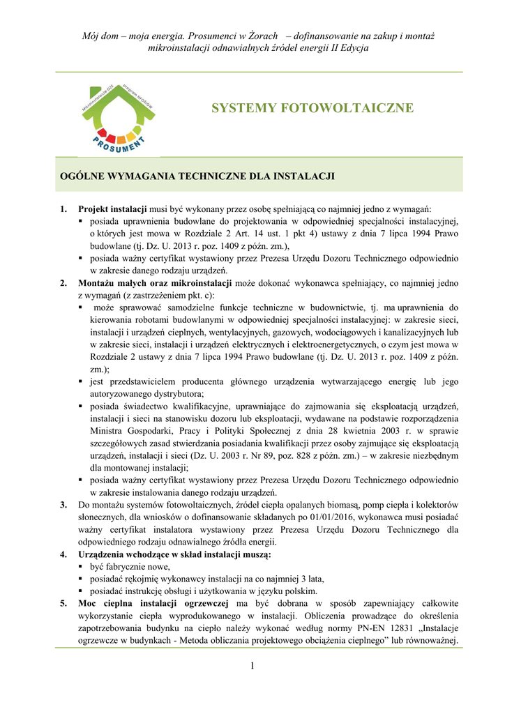 Mój dom – moja energia. Prosumenci w Żorach – dofinansowanie na zakup i montaż mikroinstalacji odnawialnych źródeł energii II Edycja SYSTEMY FOTOWOLTAICZNE OGÓLNE WYMAGANIA TECHNICZNE DLA INSTALACJI 1. 2. 3. 4. 5. Projekt instalacji musi być wykonany przez osobę spełniającą co najmniej jedno z wymagań: posiada uprawnienia budowlane do projektowania w odpowiedniej specjalności instalacyjnej, o których jest mowa w Rozdziale 2 Art. 14 ust. 1 pkt 4) ustawy z dnia 7 lipca 1994 Prawo budowlane (tj. Dz. U. 2013 r. poz. 1409 z późn. zm.), posiada ważny certyfikat wystawiony przez Prezesa Urzędu Dozoru Technicznego odpowiednio w zakresie danego rodzaju urządzeń. Montażu małych oraz mikroinstalacji może dokonać wykonawca spełniający, co najmniej jedno z wymagań (z zastrzeżeniem pkt. c): może sprawować samodzielne funkcje techniczne w budownictwie, tj. ma uprawnienia do kierowania robotami budowlanymi w odpowiedniej specjalności instalacyjnej: w zakresie sieci, instalacji i urządzeń cieplnych, wentylacyjnych, gazowych, wodociągowych i kanalizacyjnych lub w zakresie sieci, instalacji i urządzeń elektrycznych i elektroenergetycznych, o czym jest mowa w Rozdziale 2 ustawy z dnia 7 lipca 1994 Prawo budowlane (tj. Dz. U. 2013 r. poz. 1409 z późn. zm.); jest przedstawicielem producenta głównego urządzenia wytwarzającego energię lub jego autoryzowanego dystrybutora; posiada świadectwo kwalifikacyjne, uprawniające do zajmowania się eksploatacją urządzeń, instalacji i sieci na stanowisku dozoru lub eksploatacji, wydawane na podstawie rozporządzenia Ministra Gospodarki, Pracy i Polityki Społecznej z dnia 28 kwietnia 2003 r. w sprawie szczegółowych zasad stwierdzania posiadania kwalifikacji przez osoby zajmujące się eksploatacją urządzeń, instalacji i sieci (Dz. U. 2003 r. Nr 89, poz. 828 z późn. zm.) – w zakresie niezbędnym dla montowanej instalacji; posiada ważny certyfikat wystawiony przez Prezesa Urzędu Dozoru Technicznego odpowiednio w zakresie instalowania danego rodzaju urządzeń. Do montażu systemów fotowoltaicznych, źródeł ciepła opalanych biomasą, pomp ciepła i kolektorów słonecznych, dla wniosków o dofinansowanie składanych po 01/01/2016, wykonawca musi posiadać ważny certyfikat instalatora wystawiony przez Prezesa Urzędu Dozoru Technicznego dla odpowiedniego rodzaju odnawialnego źródła energii. Urządzenia wchodzące w skład instalacji muszą: być fabrycznie nowe, posiadać rękojmię wykonawcy instalacji na co najmniej 3 lata, posiadać instrukcję obsługi i użytkowania w języku polskim. Moc cieplna instalacji ogrzewczej ma być dobrana w sposób zapewniający całkowite wykorzystanie ciepła wyprodukowanego w instalacji. Obliczenia prowadzące do określenia zapotrzebowania budynku na ciepło należy wykonać według normy PN-EN 12831 „Instalacje ogrzewcze w budynkach - Metoda obliczania projektowego obciążenia cieplnego” lub równoważnej. 1 Mój dom – moja energia. Prosumenci w Żorach – dofinansowanie na zakup i montaż mikroinstalacji odnawialnych źródeł energii II Edycja 6. 7. 8. 9. 10. 11. Zapotrzebowanie na ciepło nie może przekroczyć: w przypadku budynków nowych – 50 W/m2, w przypadku budynków modernizowanych - 80 W/m2 powierzchni ogrzewanej. Instalacja ogrzewcza ma być zrównoważona hydraulicznie. W przypadku instalacji służących wyłącznie na potrzeby przygotowania wody użytkowej (c.w.u), z dofinansowania wyklucza się podłączonych odbiorców ciepła ze scentralizowanej sieci ciepłowniczej. W skład instalacji do produkcji energii elektrycznej, które nie będą podłączane do sieci elektroenergetycznej, muszą wchodzić urządzenia do magazynowania energii, dobrane odpowiednio do mocy instalacji. Inwertery (falowniki) stosowane w instalacjach muszą posiadać certyfikat zgodności z normą PN-EN 50438 „Wymagania dla instalacji mikrogeneracyjnych przeznaczonych do równoległego przyłączenia do publicznych sieci rozdzielczych niskiego napięcia” lub równoważną, wydany przez właściwą akredytowaną jednostkę certyfikującą oraz posiadać oznakowanie CE. Jeżeli projekt instalacji przewiduje montaż akumulatorów do magazynowania energii elektrycznej, to muszą one posiadać następujące cechy: pojemność akumulatorów dobrana adekwatnie do znamionowej mocy instalacji, lecz nie mniejsza niż: − 1 kWh dla mocy do 3 kW włącznie, − 2 kWh dla mocy od 3 do 6 kW włącznie, − 3 kWh dla mocy od 6 kW do 10 kW włącznie, − 4 kWh dla mocy powyżej 10 kW, możliwość łączenia baterii szeregowo i równolegle w moduły dające poziom 24V lub 48V, co najmniej 2500 pełnych cykli ładowania i rozładowania do 80% SOC, deklarowana przez producenta żywotność co najmniej 7 lat, klasa szczelności IP67, w przypadku instalacji akumulatorowych umiejscowionych na zewnątrz budynku, system zarządzania baterią posiadający co najmniej funkcje: monitoring napięcia 28 każdego ogniwa, balansowanie ogniw, zabezpieczenie przed wysokim prądem, napięciem i zwarciem, monitorowanie temperatury ogniw i układu zabezpieczającego, możliwość awaryjnego odłączenia baterii, liczenie State of Charge, interfejs: RS485 lub CAN lub Modbus, możliwość odczytu stanu naładowania baterii, napięć i statusu ładowania. Dla źródeł energii elektrycznej obowiązkowym elementem instalacji jest licznik (samodzielny lub wbudowany w inwerter) umożliwiający: gromadzenie i lokalną prezentację danych o ilości energii elektrycznej wytworzonej w instalacji oraz podłączenie modułu komunikacyjnego do przesyłania danych. 2 Mój dom – moja energia. Prosumenci w Żorach – dofinansowanie na zakup i montaż mikroinstalacji odnawialnych źródeł energii II Edycja SZCZEGÓŁOWE WYMAGANIA TECHNICZNE DLA INSTALACJI Znamionowa moc instalacji: do 40 kWp (pomiar w Standardowych Warunkach Pomiaru). Moduły fotowoltaiczne muszą posiadać jeden z certyfikatów zgodności z no
