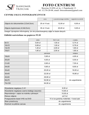 FOTO CENTRUM Skawina 32-050, ul. ks. J. Popiełuszki 13 tel. 12 276-28-08, email: [email protected] CENNIK USŁUG FOTOGRAFICZNYCH cena z powierzonego nośnika nagranie na nośnik Zdjęcia do dokumentów (3,5x4,5cm) 25 zł / 6 szt. 12,00 zł 6,00 zł Zdjęcia dyplomowe (4,5x6,5cm) 35 zł / 8 szt. 20,00 zł 5,00 zł Uwaga! Uprzejmie informujemy, że nie przechowujemy zdjęć w bazie danych. Odbitki naświetlane na papierze FUJI cena Do 5. szt. z opisu 9x13 0,64 zł 1,00 zł 0,74 zł 10x15 0,69 zł 1,00 zł 0,79 zł 13x18 1,40 zł 2,00 zł 1,60 zł 15x21 1,60 zł 2,00 zł 1,80 zł pierwsze kolejne 18x24 5,90 zł 4,90 zł 20x25 6,50 zł 5,50 zł 21x30 8,90 zł 7,50 zł 24x30 9,90 zł 8,90 zł 30x40 20,00 zł 18,00 zł 30x45 22,50 zł 19,90 zł 40x50 29,90 zł 50x70 52,90 zł 70x100 94,90 zł do uzgodnienia Wywołanie negatywu C-41 6,50 zł Wywołanie negatywa czarno-białego (ręcznie) 14,90 zł Reprodukcja + zapis na nośniku cyfrowym 15,00 zł Retusz zdjęcia od 5 zł Przegrywanie kaset VHS na DVD 10 zł za godzinę materiału + koszt płyt Skan przeźroczy do uzgodnienia Wydruki na płótnie canvas do uzgodnienia